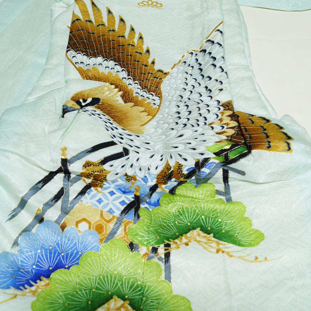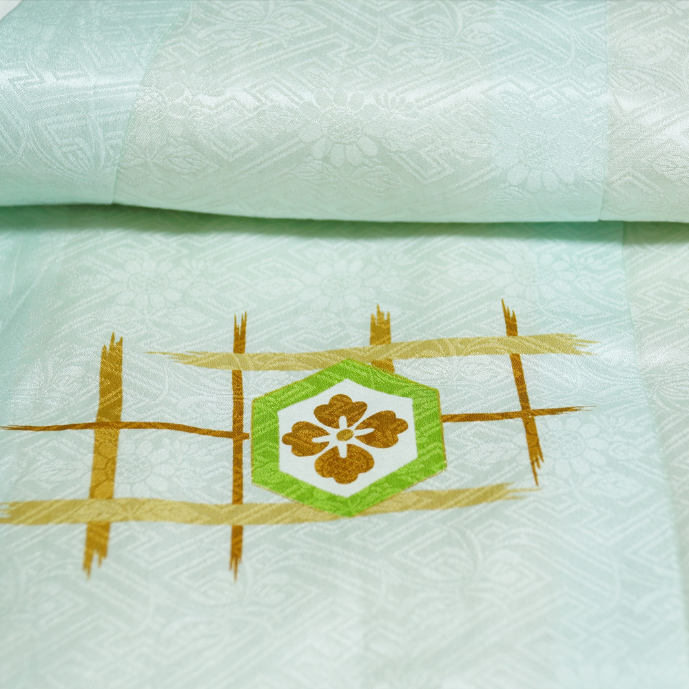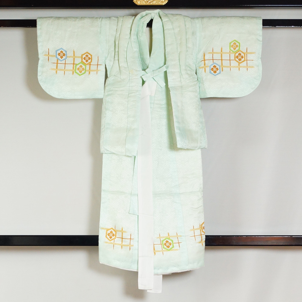 波紗綾型に植物模様の地織が施されたライトシアン色系の地に格子に亀甲花菱模様が染められた男児用の着物と、同生地に鷹模様が施された被布のセットです。 こちらは産着や5歳用着物ではなく、サイズ的に3歳位の男児向けのお着物となります。