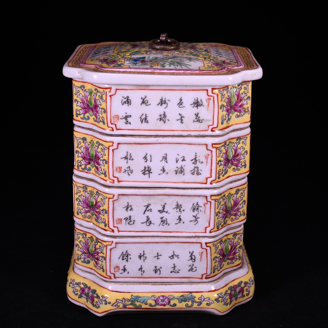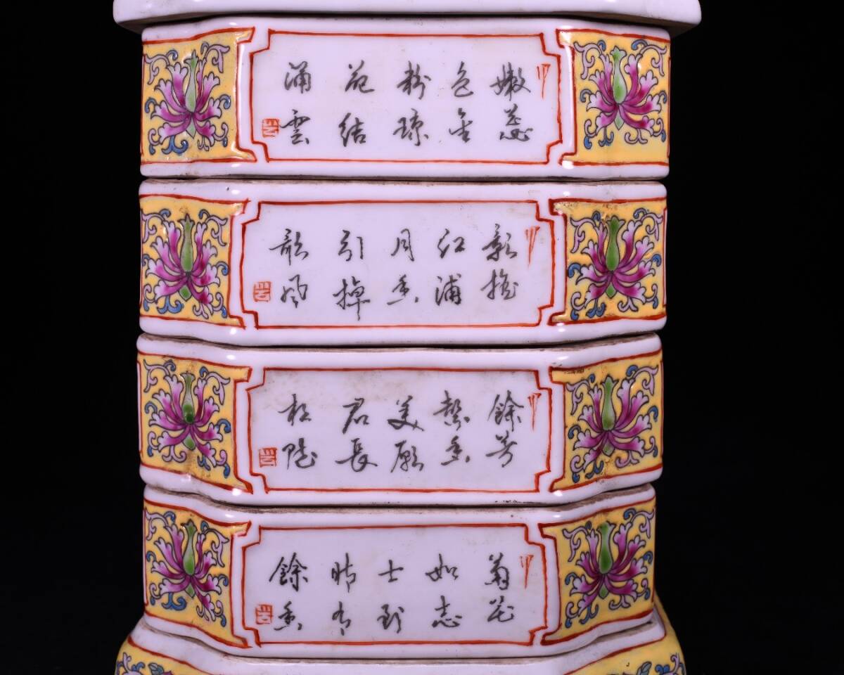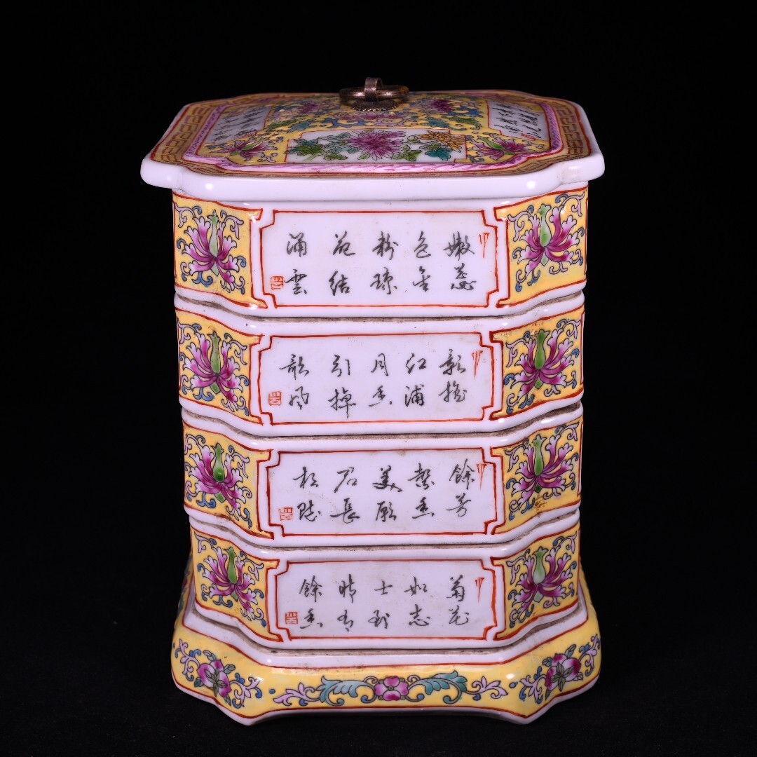 中国磁器 陶芸 磁器『清乾隆粉彩四季花卉銘文紋四格八稜重盒』施釉陶 古代工芸品 陶芸 精美彫 置物 收藏品 | |||