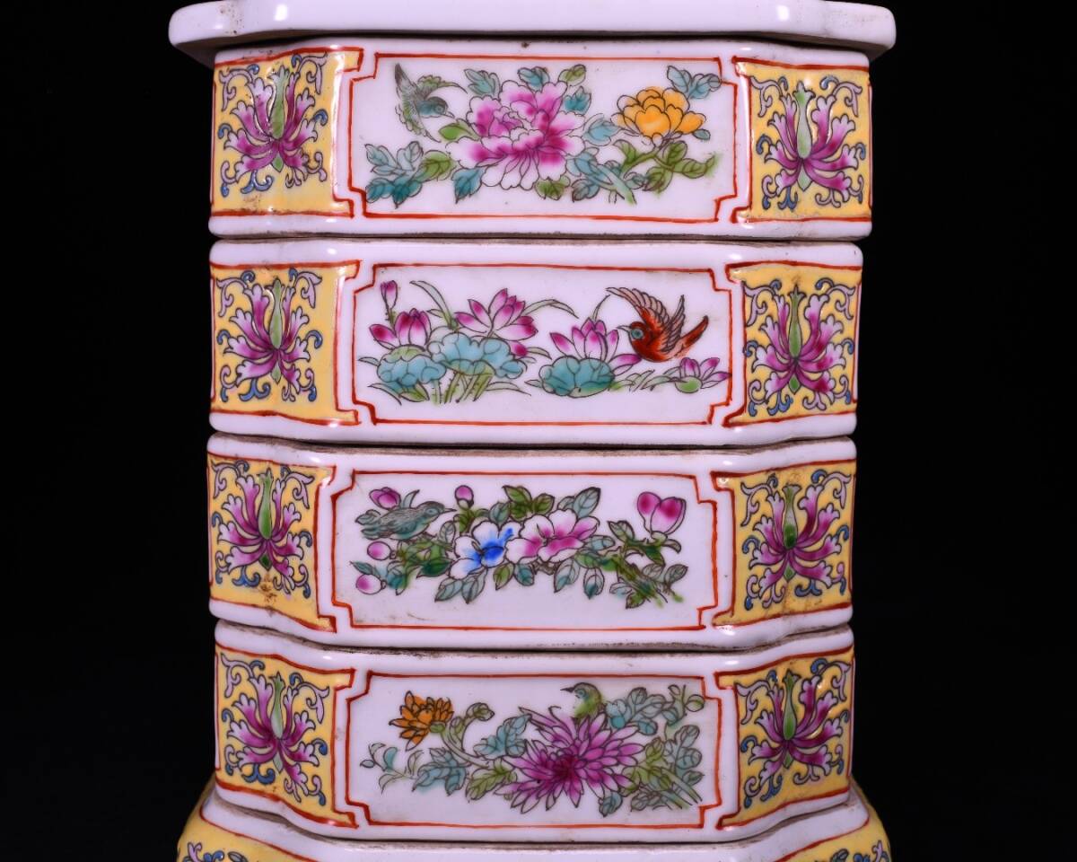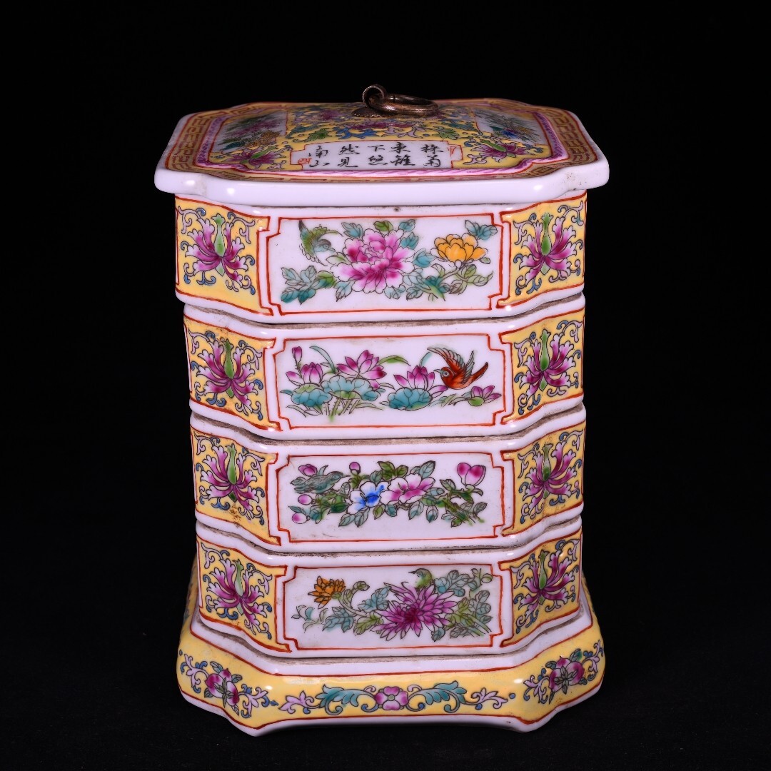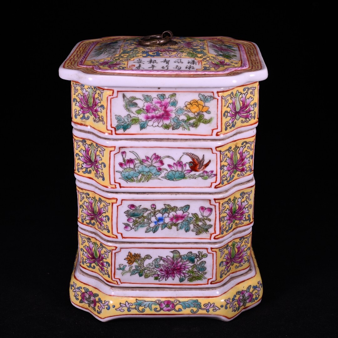 中国磁器 陶芸 磁器『清乾隆粉彩四季花卉銘文紋四格八稜重盒』施釉陶 古代工芸品 陶芸 精美彫 置物 收藏品 | |||