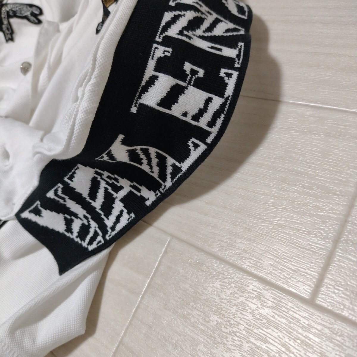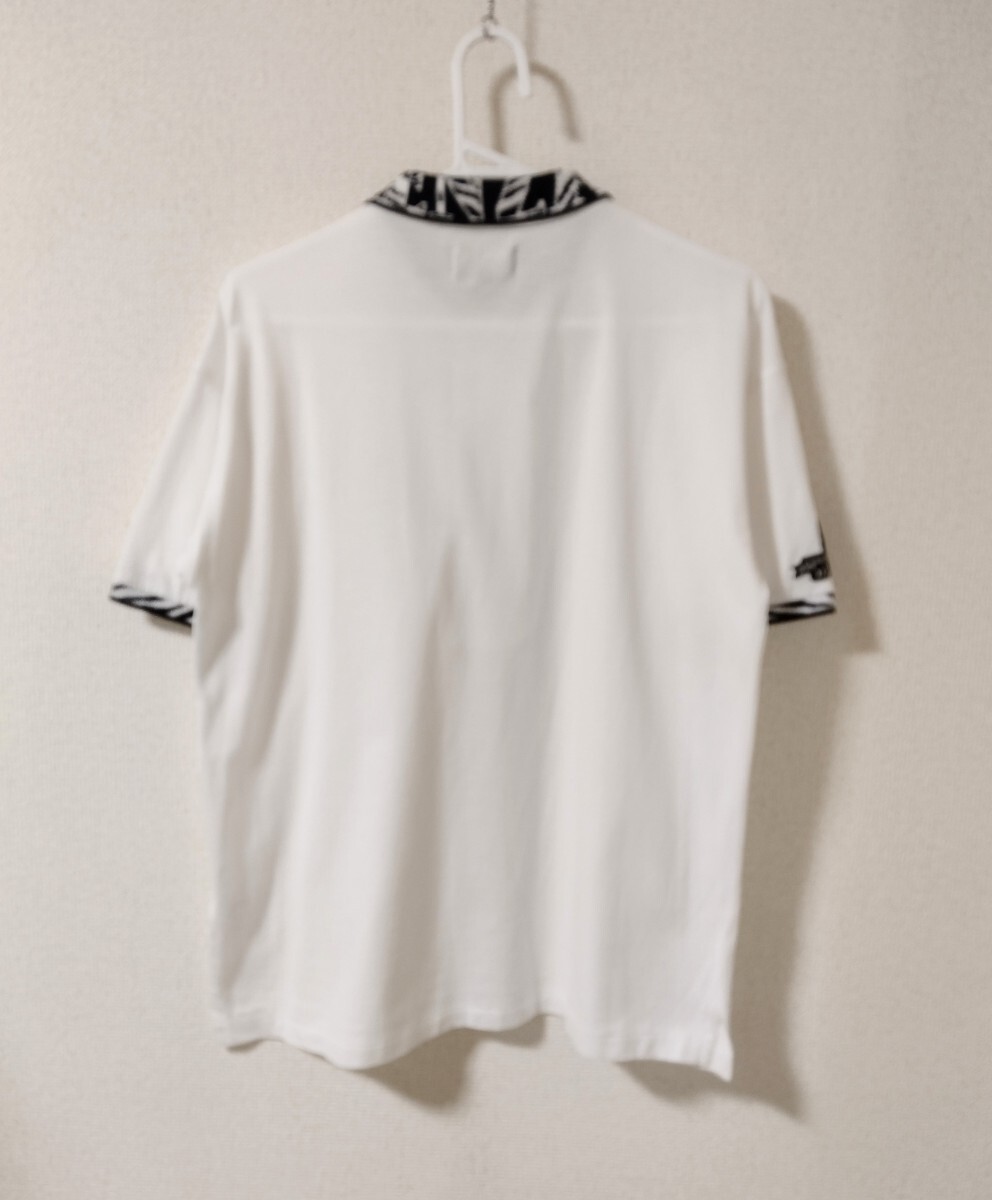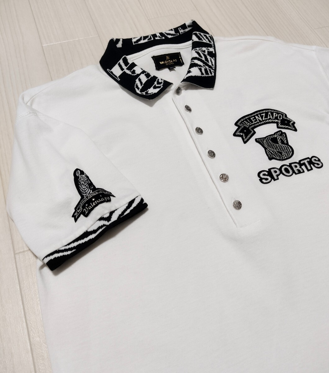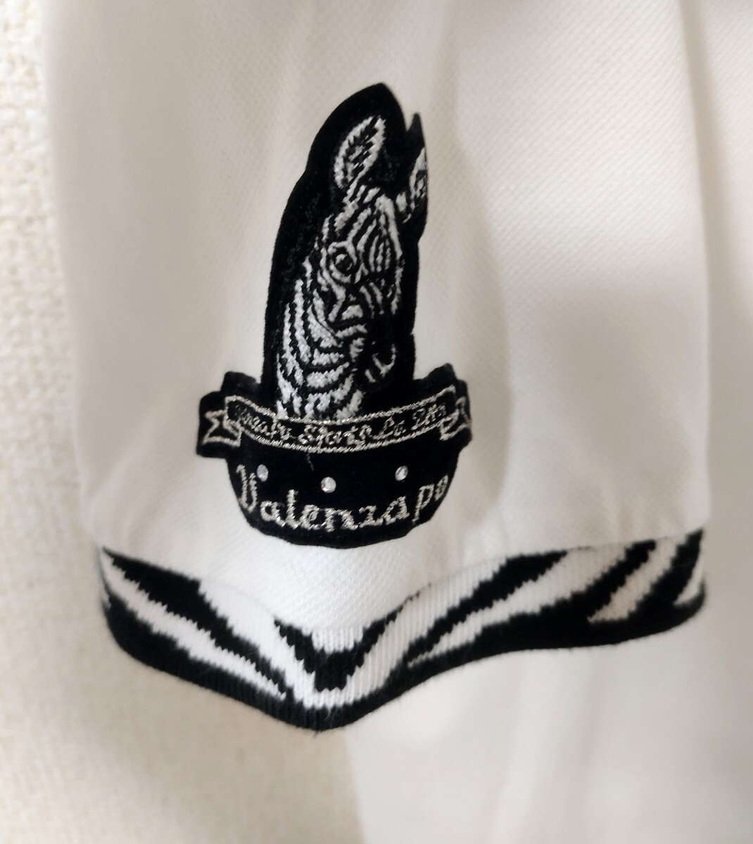 光沢感のある刺繍や、装飾石、フェルトワッペンを用いた豪華な作りが抜群の存在感のあるポロシャツです。また袖口、襟はジャガードになっており、ゼブラ柄をモチーフにしたデザインが細部にまでこだわった作り。