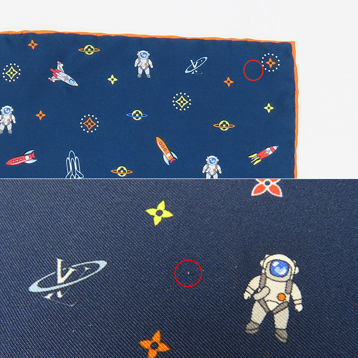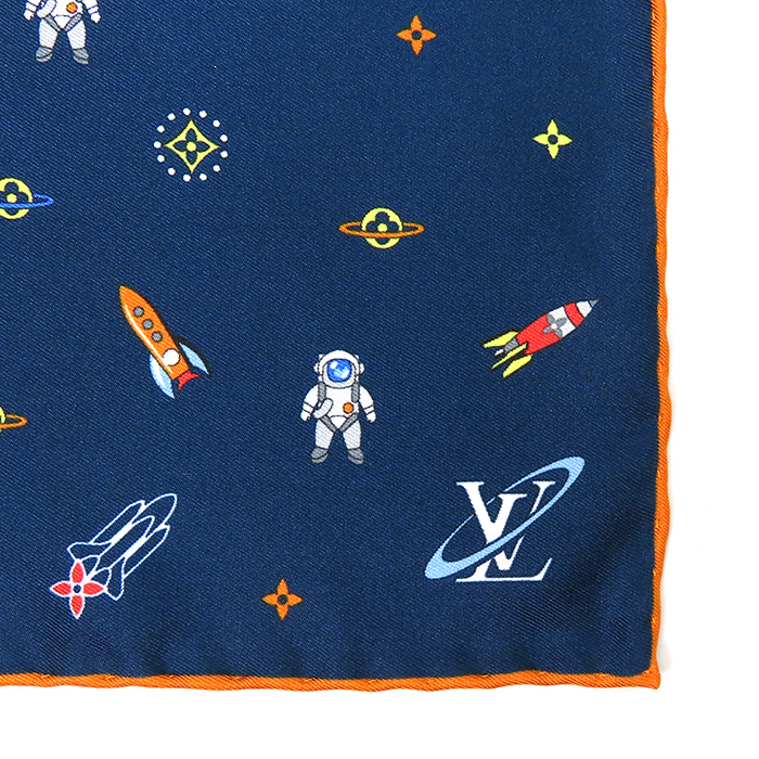 商品説明 | 宇宙服を着た宇宙飛行士やロケット、LVがスペース風に描かれたロゴマークなどが描かれたシルクのポケットチーフです。 |