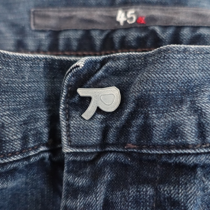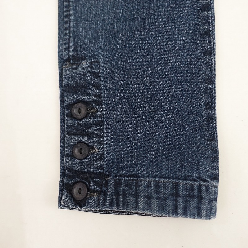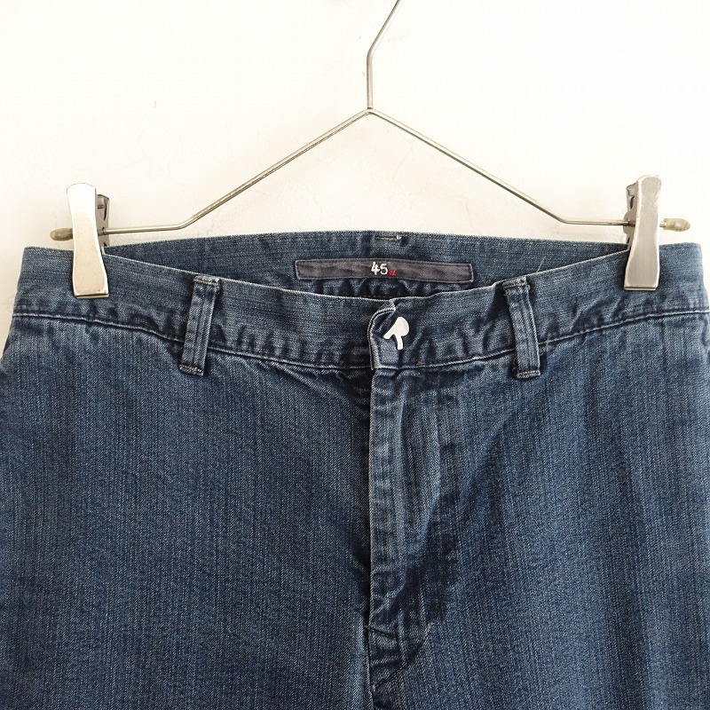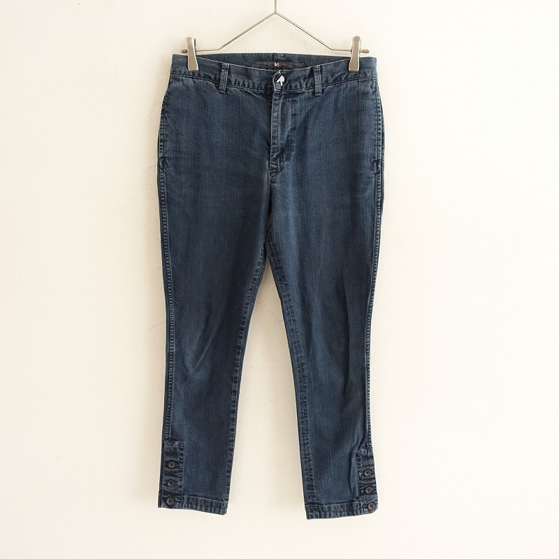 | R45RPMの裾ボタン付きデニムパンツです。カラーはインディゴブルーで、少しストレッチ性のあるデニム地で仕立てられています。開口部はボタンとジッパーで、裾サイドにボタンがあしらわれ、両腰&両ヒップにポケット、Rのワンポイント刺しゅう入りです。 |