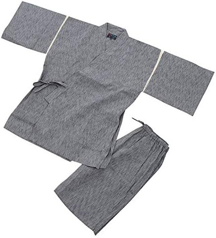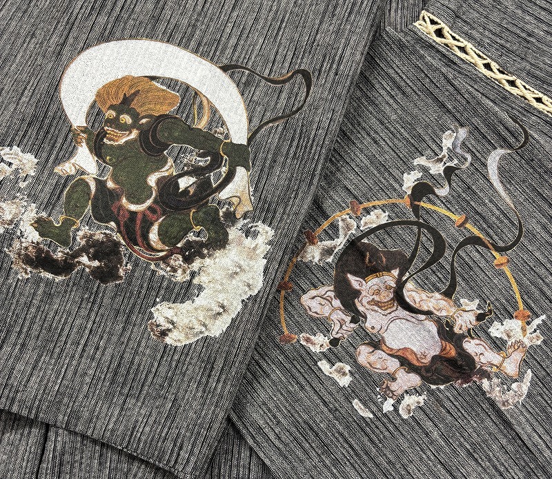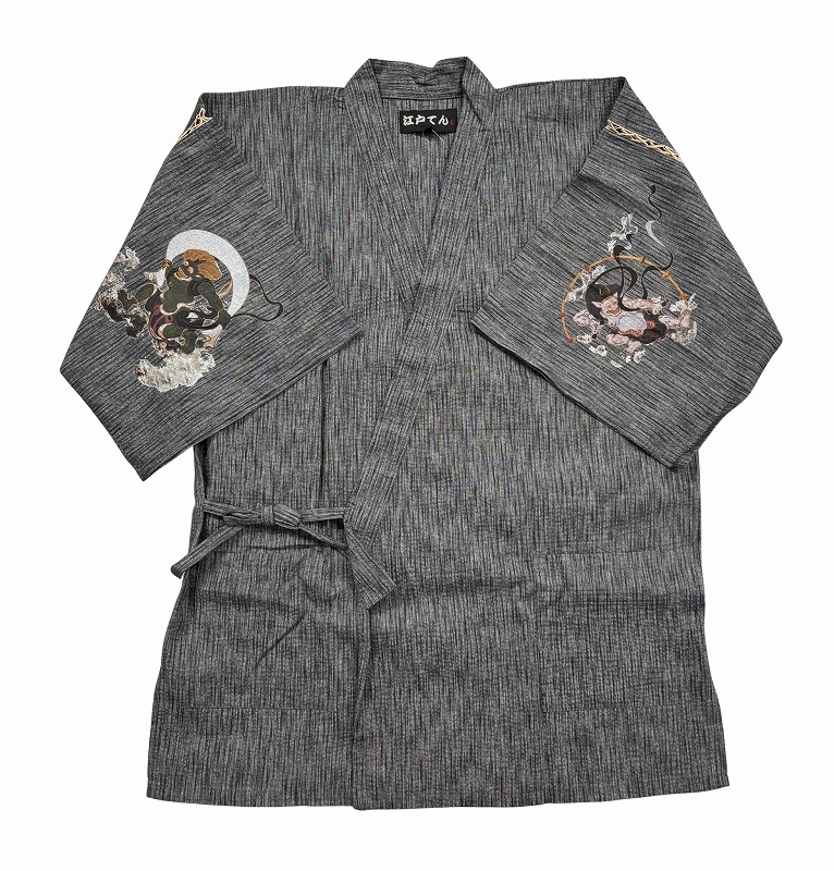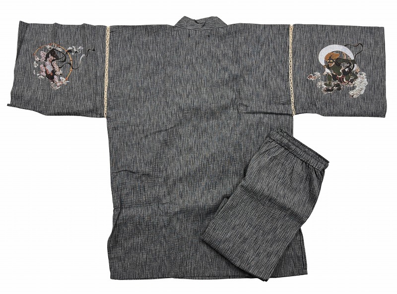 一点物 甚平 しじら織り 綿100% 捺染 袖に風神雷神 Lサイズ ライトグレー