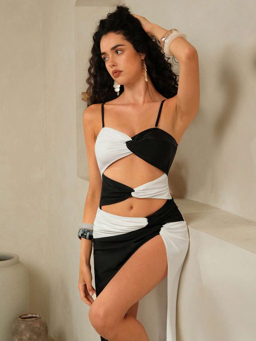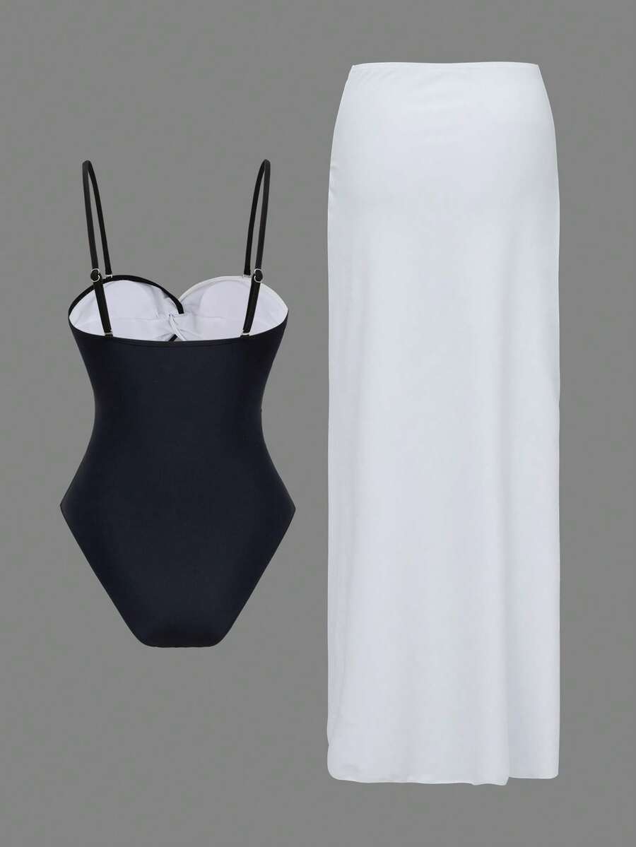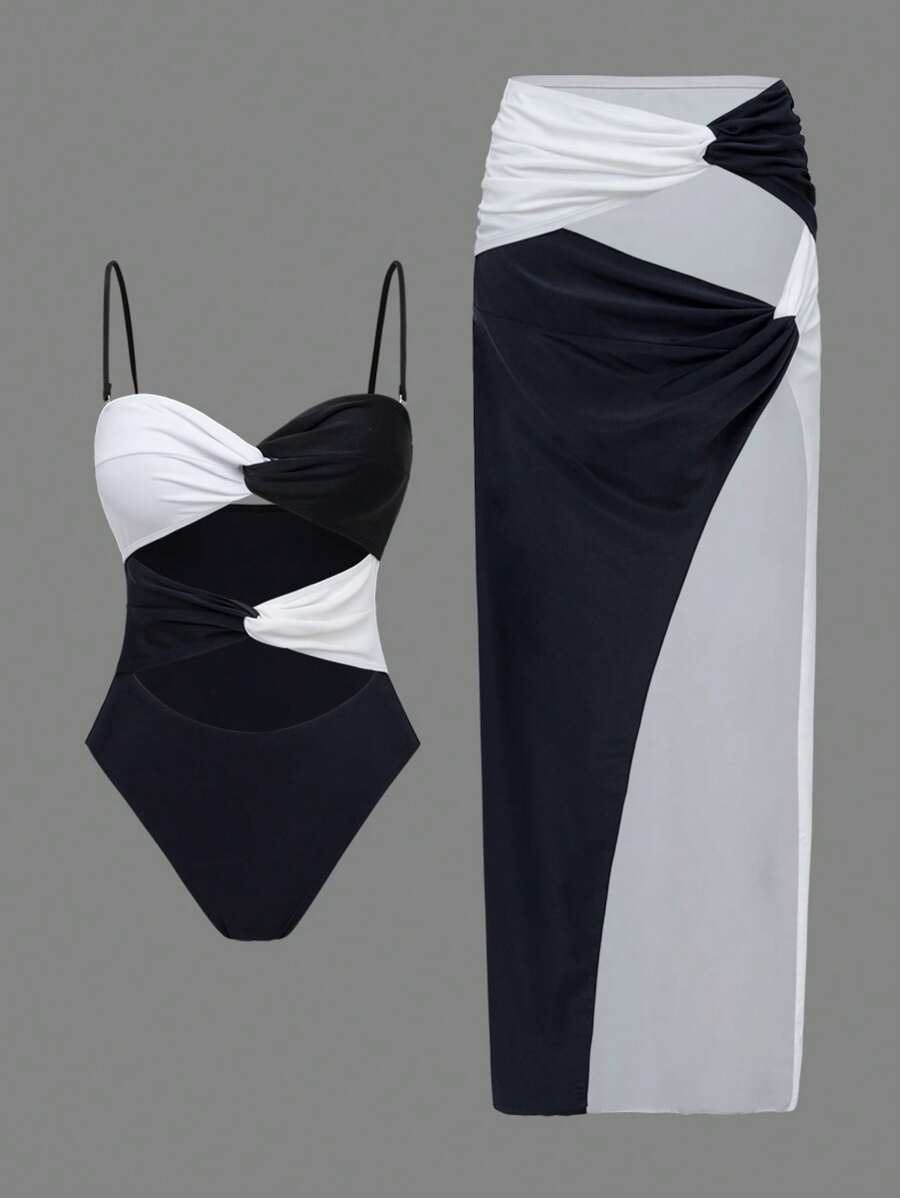 レディース 水着 ワンピース 2枚セット レディース水着 コントラストカラー ツイスト キャミ ミドリフトップ ミニスカート 2ピ