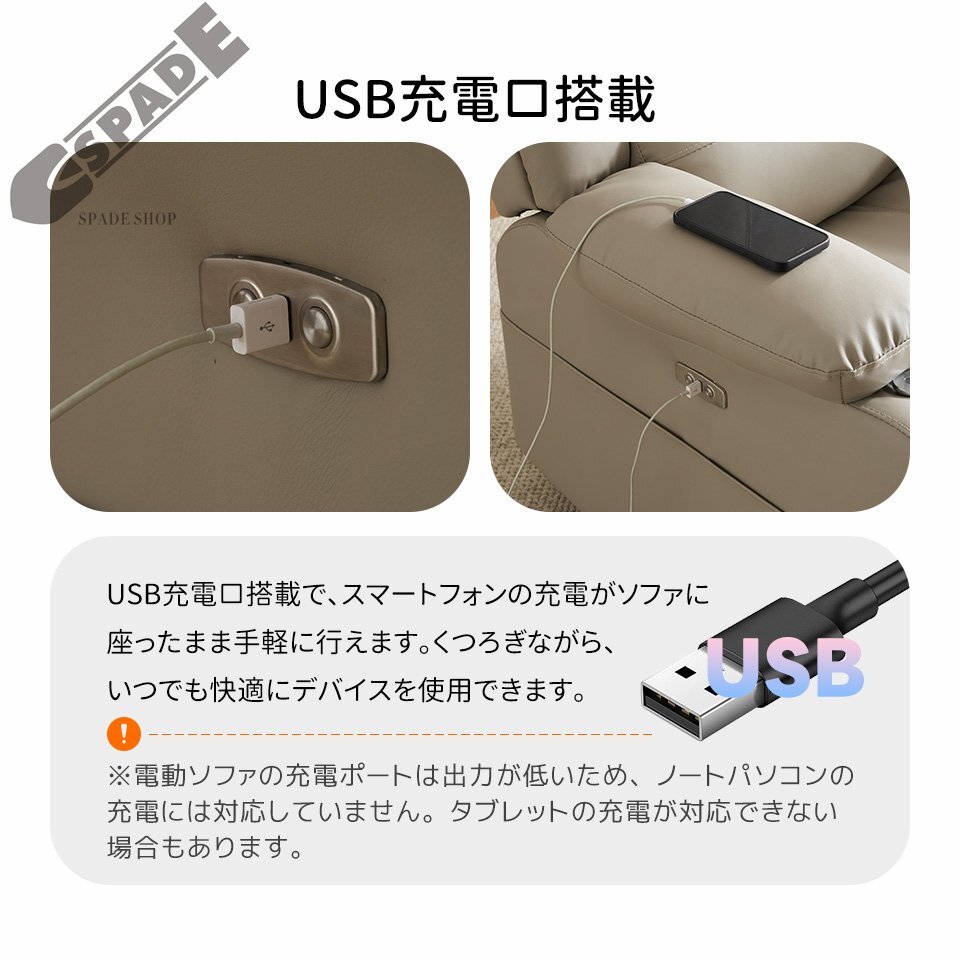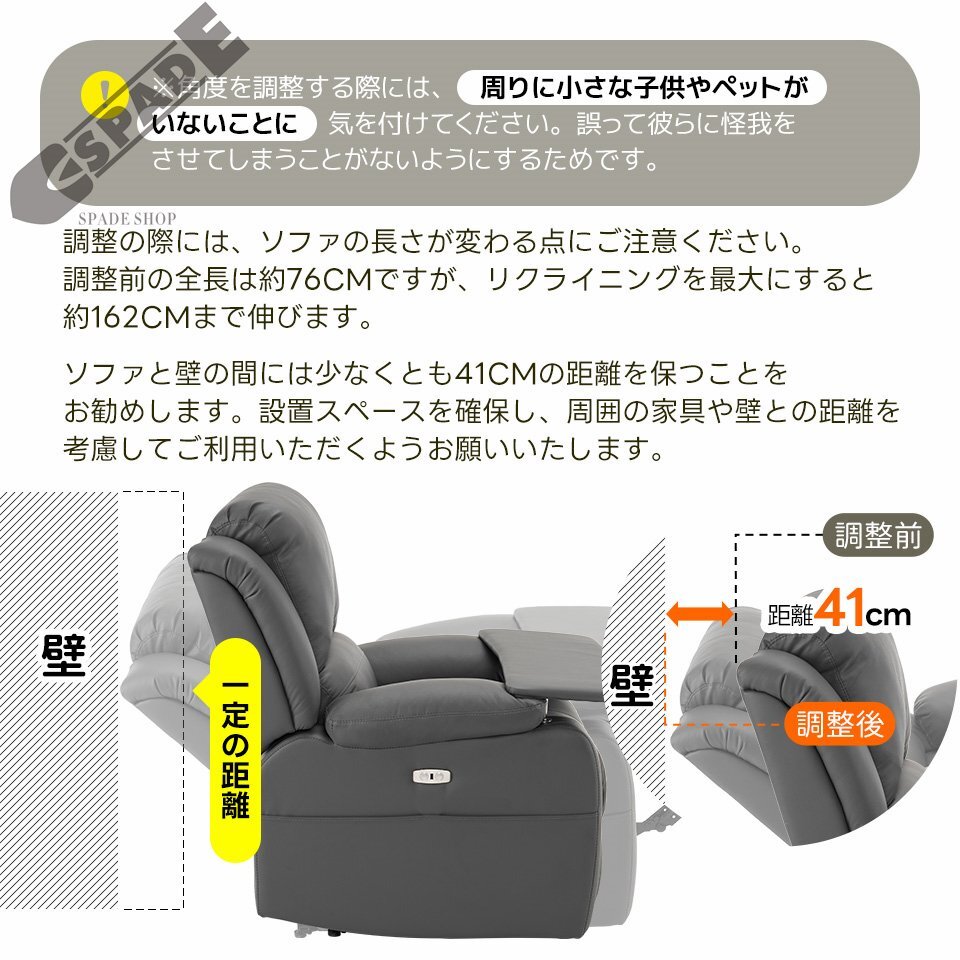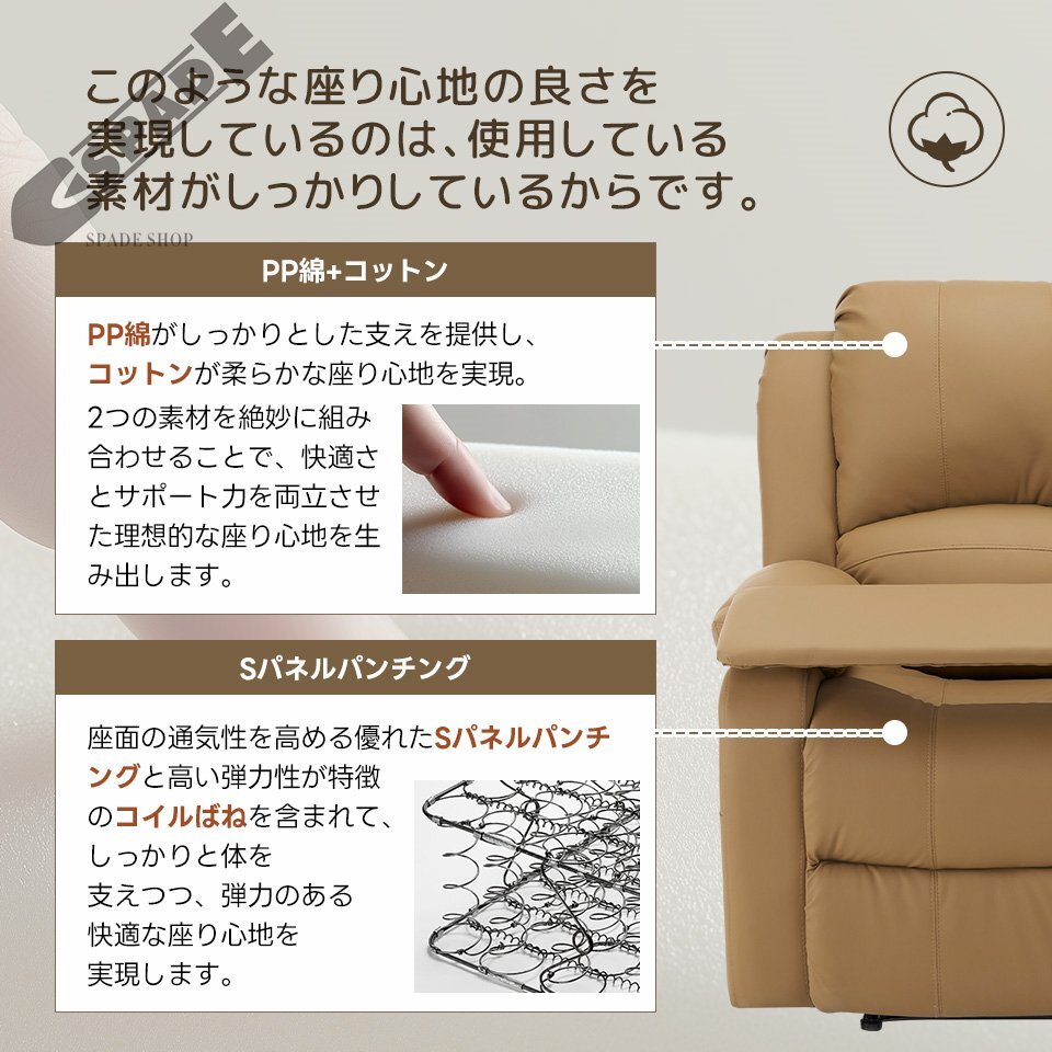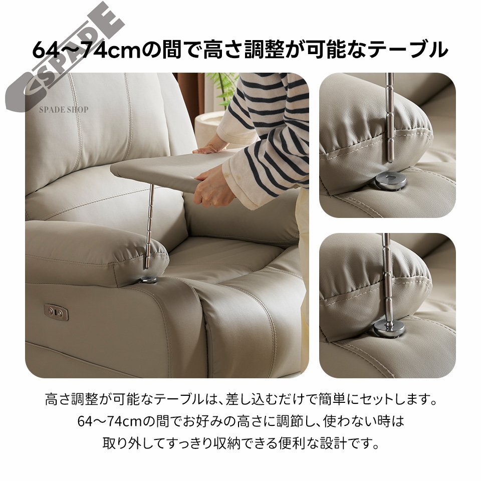 01電動リクライニングソファ たっぷり詰め込まれたふわふわの綿で快適な座り心地。 思わず“沈み込む”ような、極上のリラックス空間。 高さ調整が可能な便利なテーブル付き。 ソファ耐荷重:130kg ◆02 64~74cmの間で高さ調整が可能なテーブル テーブル耐荷重:3kg 高さ調整が可能なテーブルは、差し込むだけで簡単にセットします。64~74cmの間でお好みの高さに調節し、使わない時は取り外してすっきり収納できる便利な設計です。 テーブルは回転式で、用途に合わせて自由に調整可能。仕事や読書、テレビ鑑賞など、シーンに応じて快適にお使いいただけます。 ご注意 1.本を読んだりテレビを見たり、パソコンを使ったりする際は、重すぎる物は避けてください。重い物を置くと、板が曲がる恐れがあります。 2.片側のみ調整可能です。最大角度に調整する際は、テーブルの傾斜にご注意してください。 3.テーブルを使う前に、しっかり固定されているか確認してください。安定しない状態で物を置かないようにご注意してください。 ◆03最大165度無段階調整範囲 サイドボタンで簡単リクライニングが搭載されています。ボタンを押し続けるとリクライニングが始まり、指を離すとその時点の角度で止まります。背もたれとフッドが連動して動くため、スムーズにお好みのリラックス姿勢に調整できます。老若男女問わず気軽にお使いいただけます。 調整の際には、ソファの長さが変わる点にご注意ください。調整前の全長は約76cmですが、リクライニングを最大にすると約162cmまで伸びます。ソファと壁の間には少なくとも41cmの距離を保つことをお勧めします。設置スペースを確保し、周囲の家具や壁との距離を考慮してご利用いただくようお願いいたします。 ※角度を調整する際には、 周りに小さな子供やパットがいないことに気を付けてください。誤って彼らに怪我をさせてしまうことがないようにするためです。 ◆04座る、寝る、楽しくになる 座面 体にフィットするよう設計された座面は、自然に下へ沈み込む構造で、快適さと人体工学に基づいたサポートを両立します。 背もたれ 背もたれはまるでふっくらとしたパンのような形状で、柔らかく体を包み込みます。 フットレスト フットレストをしっかり支えることで、全身がリラックスできる構造です。 このような座り心地の良さを実現しているのは、使用している素材がしっかりしているからです。 PP綿がしっかりとした支えを提供し、コットンが柔らかな座り心地を実現。2つの素材を絶妙に組み合わせることで、快適さとサポート力を両立させた理想的な座り心地を生み出します。 座面の通気性を高める優れたSパネルパンチングと高い弾力性が特徴のコイルばねを含まれて、しっかりと体を支えつつ、弾力のある快適な座り心地を実現します。 ◆05包み込まれる柔らかく心地 体の部位ごとに最適な曲線と柔性を設計し、全方位て 身体によりフイットする圧カ分散を実現します。 座っても、寝転んでも、頭から足先まで至高の快適です。 ◆06USB充電口搭載 USB充電口搭載で、スマートフォンの充電がソファに座ったまま手軽に行えます。くつろぎながら、いつでも快適にデバイスを使用できます。 ※電動ソファの充電ポートは出力が低いため、ノートパソコンの充電には対応していません。タブレットの充電が対応できない場合もあります。 ◆07便利なサイドポケット 便利なサイドポケットが付いています。ソファの側面に配置されており、リモコンやスマートフォン、本や雑誌などの小物を収納するのにぴったりです。 ◆08電源収納スペース コードを使わないときは、裏のカバーをめ<れば中に収納ができます。 マジックテープ式ですのでめくれる心配もありません。 ご注意 ケーブルがフレームむに圧迫されて折れる可能性がごさいますので、 白い結束パンドを外しないでください。そのままご使用いただけますようお願い申し上げます。