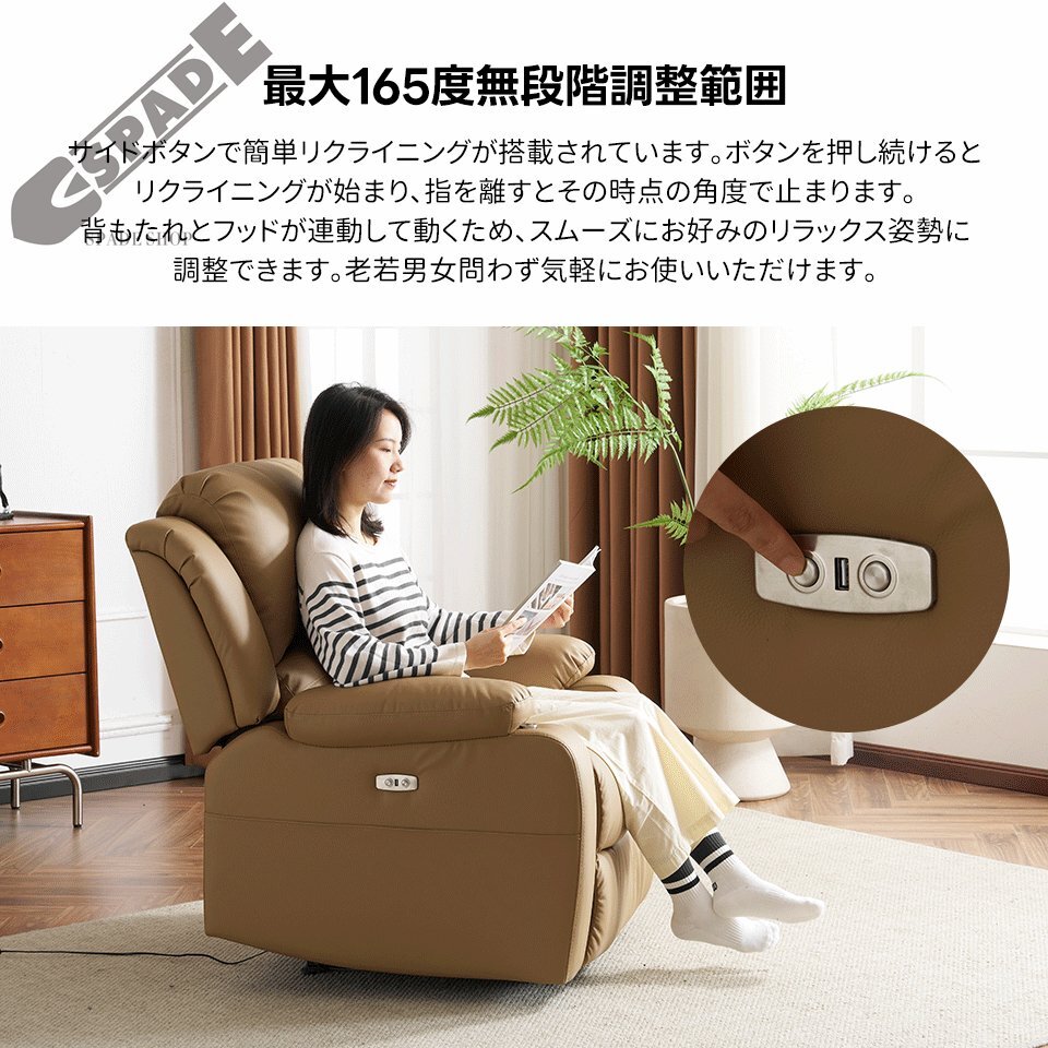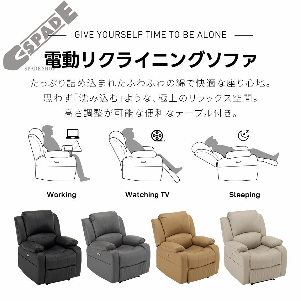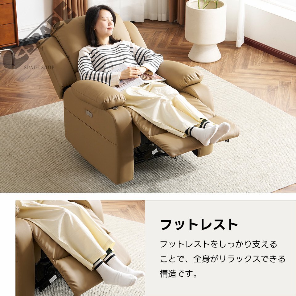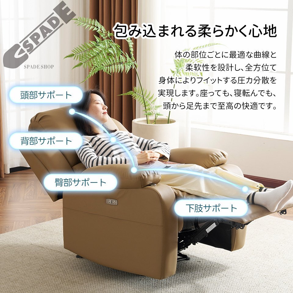 01電動リクライニングソファ たっぷり詰め込まれたふわふわの綿で快適な座り心地。 思わず“沈み込む”ような、極上のリラックス空間。 高さ調整が可能な便利なテーブル付き。 ソファ耐荷重:130kg ◆02 64~74cmの間で高さ調整が可能なテーブル テーブル耐荷重:3kg 高さ調整が可能なテーブルは、差し込むだけで簡単にセットします。64~74cmの間でお好みの高さに調節し、使わない時は取り外してすっきり収納できる便利な設計です。 テーブルは回転式で、用途に合わせて自由に調整可能。仕事や読書、テレビ鑑賞など、シーンに応じて快適にお使いいただけます。 ご注意 1.本を読んだりテレビを見たり、パソコンを使ったりする際は、重すぎる物は避けてください。重い物を置くと、板が曲がる恐れがあります。 2.片側のみ調整可能です。最大角度に調整する際は、テーブルの傾斜にご注意してください。 3.テーブルを使う前に、しっかり固定されているか確認してください。安定しない状態で物を置かないようにご注意してください。 ◆03最大165度無段階調整範囲 サイドボタンで簡単リクライニングが搭載されています。ボタンを押し続けるとリクライニングが始まり、指を離すとその時点の角度で止まります。背もたれとフッドが連動して動くため、スムーズにお好みのリラックス姿勢に調整できます。老若男女問わず気軽にお使いいただけます。 調整の際には、ソファの長さが変わる点にご注意ください。調整前の全長は約76cmですが、リクライニングを最大にすると約162cmまで伸びます。ソファと壁の間には少なくとも41cmの距離を保つことをお勧めします。設置スペースを確保し、周囲の家具や壁との距離を考慮してご利用いただくようお願いいたします。 ※角度を調整する際には、 周りに小さな子供やパットがいないことに気を付けてください。誤って彼らに怪我をさせてしまうことがないようにするためです。 ◆04座る、寝る、楽しくになる 座面 体にフィットするよう設計された座面は、自然に下へ沈み込む構造で、快適さと人体工学に基づいたサポートを両立します。 背もたれ 背もたれはまるでふっくらとしたパンのような形状で、柔らかく体を包み込みます。 フットレスト フットレストをしっかり支えることで、全身がリラックスできる構造です。 このような座り心地の良さを実現しているのは、使用している素材がしっかりしているからです。 PP綿がしっかりとした支えを提供し、コットンが柔らかな座り心地を実現。2つの素材を絶妙に組み合わせることで、快適さとサポート力を両立させた理想的な座り心地を生み出します。 座面の通気性を高める優れたSパネルパンチングと高い弾力性が特徴のコイルばねを含まれて、しっかりと体を支えつつ、弾力のある快適な座り心地を実現します。 ◆05包み込まれる柔らかく心地 体の部位ごとに最適な曲線と柔性を設計し、全方位て 身体によりフイットする圧カ分散を実現します。 座っても、寝転んでも、頭から足先まで至高の快適です。 ◆06USB充電口搭載 USB充電口搭載で、スマートフォンの充電がソファに座ったまま手軽に行えます。くつろぎながら、いつでも快適にデバイスを使用できます。 ※電動ソファの充電ポートは出力が低いため、ノートパソコンの充電には対応していません。タブレットの充電が対応できない場合もあります。 ◆07便利なサイドポケット 便利なサイドポケットが付いています。ソファの側面に配置されており、リモコンやスマートフォン、本や雑誌などの小物を収納するのにぴったりです。 ◆08電源収納スペース コードを使わないときは、裏のカバーをめ<れば中に収納ができます。 マジックテープ式ですのでめくれる心配もありません。 ご注意 ケーブルがフレームむに圧迫されて折れる可能性がごさいますので、 白い結束パンドを外しないでください。そのままご使用いただけますようお願い申し上げます。