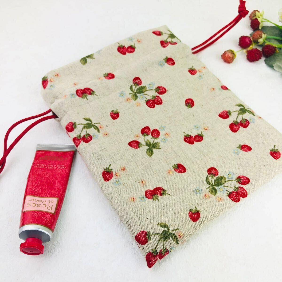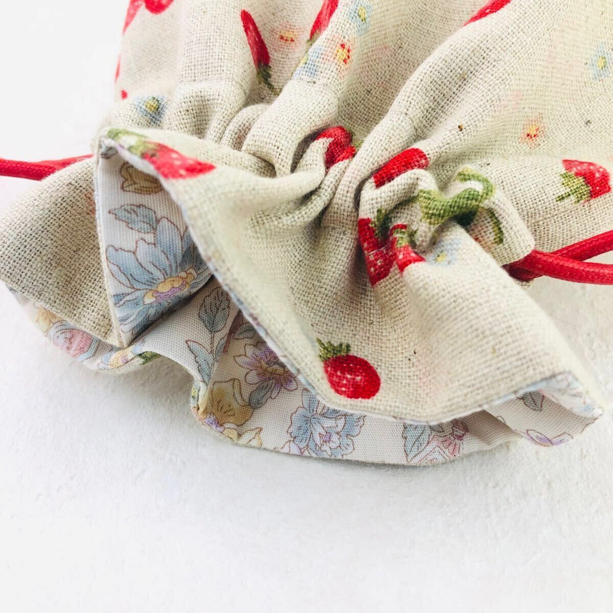 いちご 裏地付き フリル巾着 ハンドメイド イチゴ 巾着 ナチュラル コットンリネン 巾着袋 給食袋