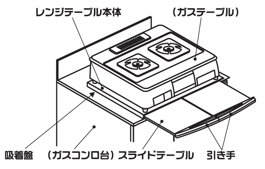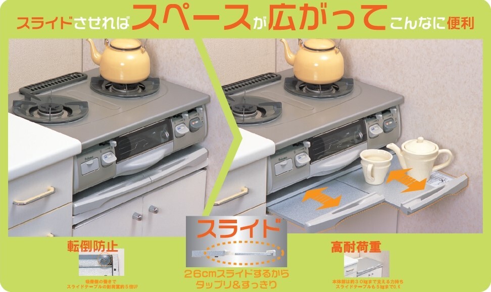 スライドテーブルは26cm引き出すことができるので、調味料や小皿が置くことができます。 |