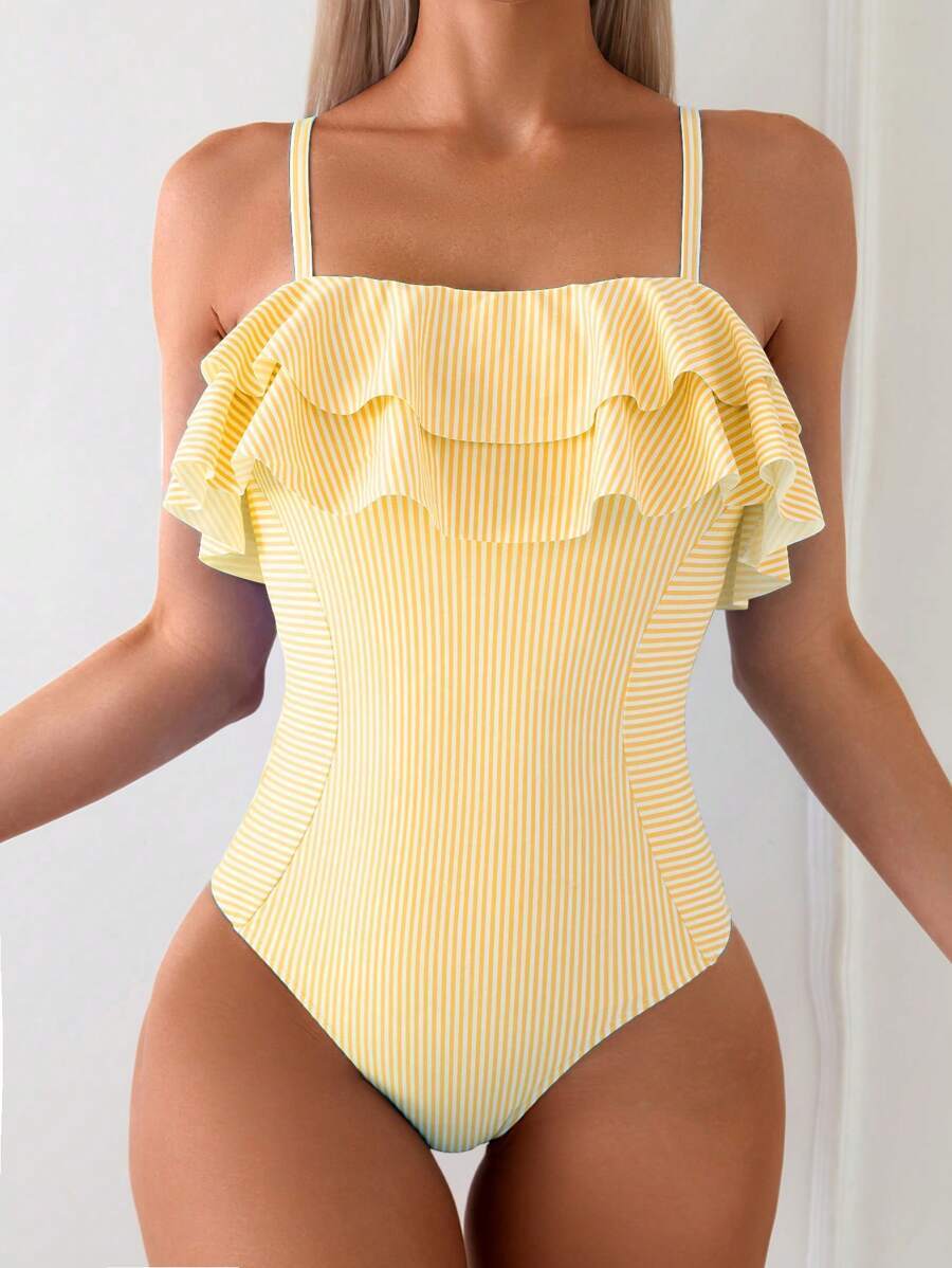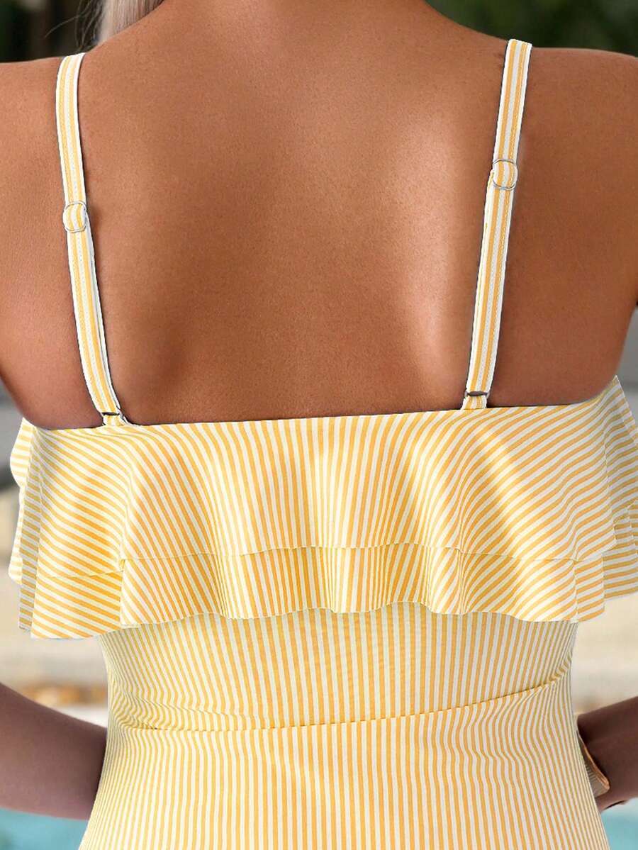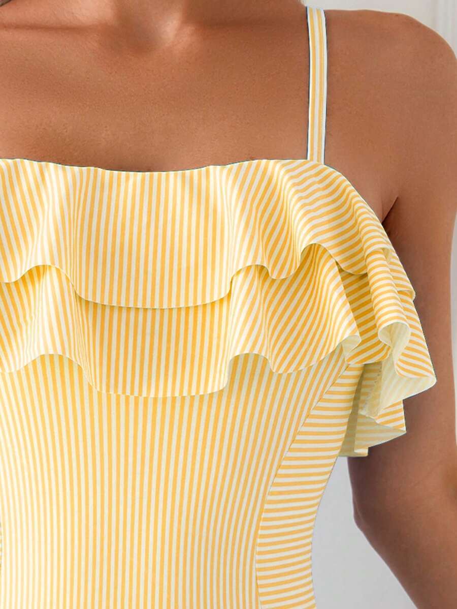 レディース 水着 ワンピース 女性用 カジュアル ビーチ バケーション 二重層 フリル ストライプ ランダムプリント ワンピース水