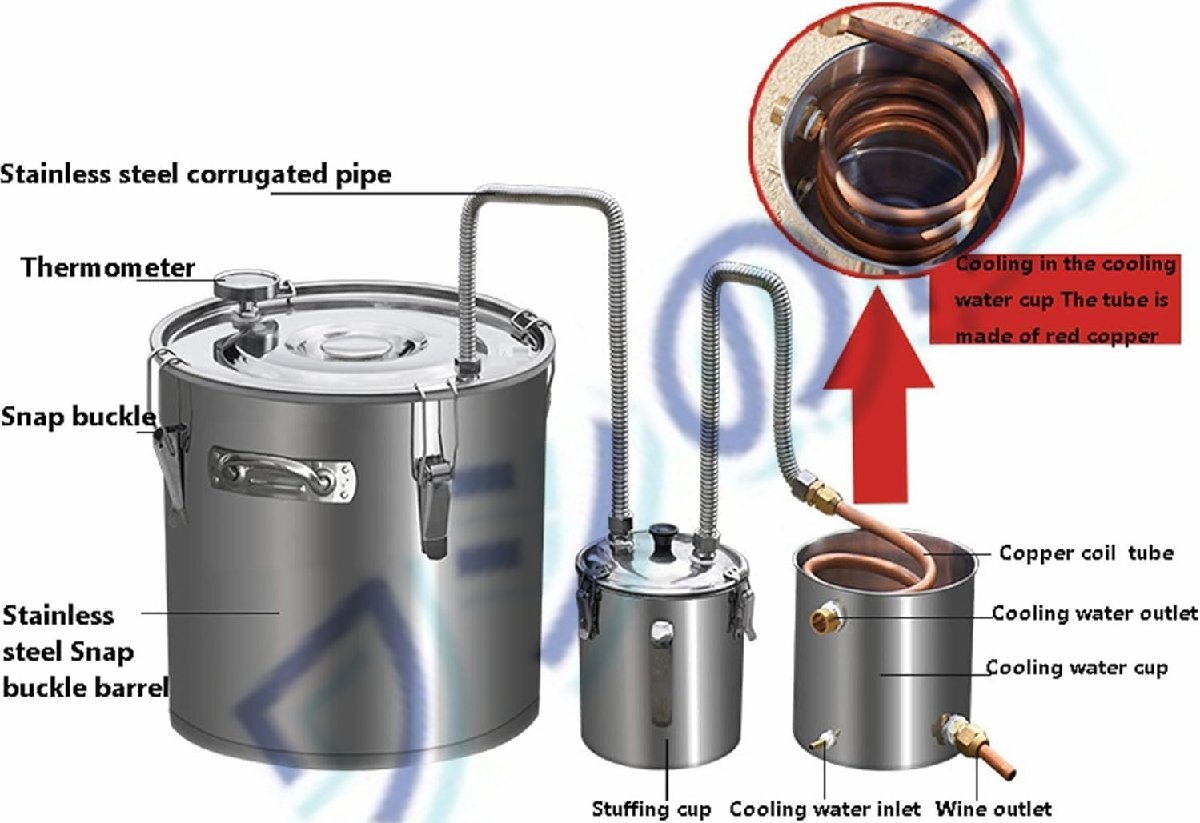 *多目的使用法:密造酒の使用方法はさまざまです。家庭用蒸留器は、海水蒸留、蒸気蒸留、アルコールの蒸留に使用できます。お好みに応じて、密造酒の蒸留器でさまざまな種類のアイテムを作成できます。アルコール、エタノール、ウイスキー、水蒸留器、ワイン製造、エッセンシャルオイル、ハイドロソルなど