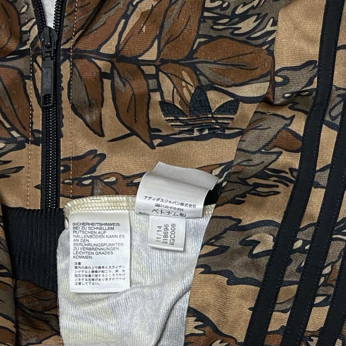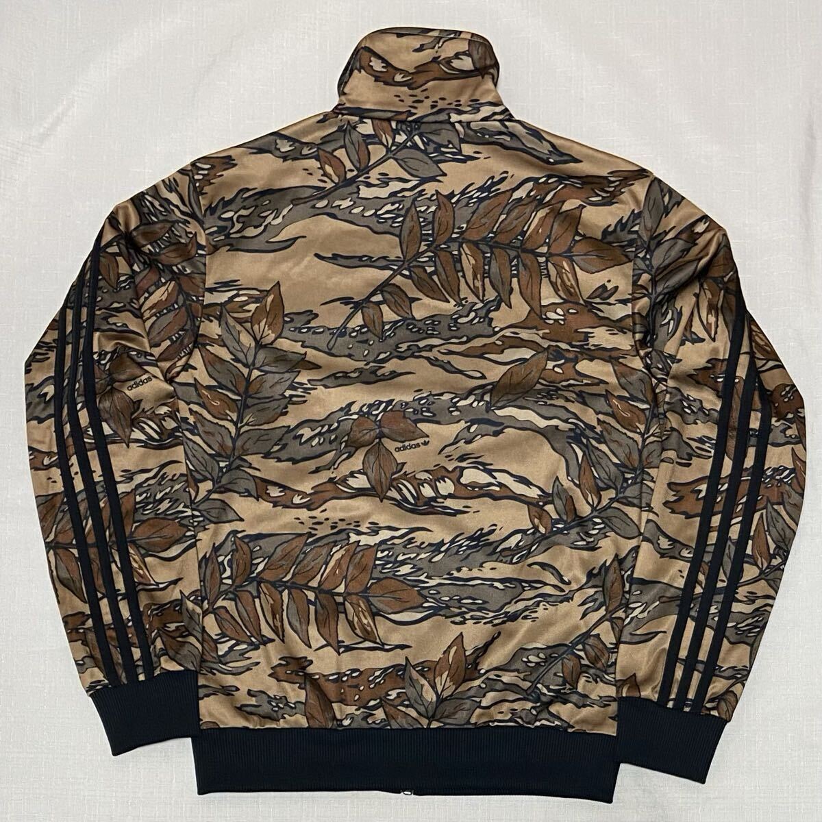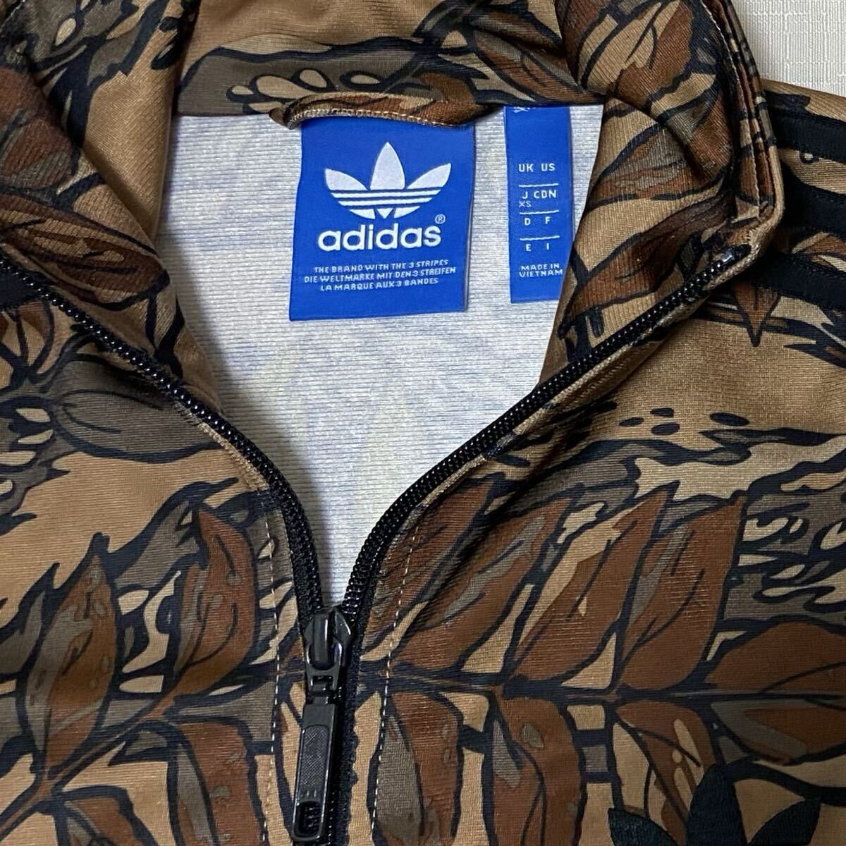 adidas アディダス オリジナルスの迷彩柄(カモフラージュ、リアルツリーカモ、総柄)のトレフォイルロゴのデカロゴのフルジップのジャージ(ファイヤーバードトラックトップ、トラックジャケット)のサイズXSです。