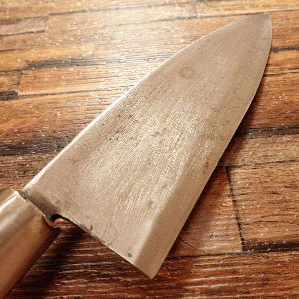 出刃包丁は魚をさばくのに特化した和包丁です。このお品は片刃のハガネ製で、刃厚はあるんですが、すぐにぐっと細くなっているような形状で、肉抜きを多くしたような全体としては細身な出刃包丁です。そのままお仕上げして研ぎあげております。