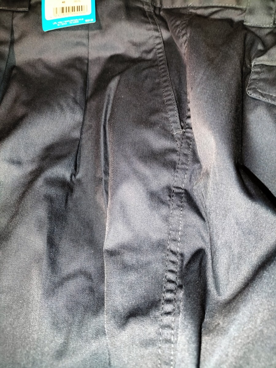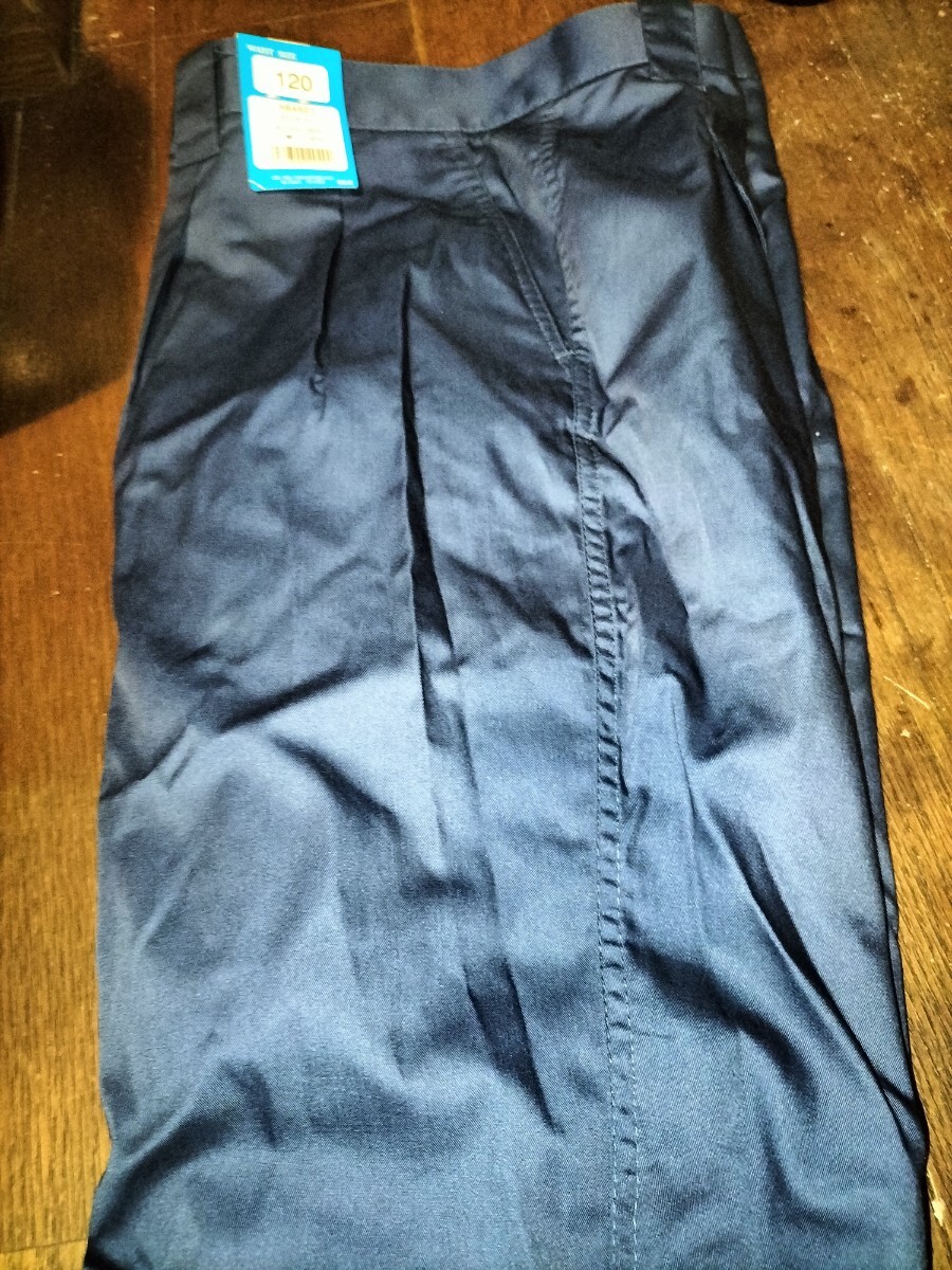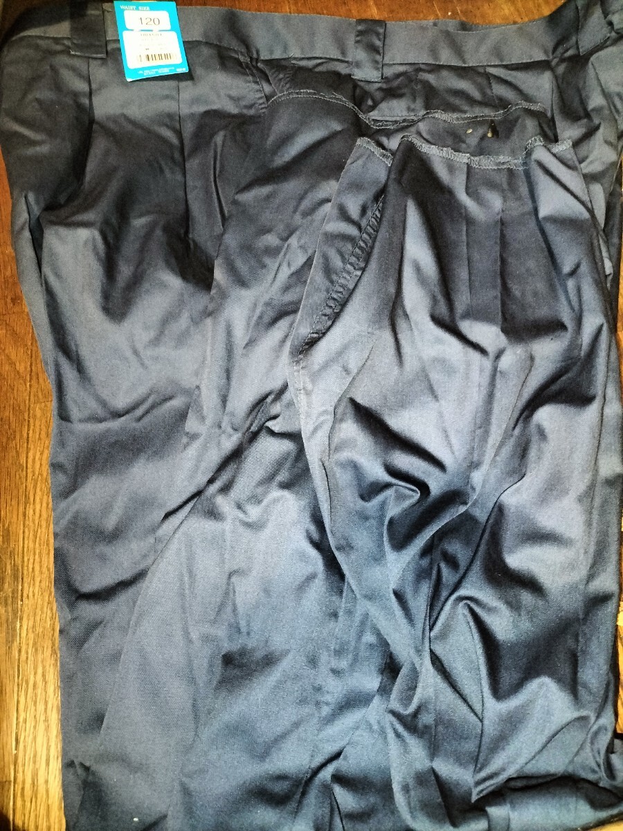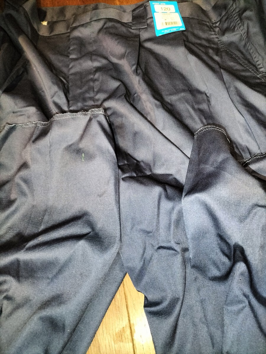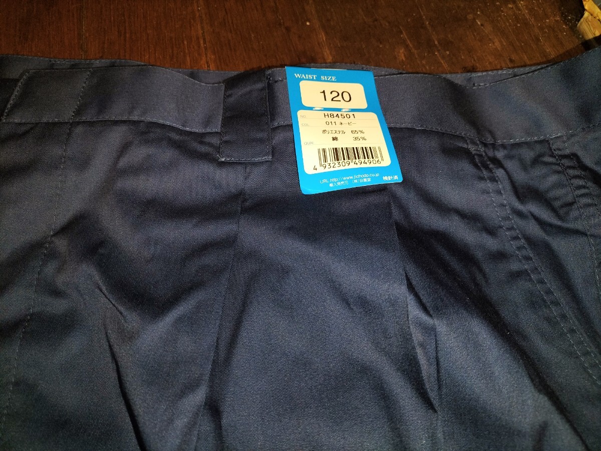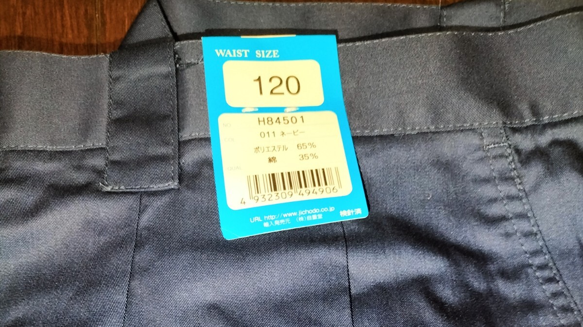 ウエストサイズ120、股下丈90ハーフ(裾加工していません)、ポリエステル65、綿35%。