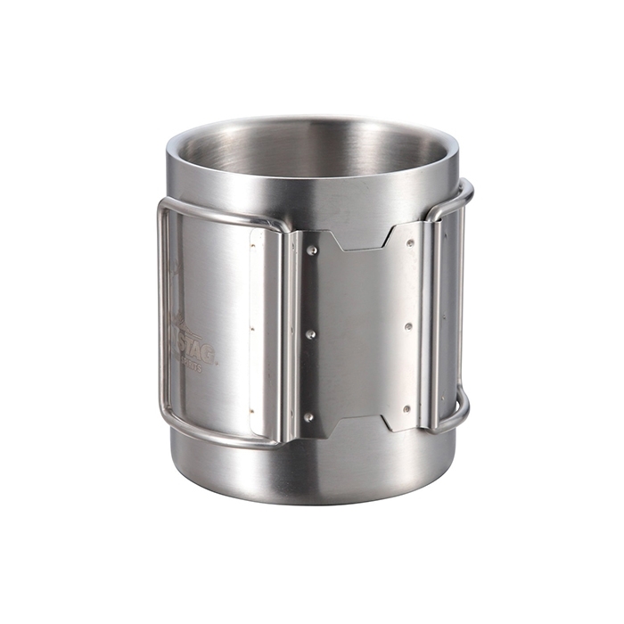 | 中空二重構造で冷めにくいステンレス製マグカップ。 ハンドルは折りたたみ可能。 |