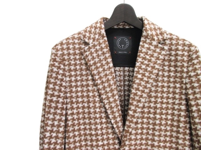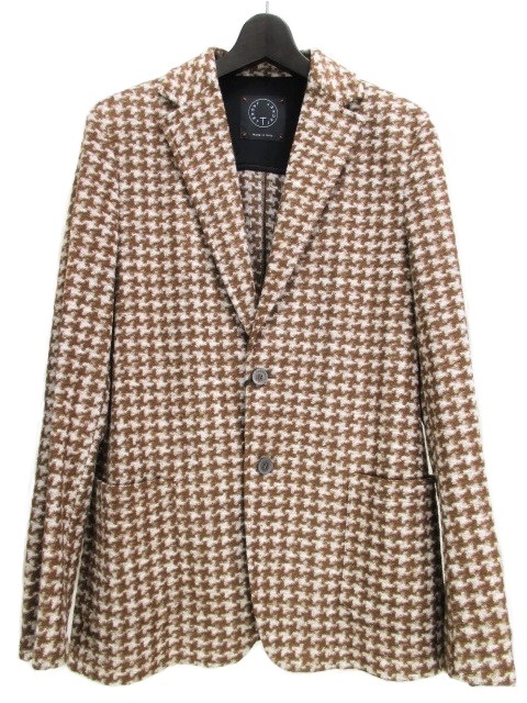 イタリアサルト界の巨匠レンゾ・トネッロ氏が立ち上げたイタリア重衣料ブランド「TONELLO(トネッロ)」が、テーラリングの確かなジャケットをTシャツ感覚で手軽に楽しめるようにと立ち上げた新コンセプトレーベル「T-JACKET(ティージャケット)」のイタリア製 茶/白 千鳥ニットジャケットです。