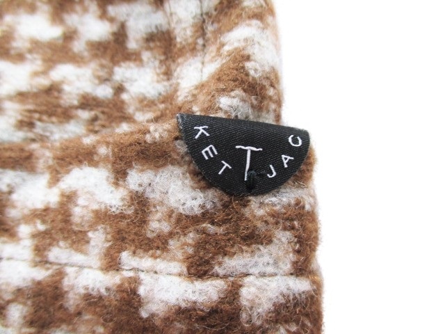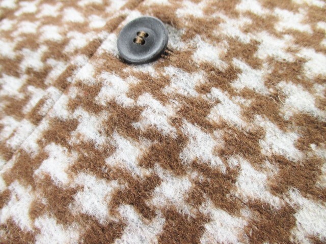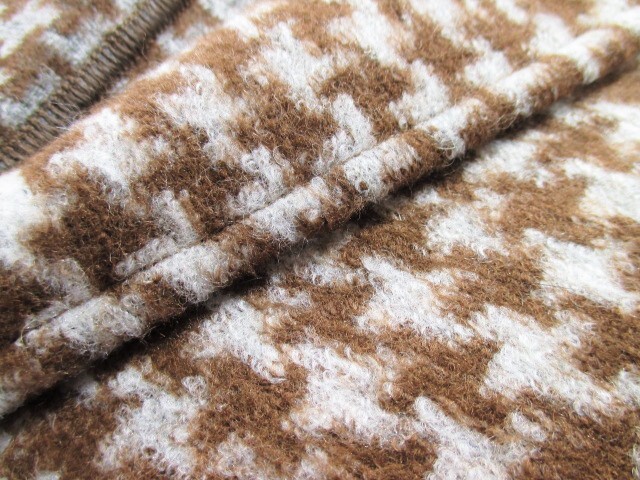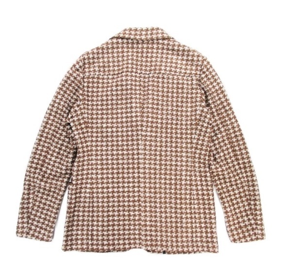 千鳥柄によるクラシカルで上品な大人感がありながら、濃すぎないブラウンに白の配色・ニット生地によって、どこか優し気な雰囲気もあるようなジャケットです。