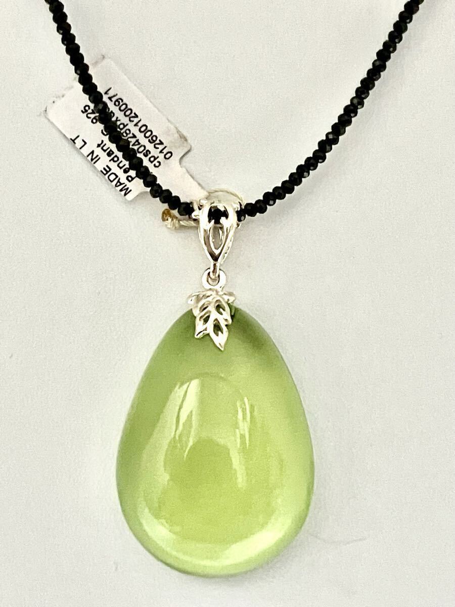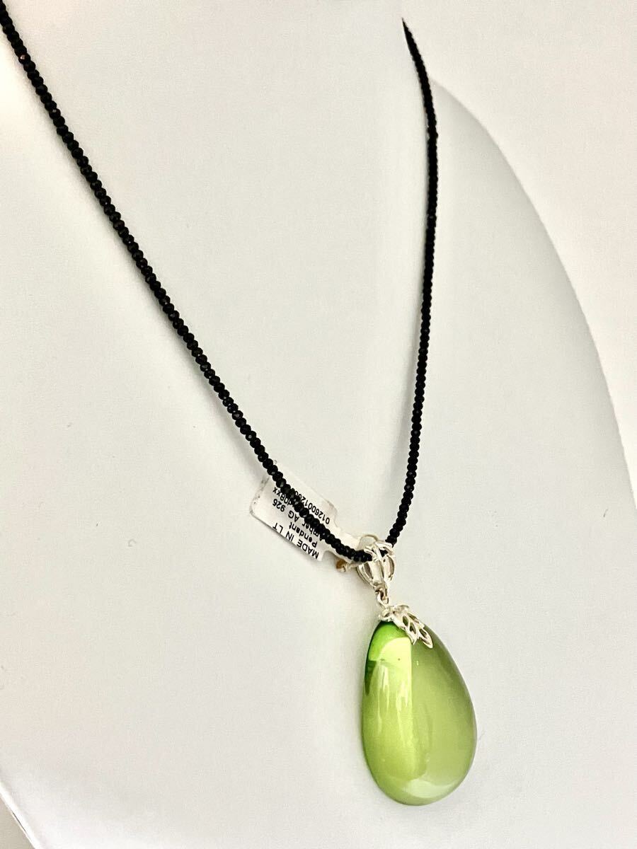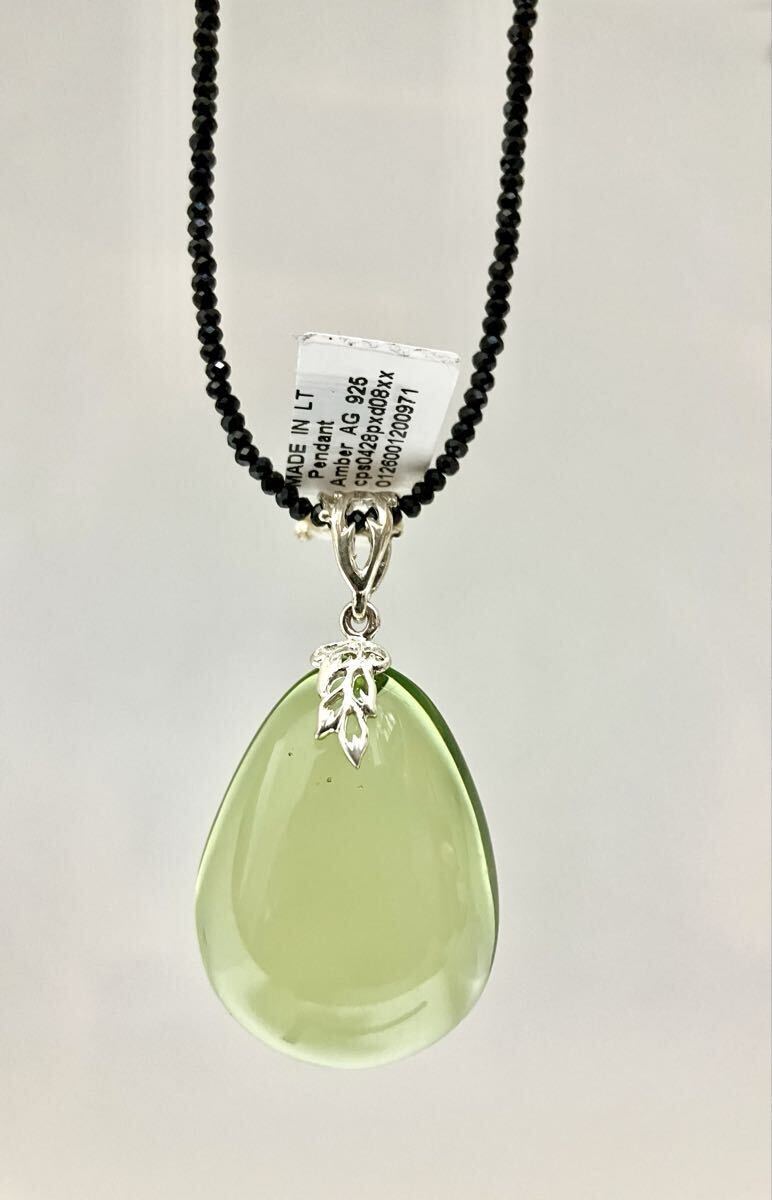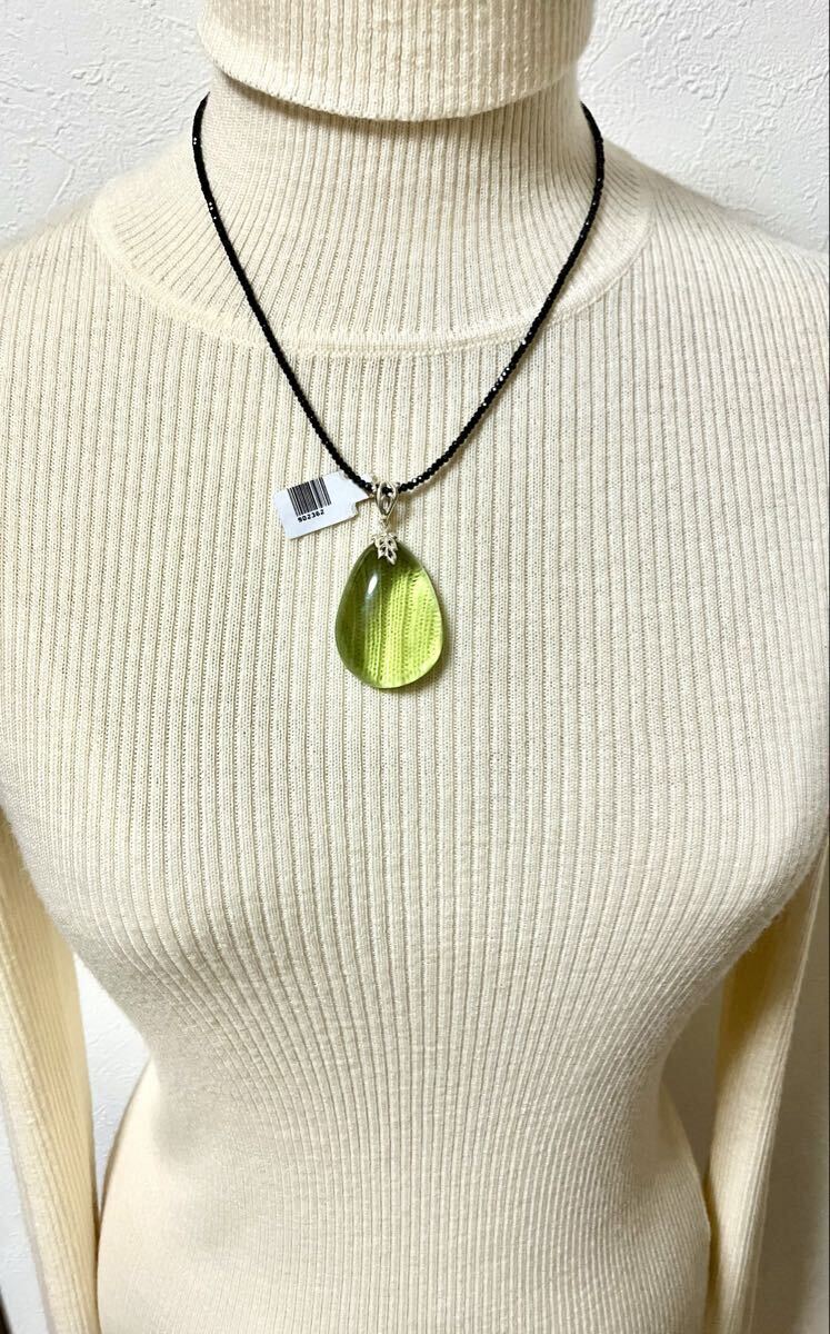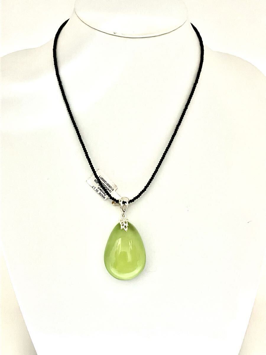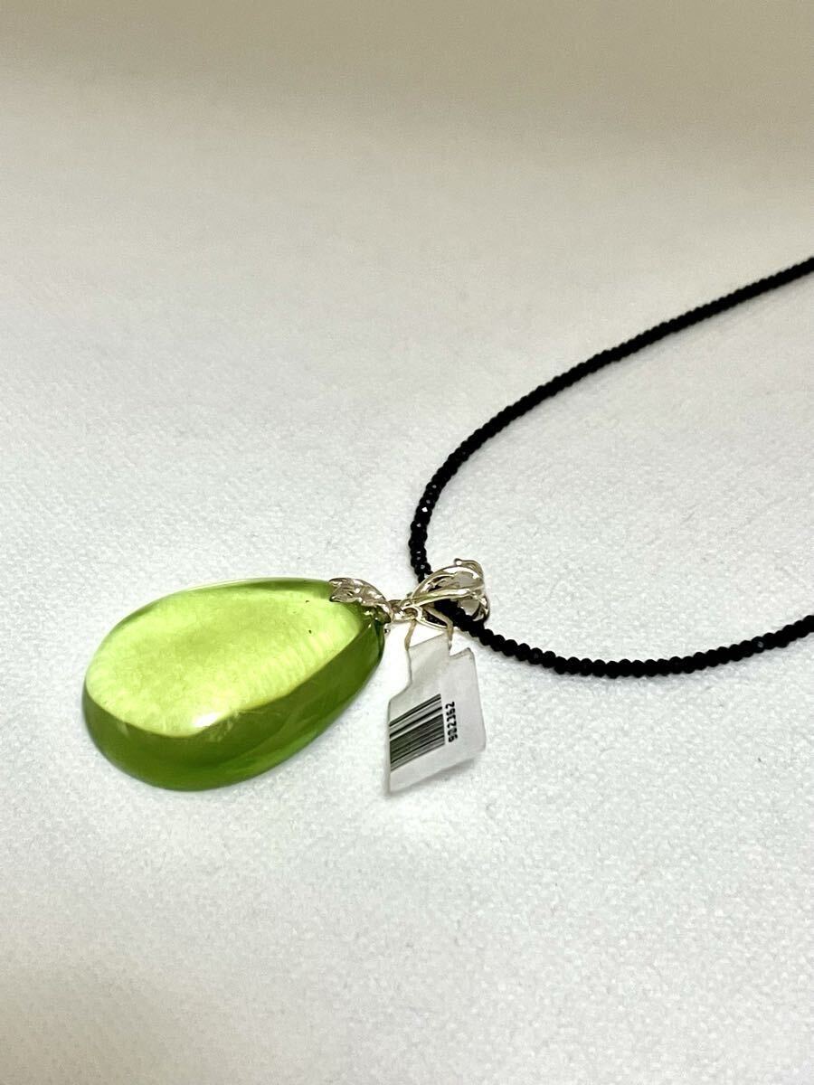 大ぶりのしずく型の発色の美しい不純物の少ないグリーン琥珀です。