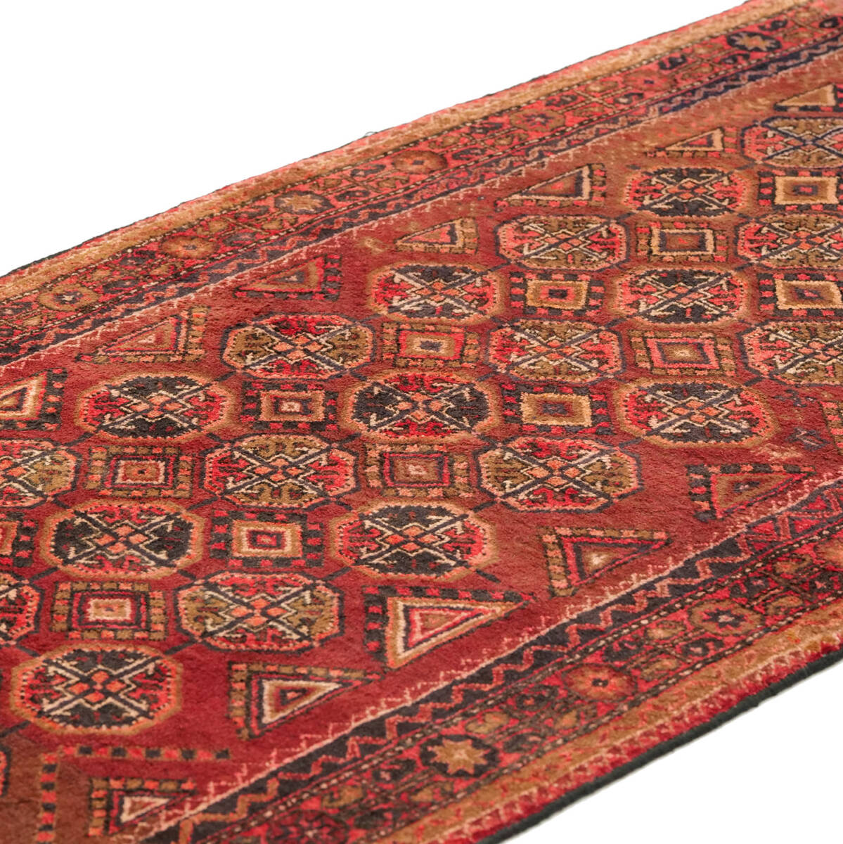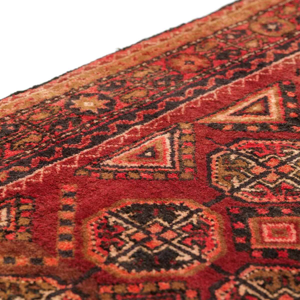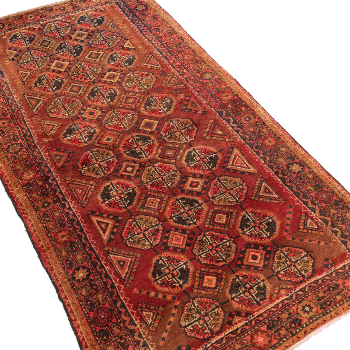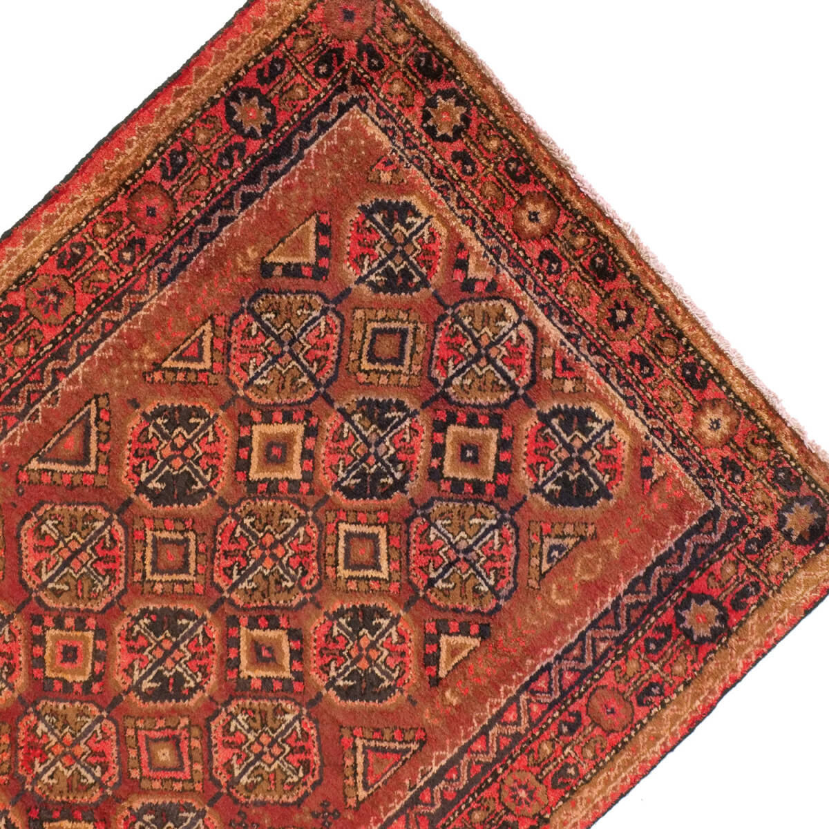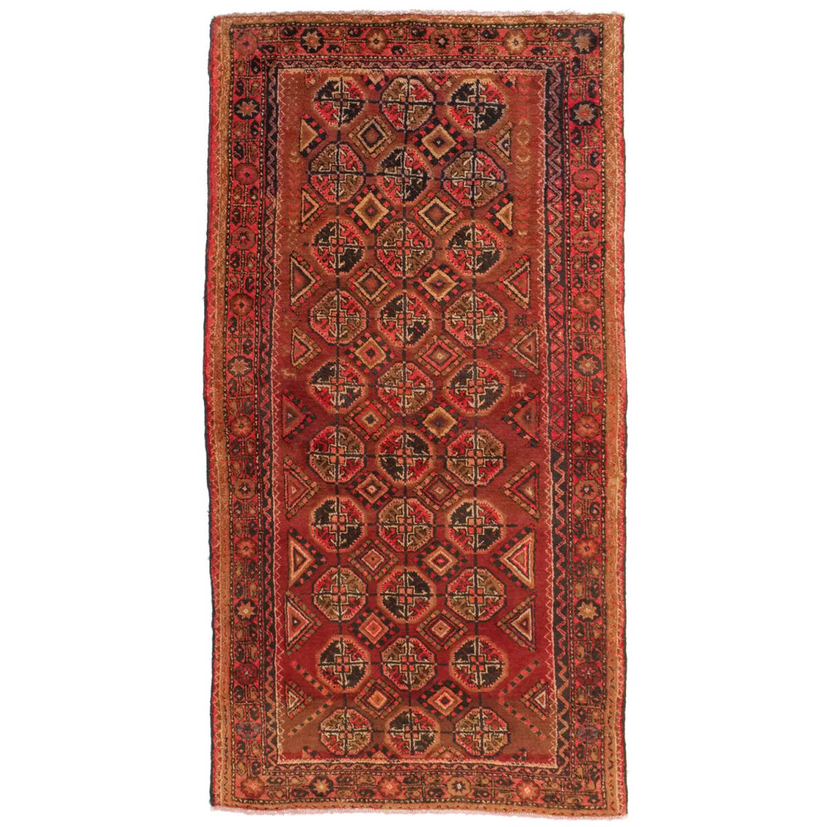 1960年代に織られたザーボル産のセミアンティークラグです。フィールドにはフックモチーフが連続して配置され、鉤形の意匠が持つ護符的な意味合いが古くから受け継がれています。整然とした繰り返し文様は空間に統一感と安定感を与え、力強い印象をもたらします。