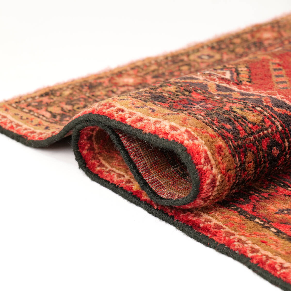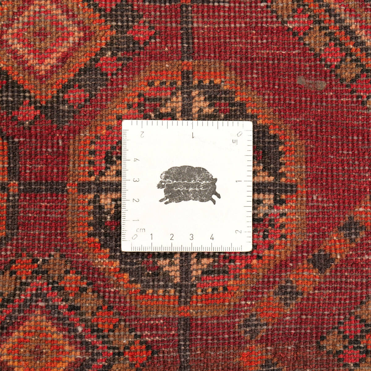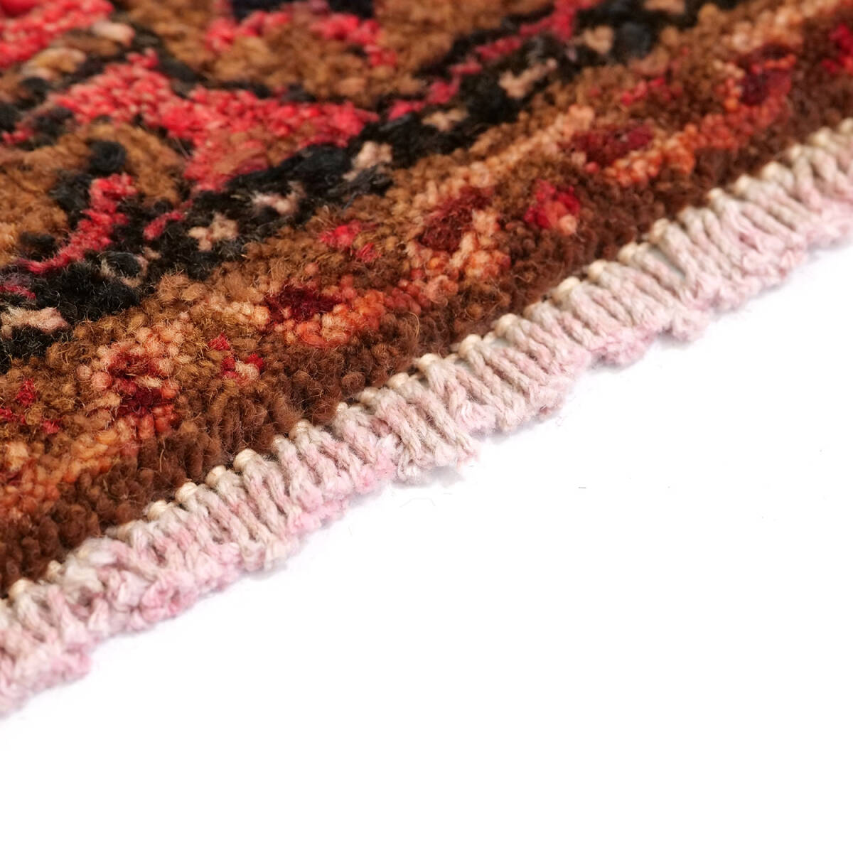 赤と茶を基調に黒と生成りが織り込まれ、経年により落ち着いた色調に変化しています。セミアンティークならではの深みを感じられる配色です。