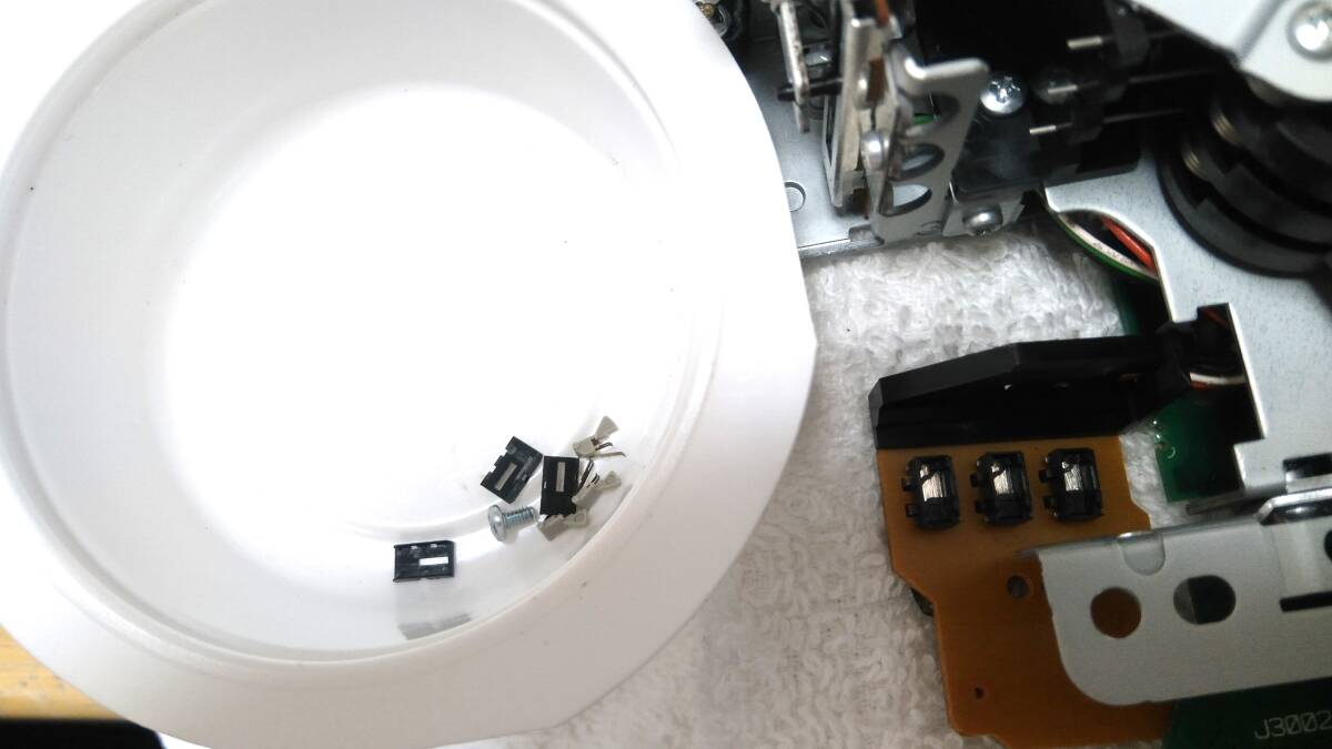 ・CD盤、挿入しても作動しない症状が出る箇所が有りますので、予防の為、原因と思われるマイクロスイッチ3個、分解し清掃しました。(真黒でした。)