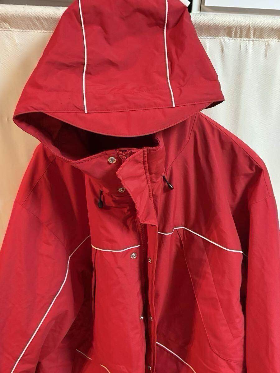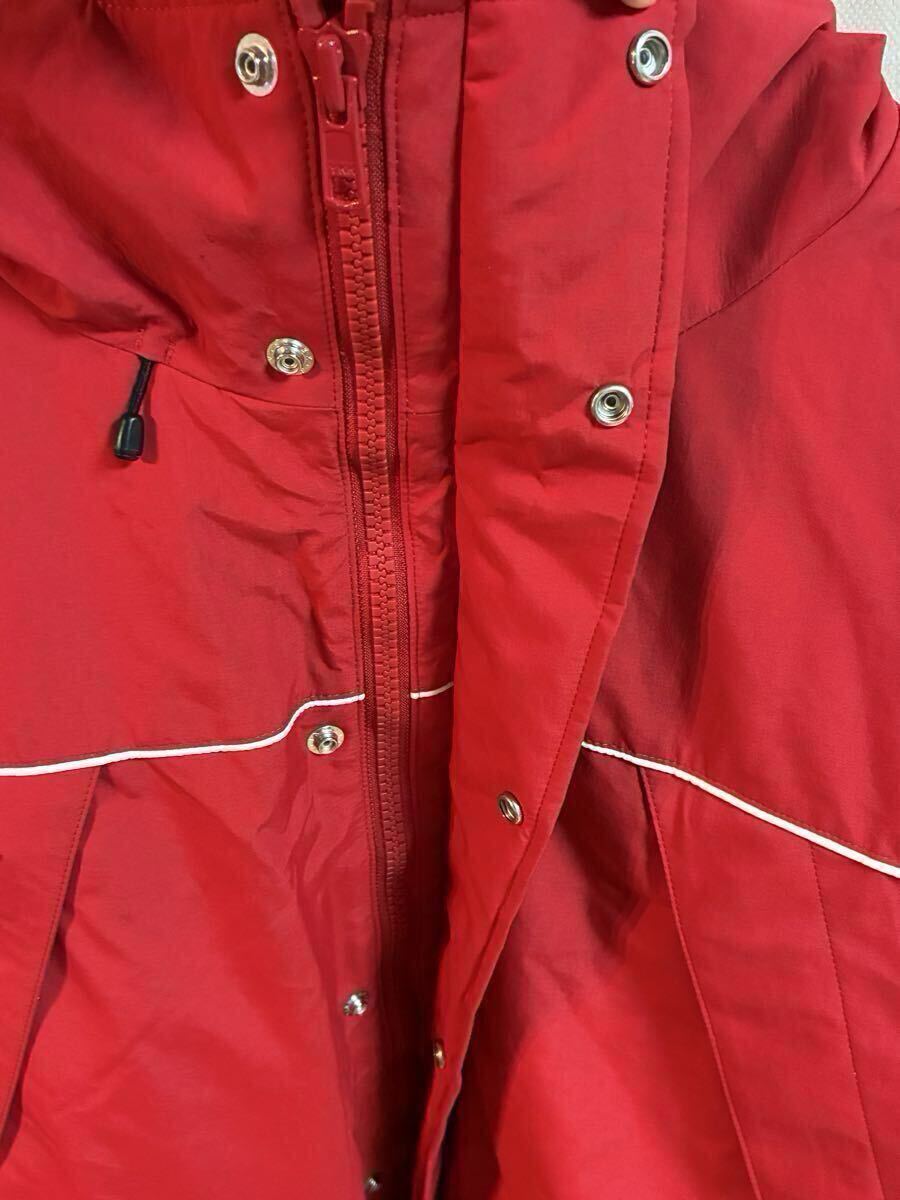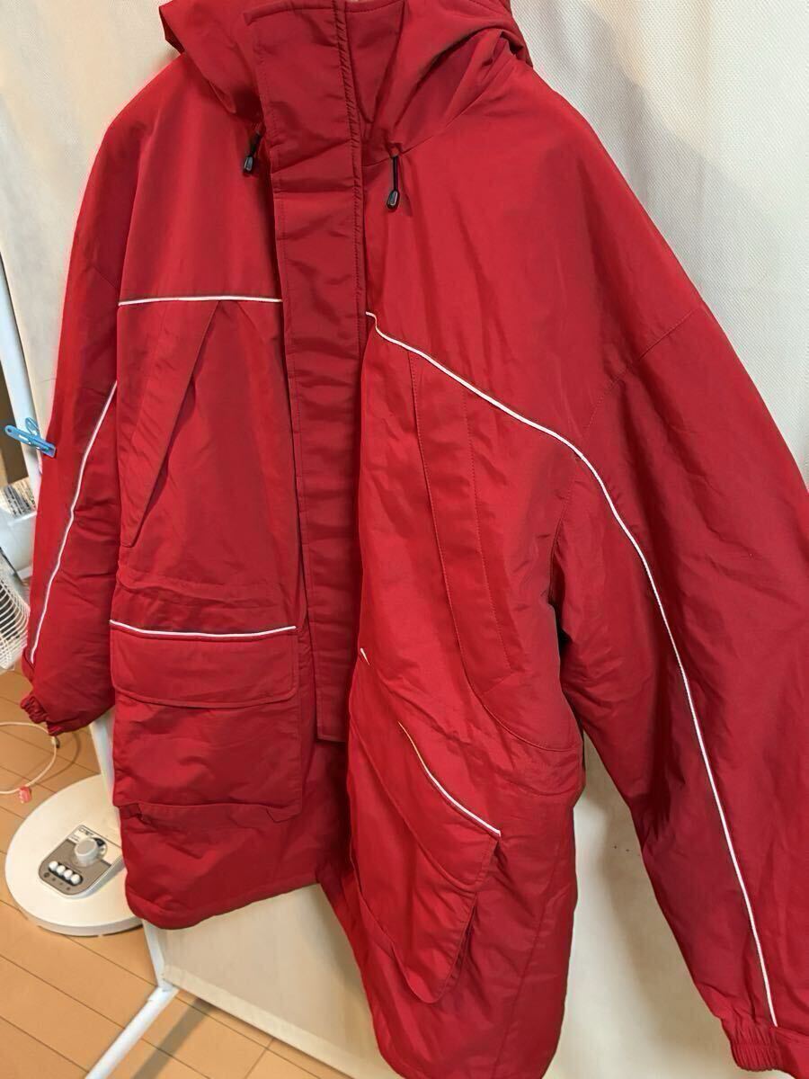 鮮やかなレッドのナイロンジャケット、ユニークなデザインと機能的なポケットが特徴。