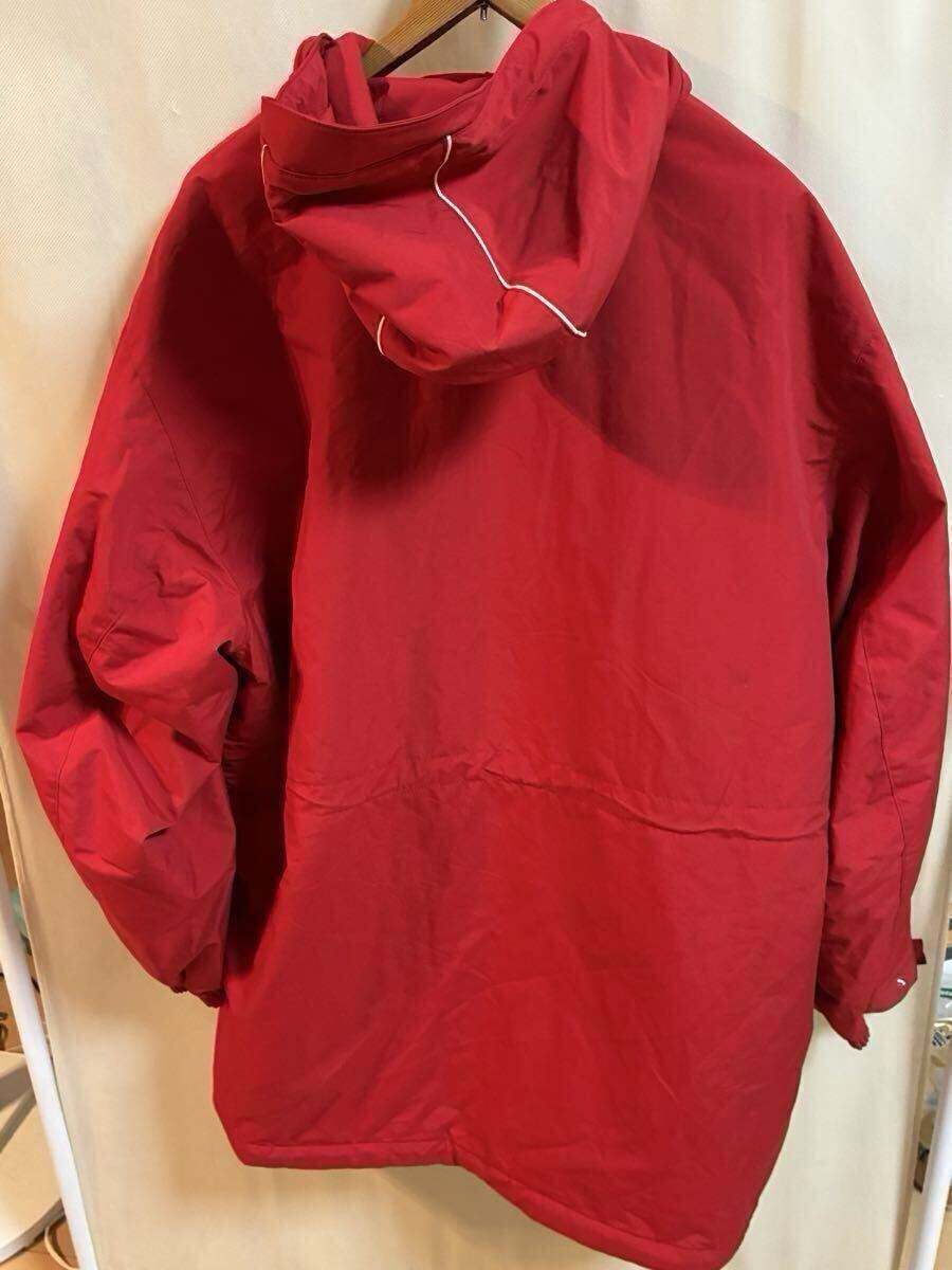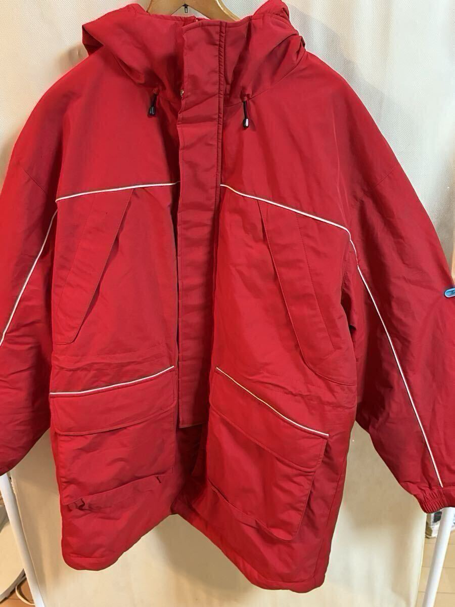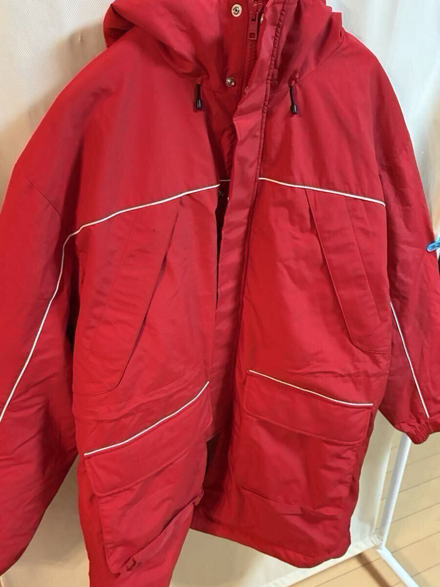 鮮やかなレッドのナイロンジャケット、ユニークなデザインと機能的なポケットが特徴。