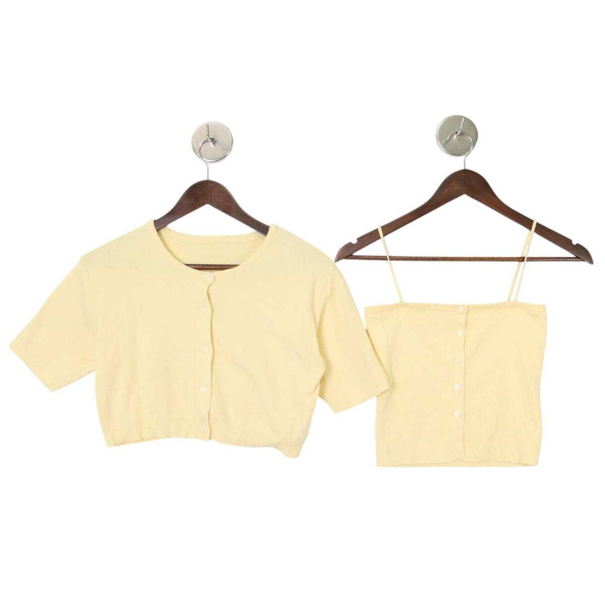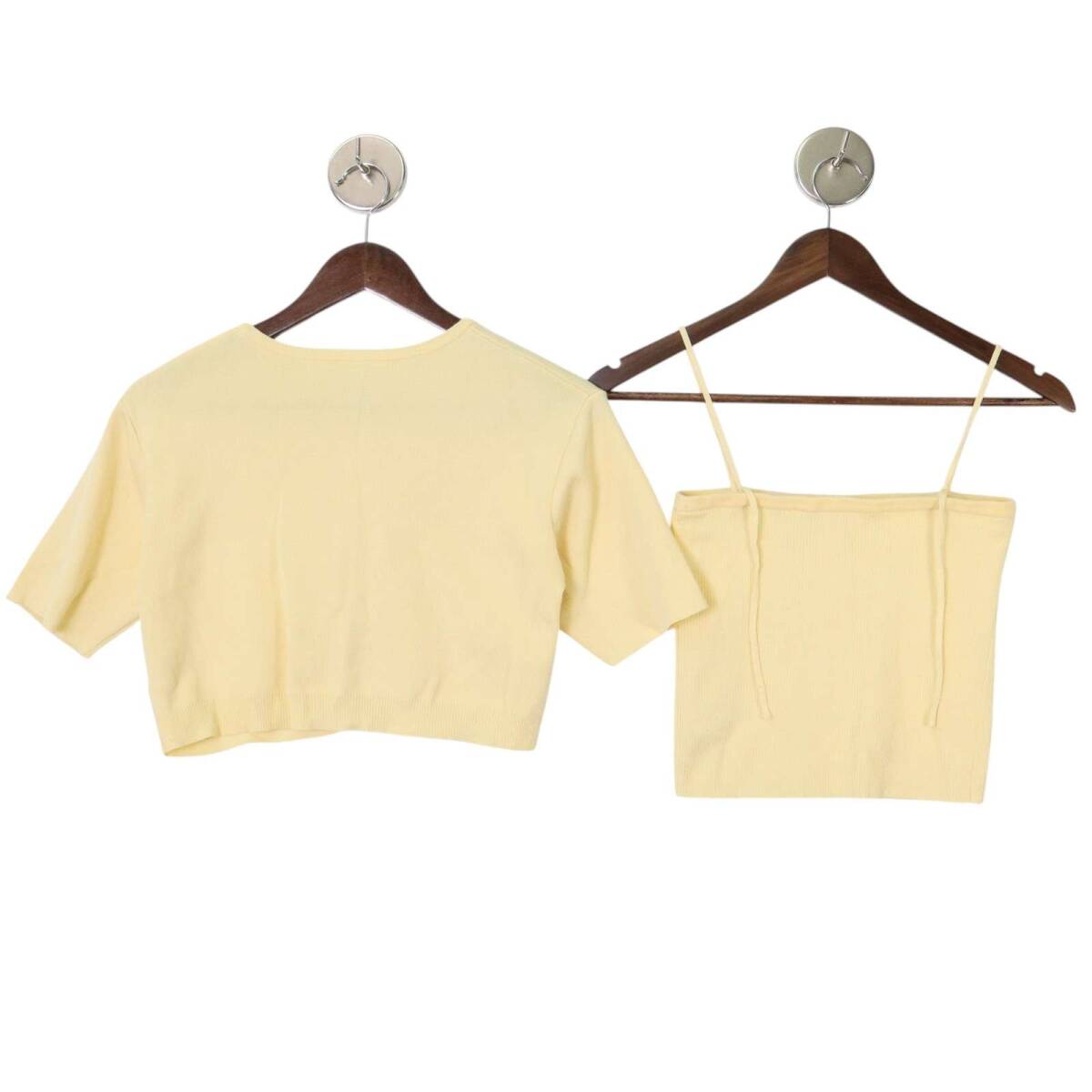 mystic ミスティック 春夏★ 半袖 クロップド カーディガン & キャミソール ニット アンサンブル Sz.F レディース 黄色
