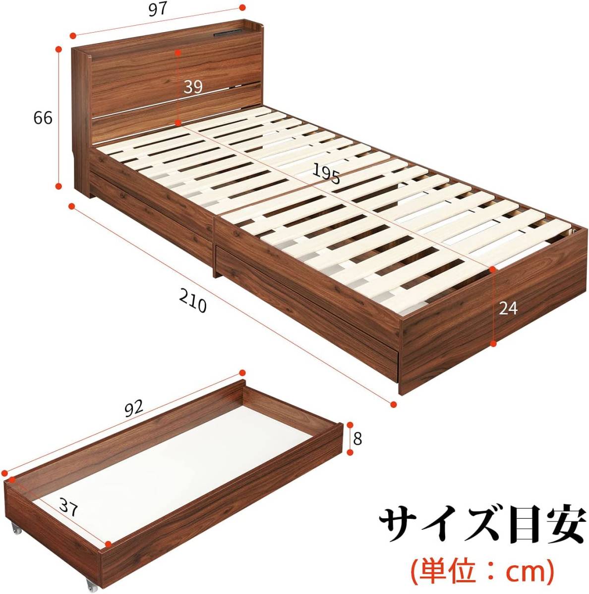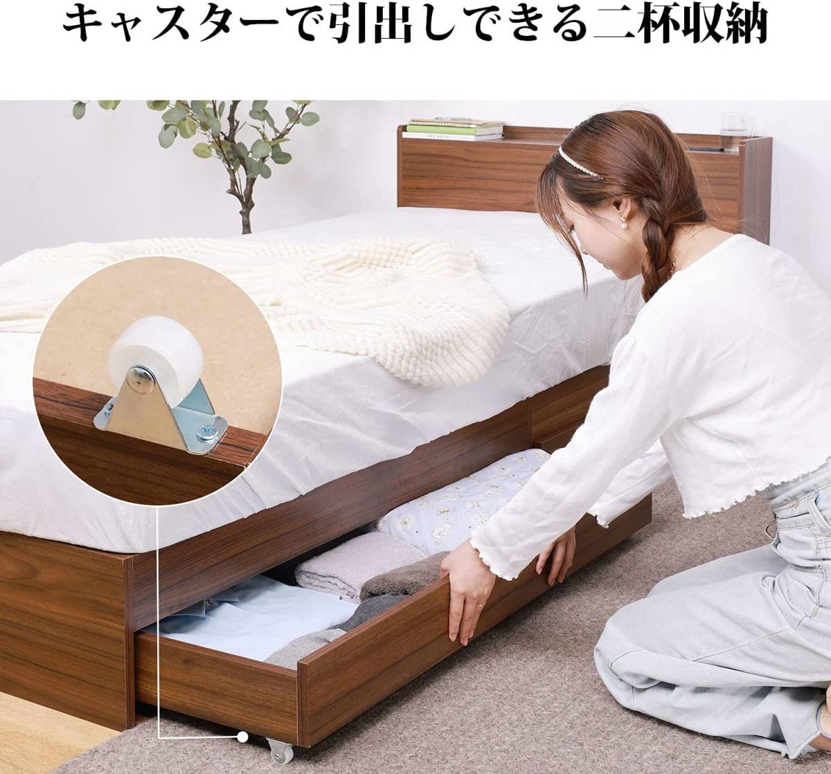• 【キャスターで引出す2杯収納】ベッド下に2杯の引出し収納が付いてるすのこベッドです。たくさん収納しても簡単に引き出せるようにキャスター仕様を採用しました。引き出しは左右どちらにも取り付けられるので、お部屋はどんな方向でも対応可能です。