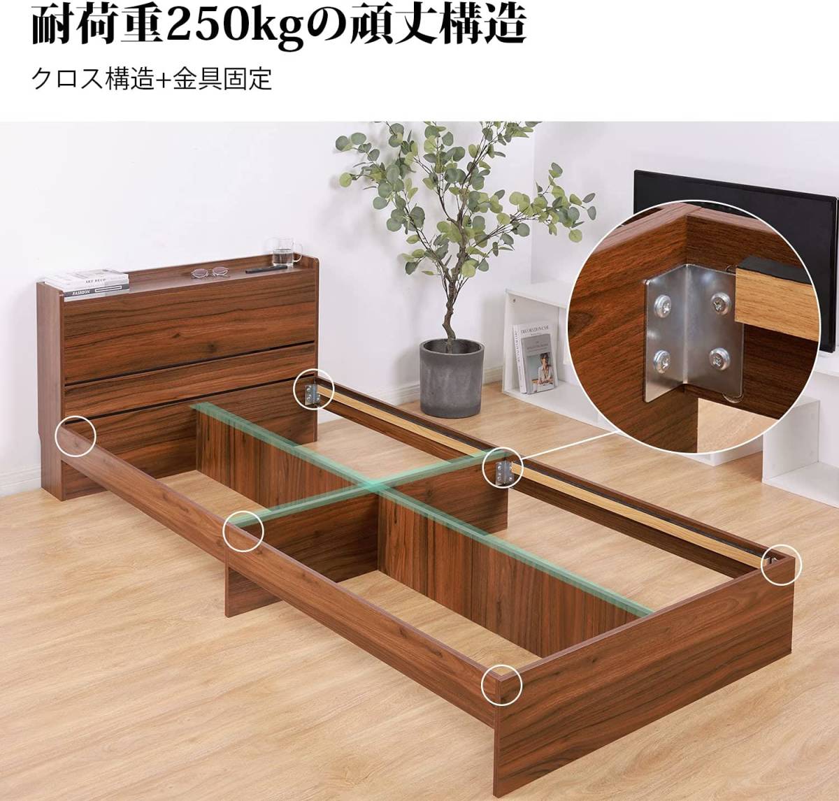 • 【耐荷重】こだわった高品質なモダンベッドです。便利性を追求した美しいデザインがより洗練されたお部屋を演出します。また、耐荷重抜群のクロス構造を採用し、金属プレートでしっかりベッドを固定することで頑丈構造を実現しています。