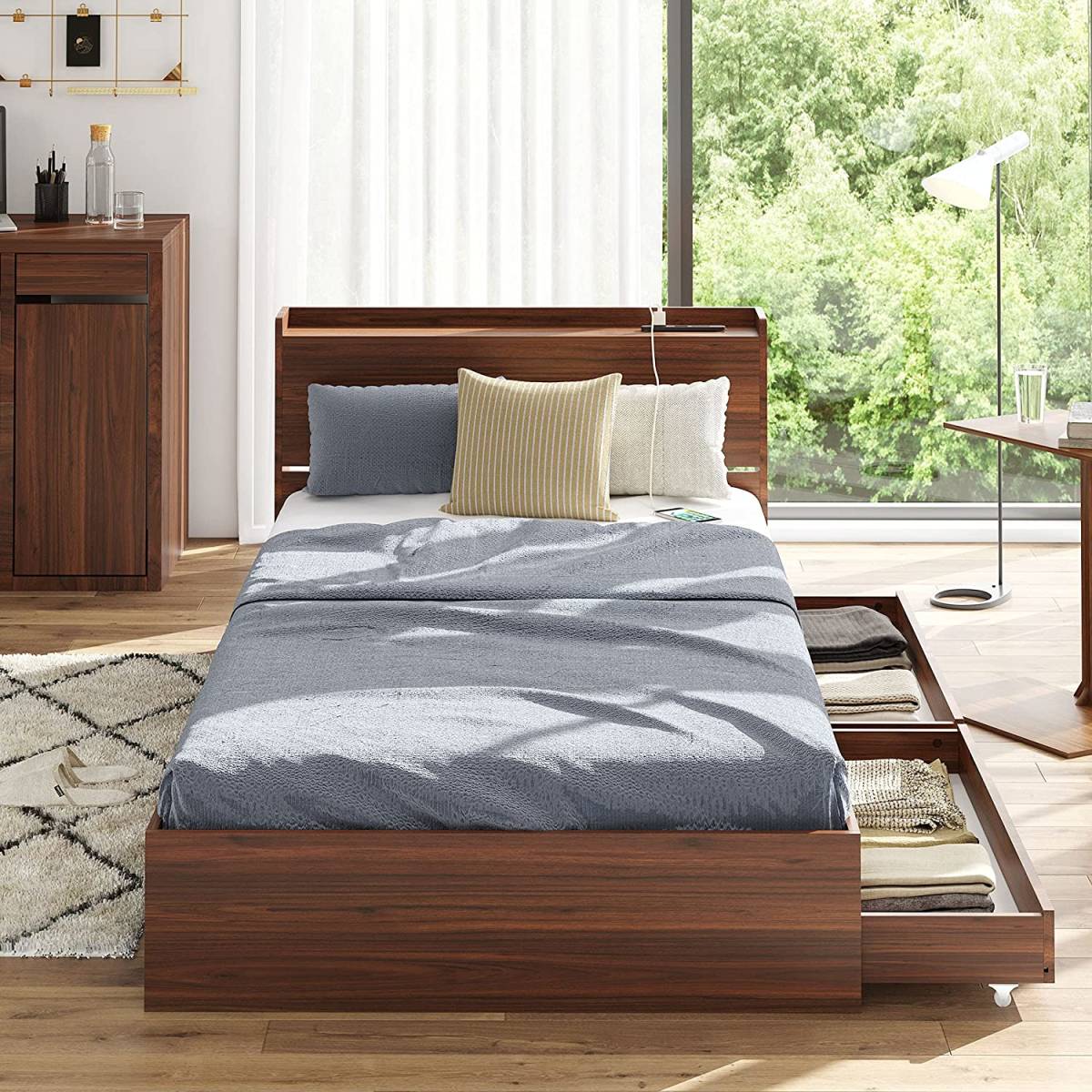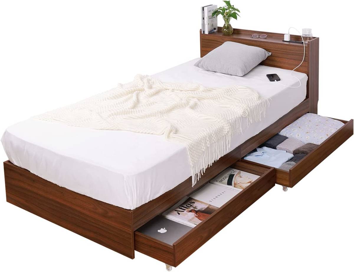 [送料込み] ベッド ベッドフレーム すのこベッド 収納付き 引き出し付き 木製 棚付き シングルベッド シングル コンセント付き 一人暮らし
