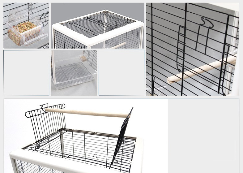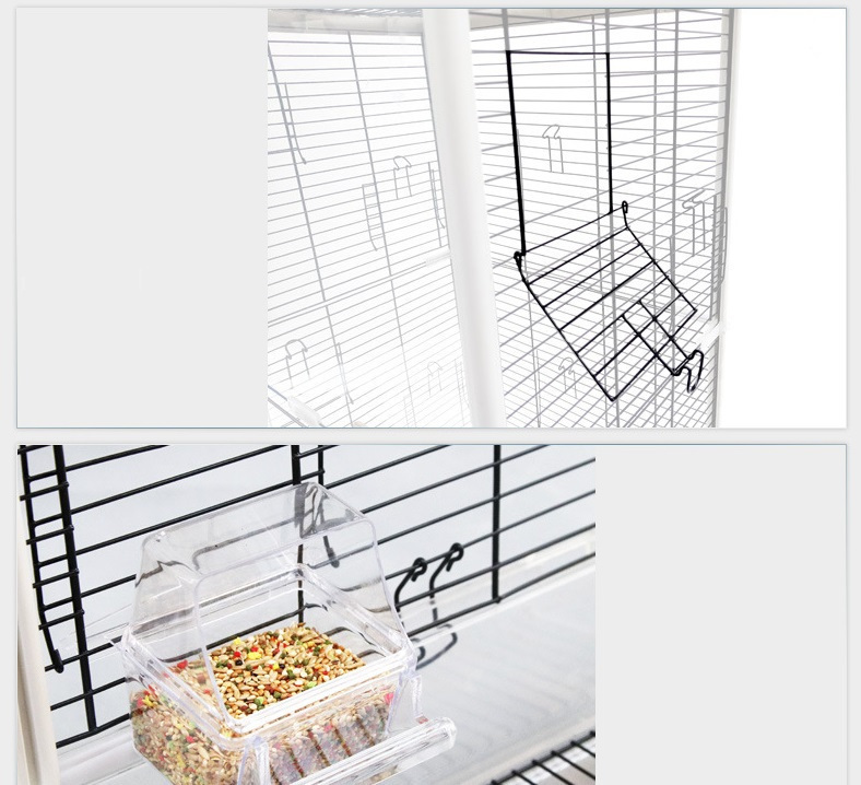 4つのプラスチック製エサ入れと2本の木製止まり木が付属します。