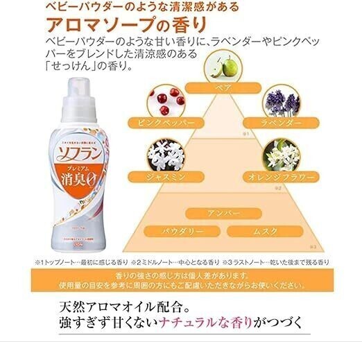 香り:アロマソープの香り。ベビーパウダーのような甘い香りに、ラベンダーやピンクペッパーをブレンドした清涼感のある「せっけん」の香り