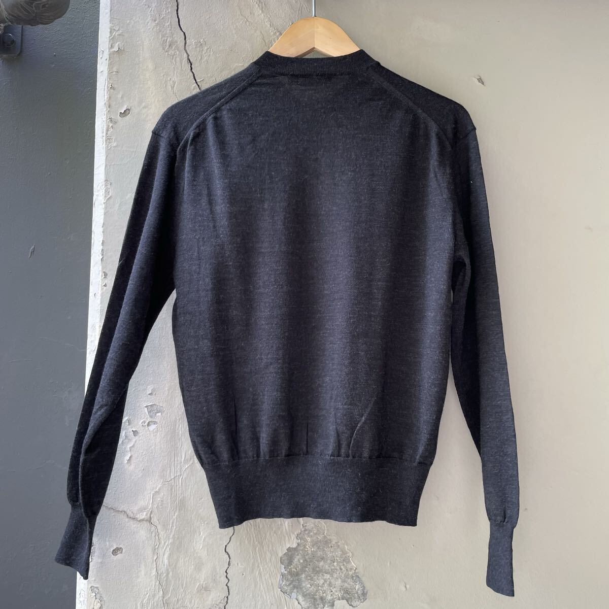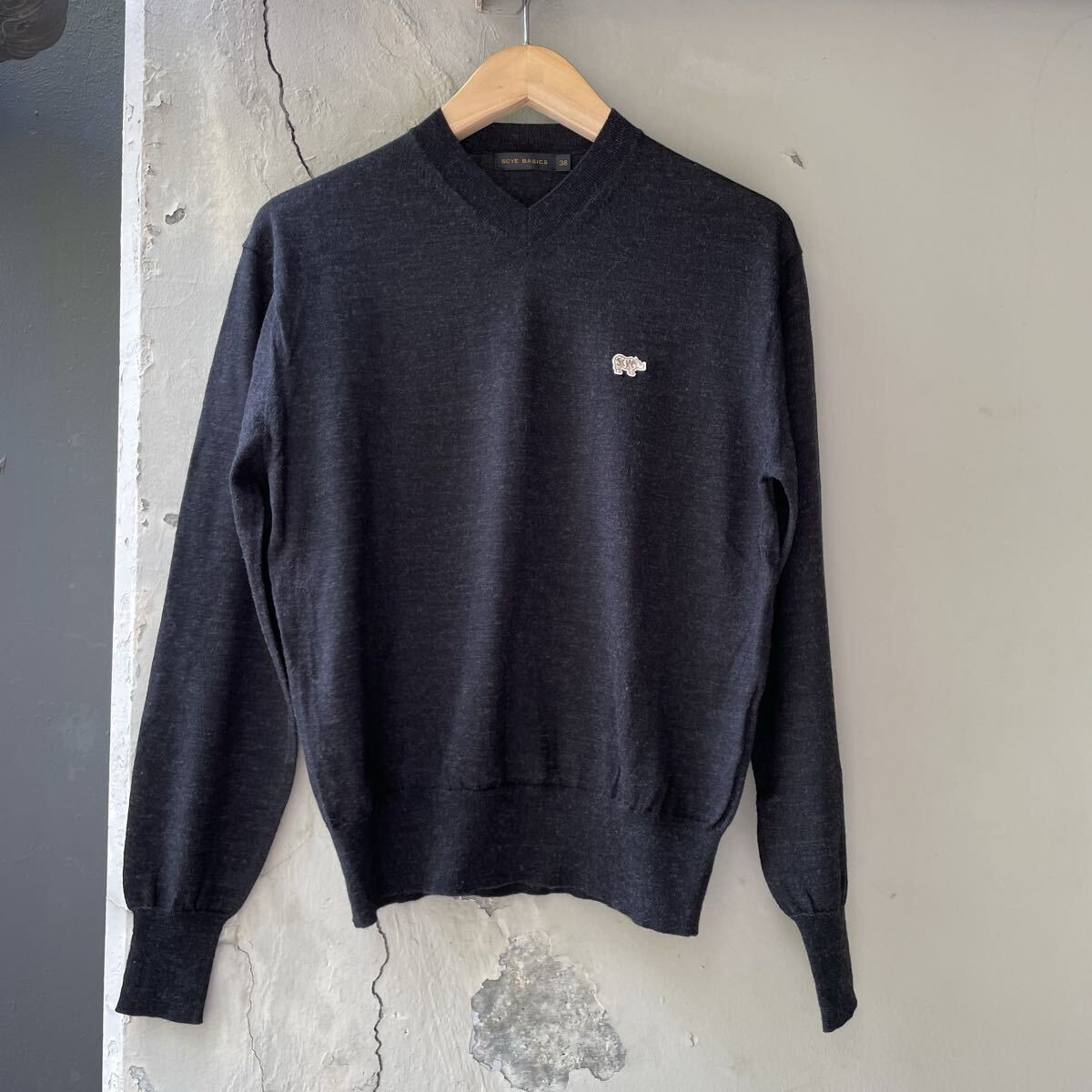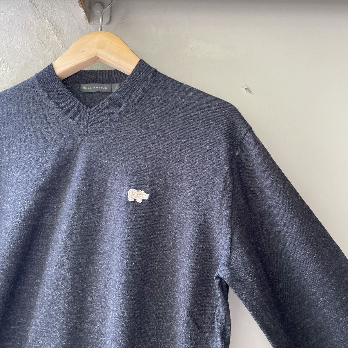 サイベーシックスのウール100%ハイゲージニットが入荷しました。白い毛がミックスされたスミクロのような色味のVネックです。左胸にサイのロゴマークワッペン付き。この機会に是非ご検討くださいませ!!