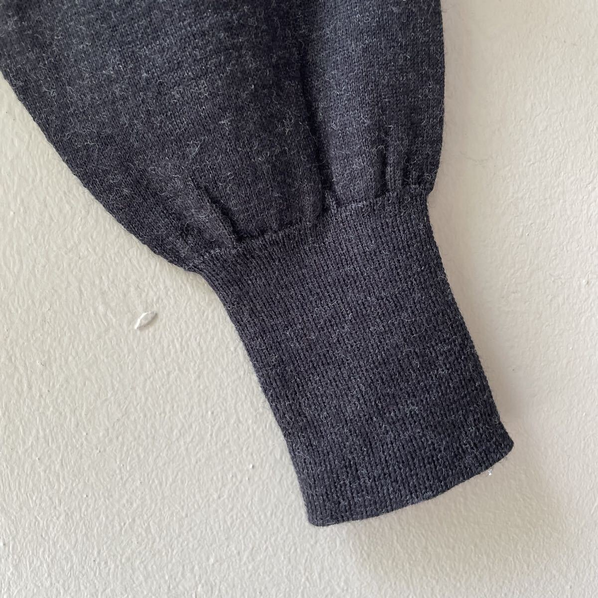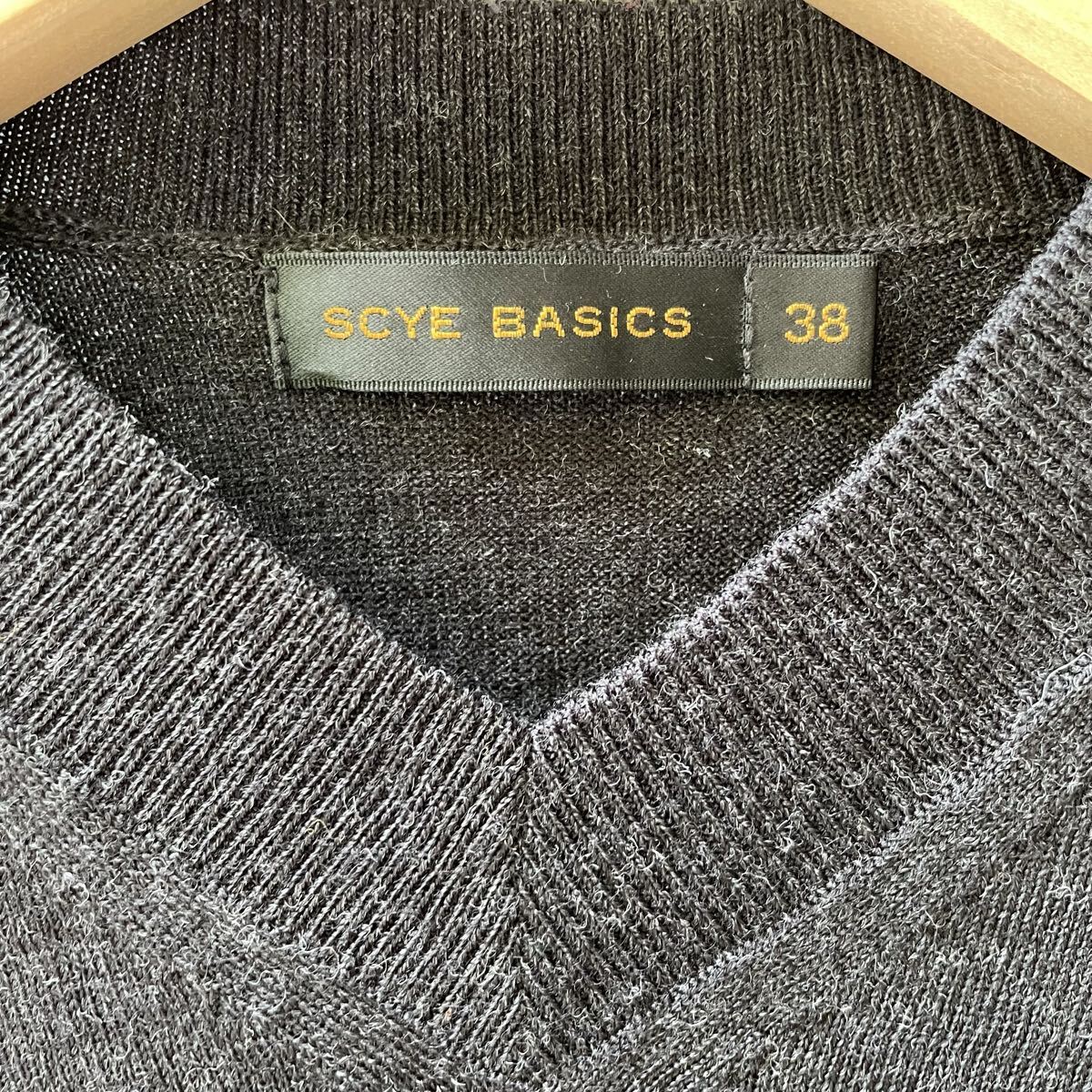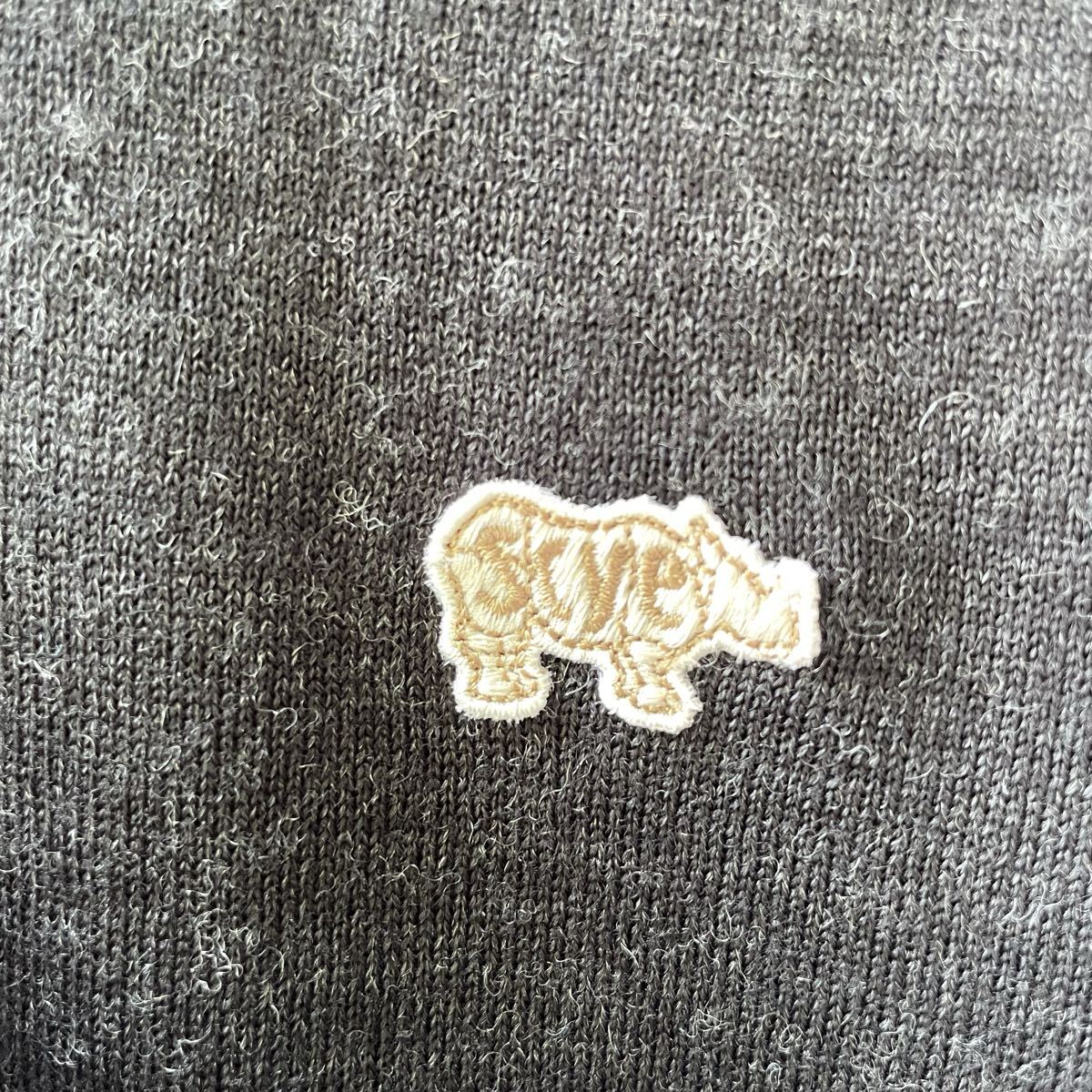 サイベーシックスのウール100%ハイゲージニットが入荷しました。白い毛がミックスされたスミクロのような色味のVネックです。左胸にサイのロゴマークワッペン付き。この機会に是非ご検討くださいませ!!