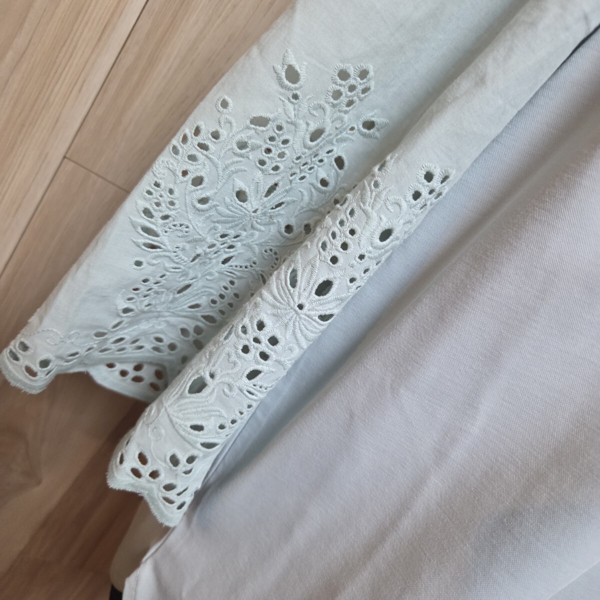 袖に用いた綿100%のアイレットレースは、クラウンとお花をモチーフにした当ブランドオリジナルで、端にほどこしたスカラップデザインによりお手元をエレガントに魅せてくれます。
