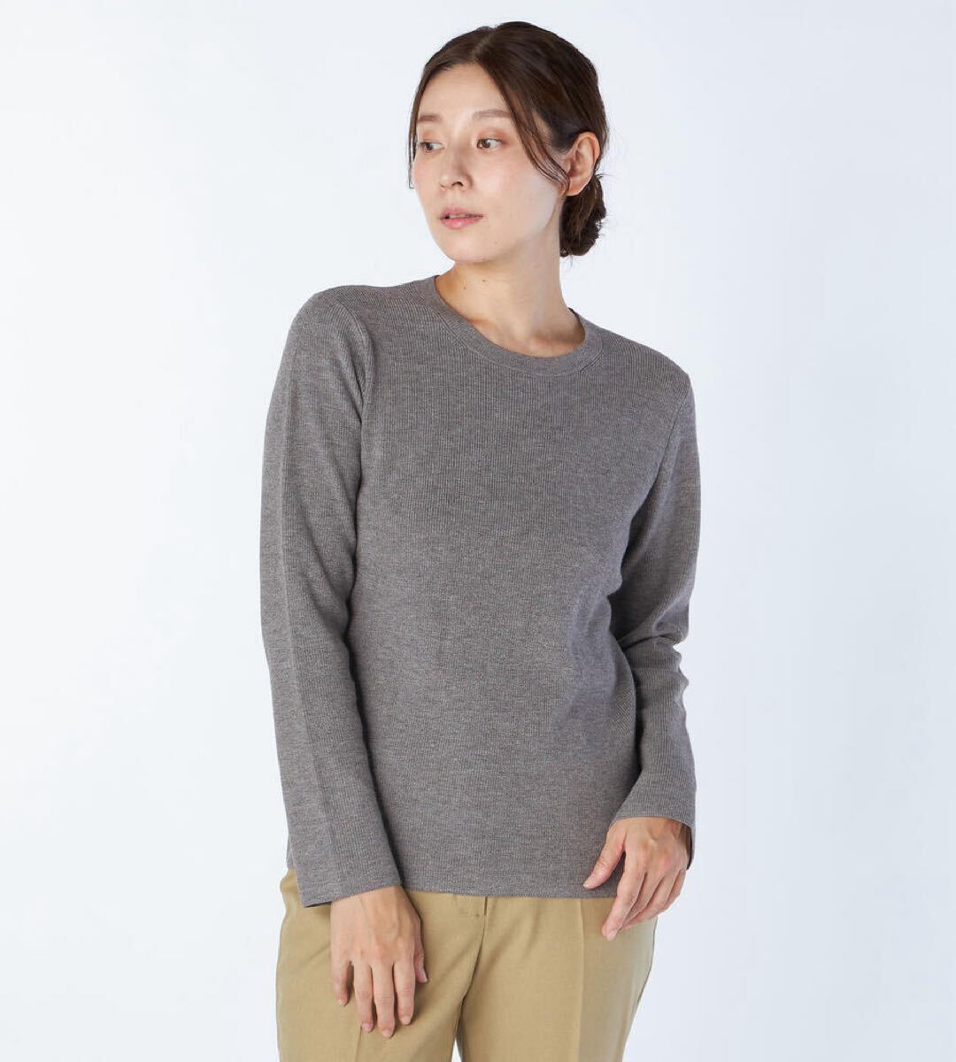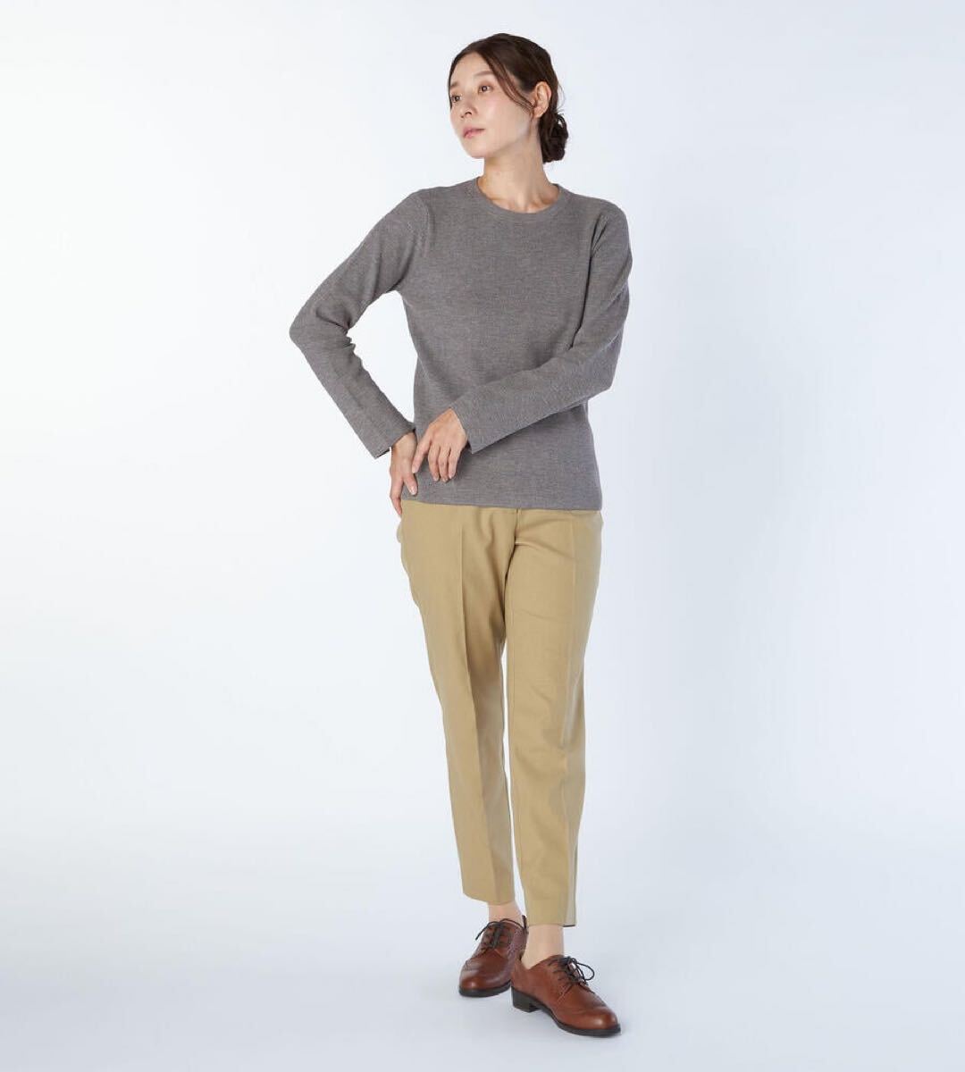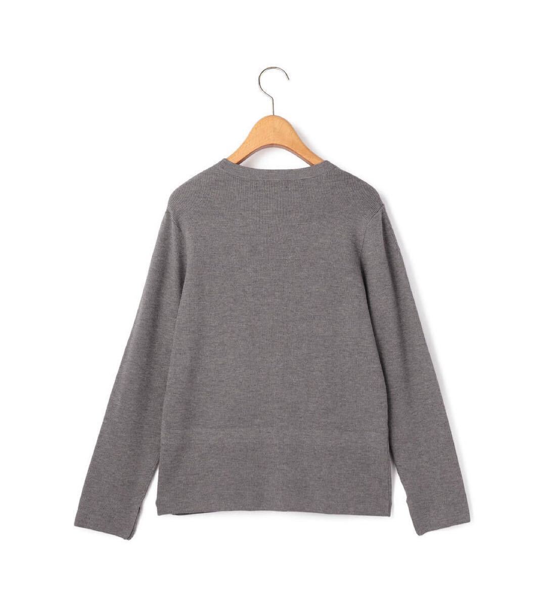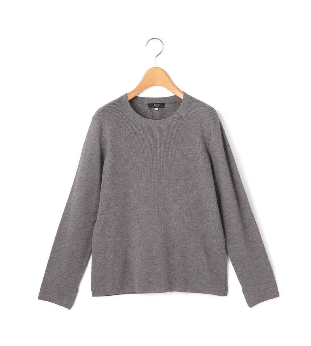 レーヨン中心の素材で、季節の変わり目に快適に着用できるシンプルニット。