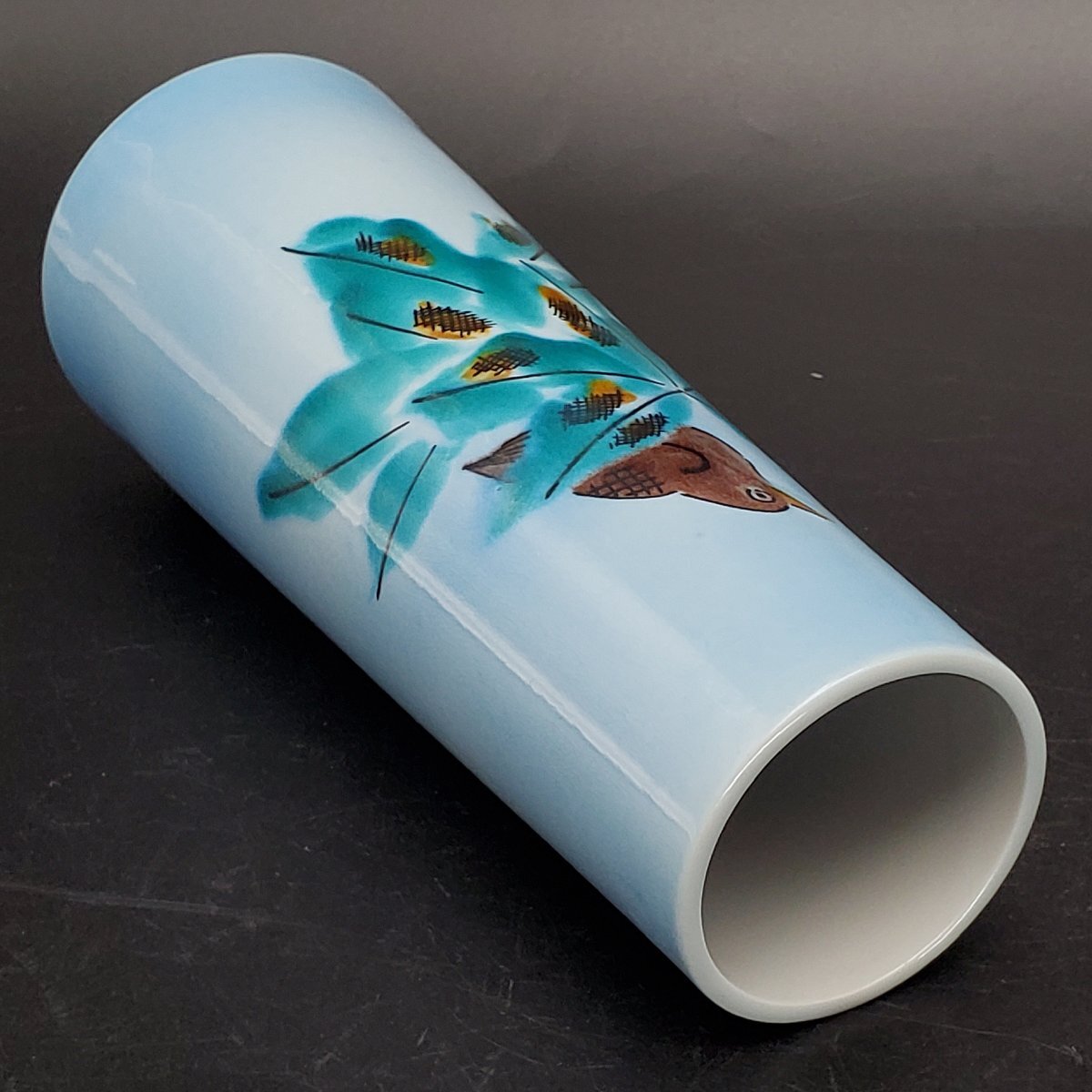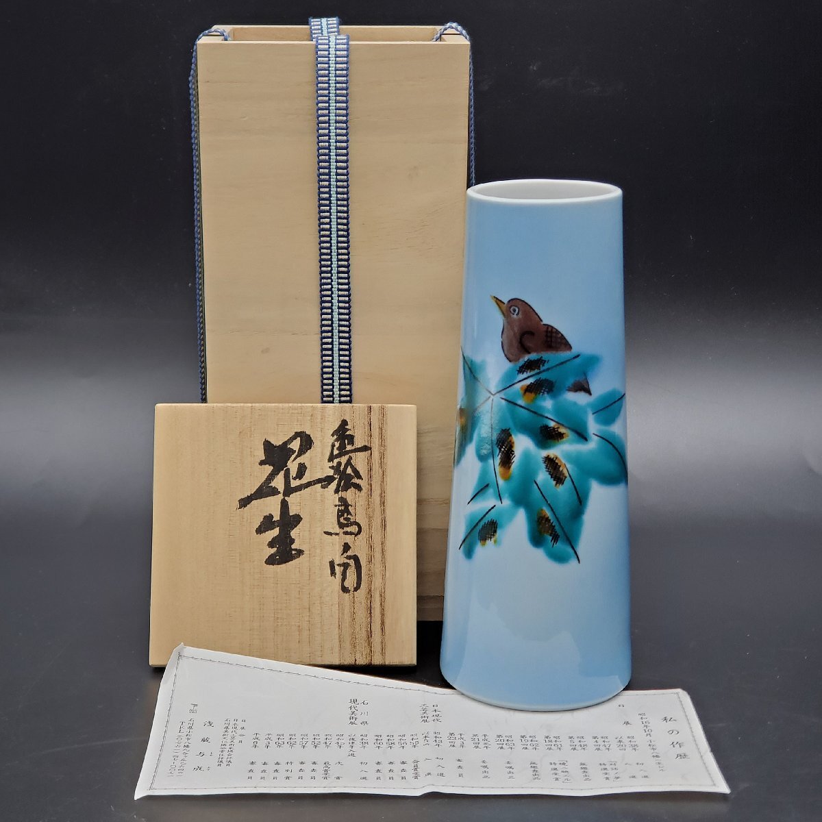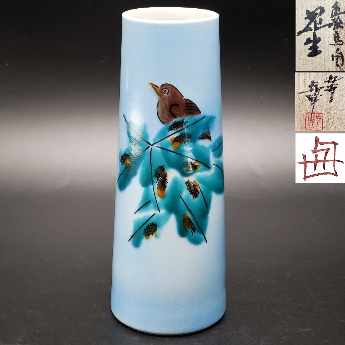 【宝蔵】九谷焼 浅蔵与成 色絵鳥図花生 花瓶 花器 高さ約20㎝ 共箱