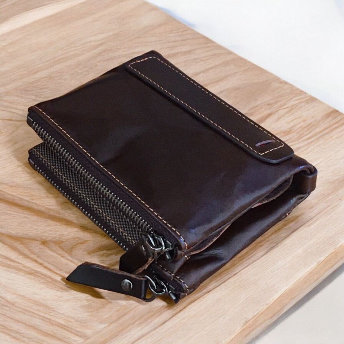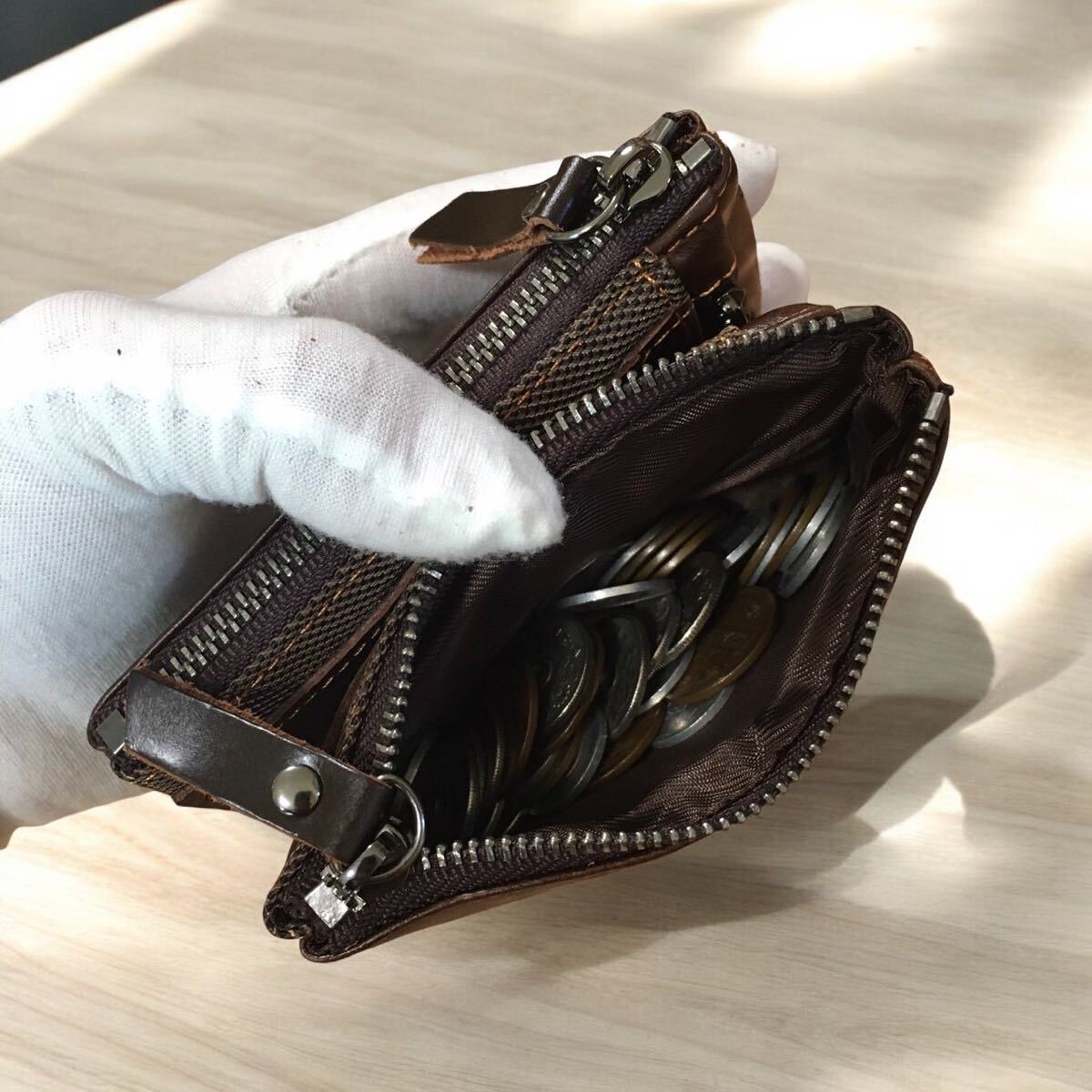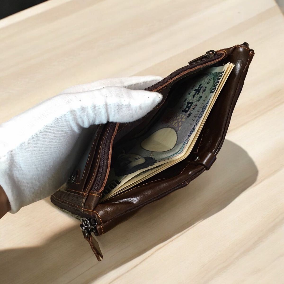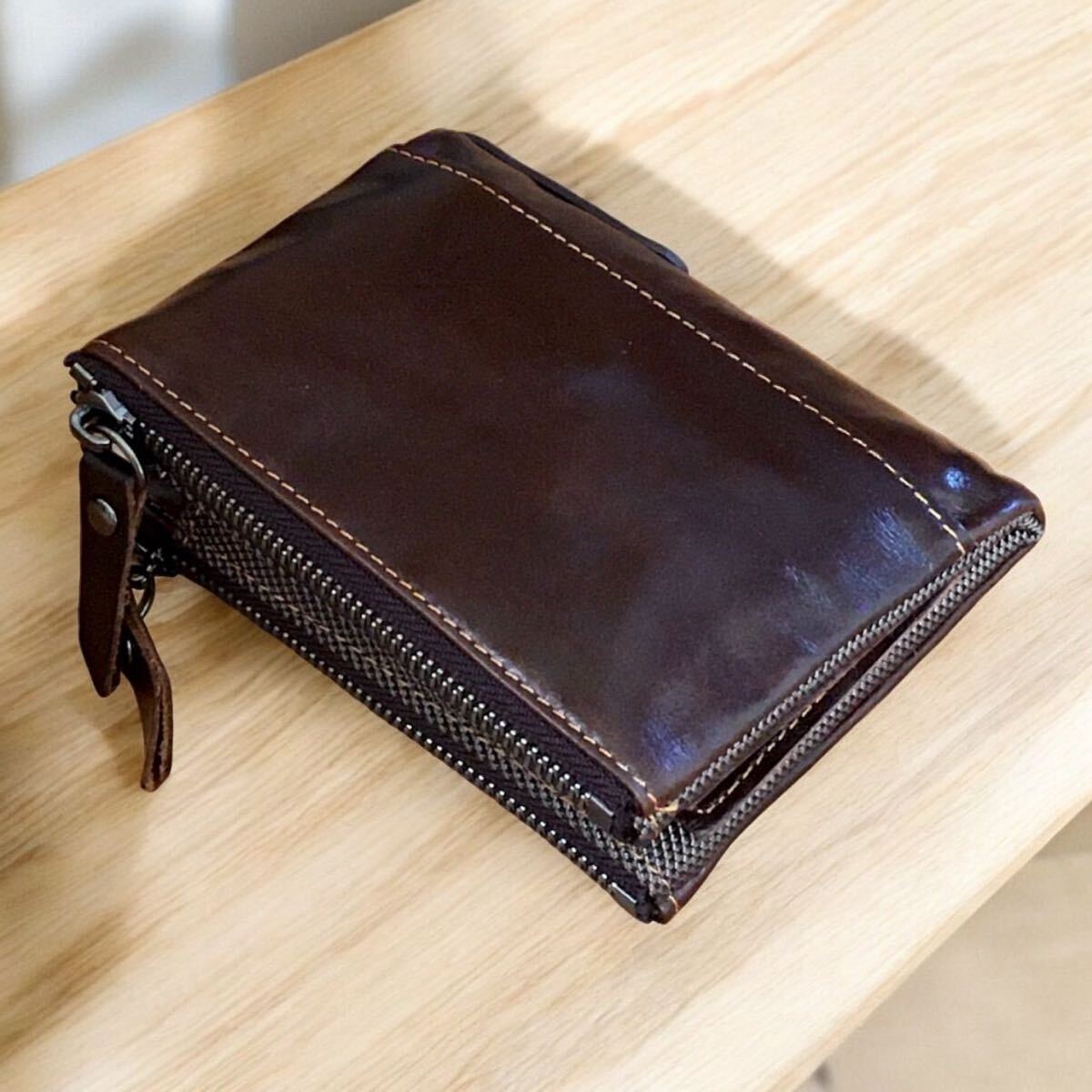 ダブルポケット、手のひらサイズのこげ茶色、牛革コンパクト財布