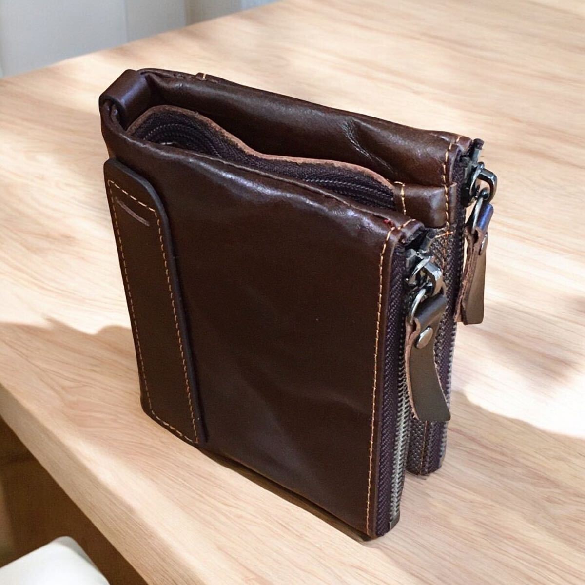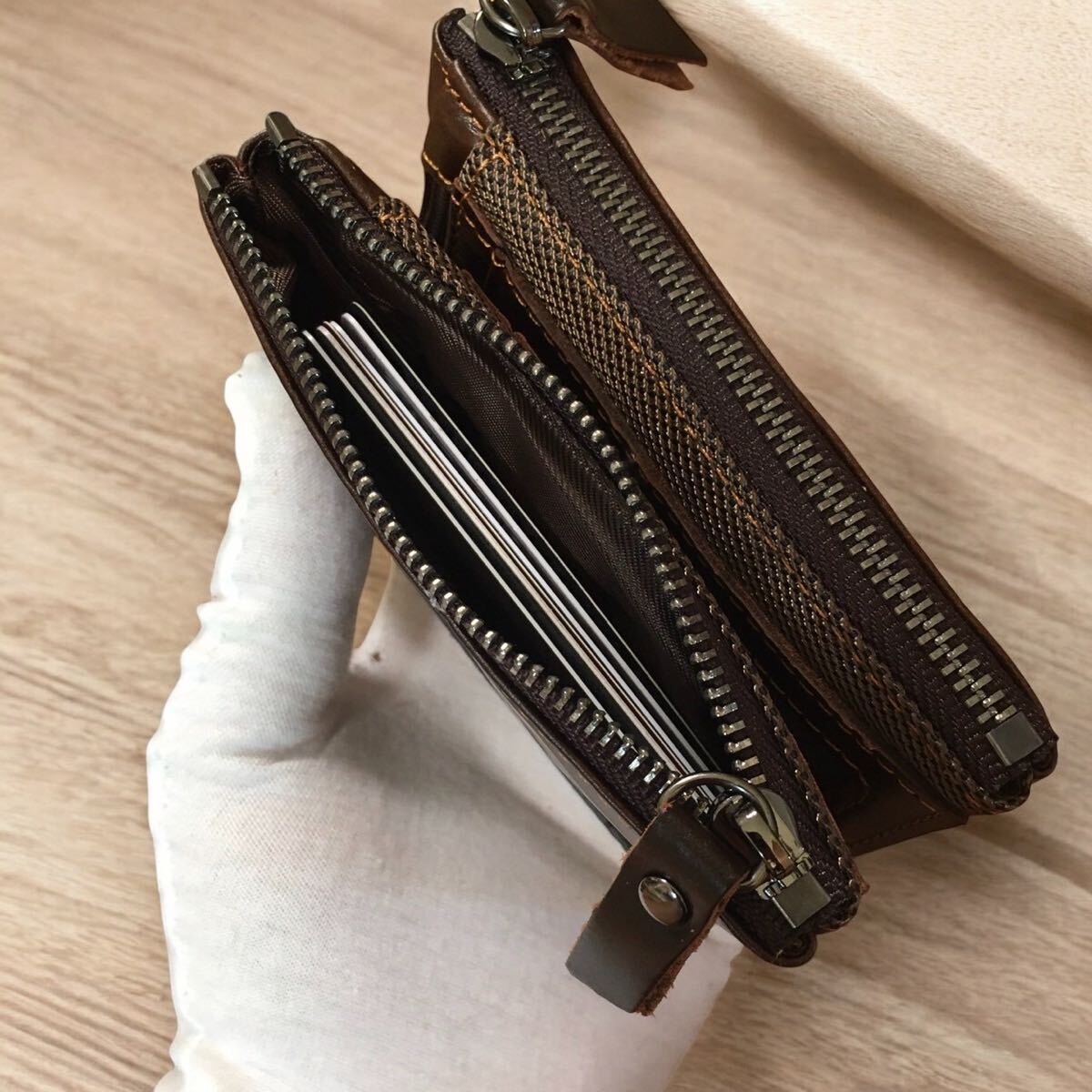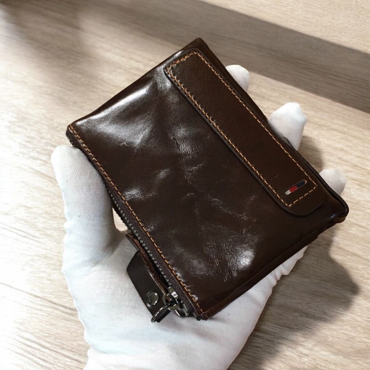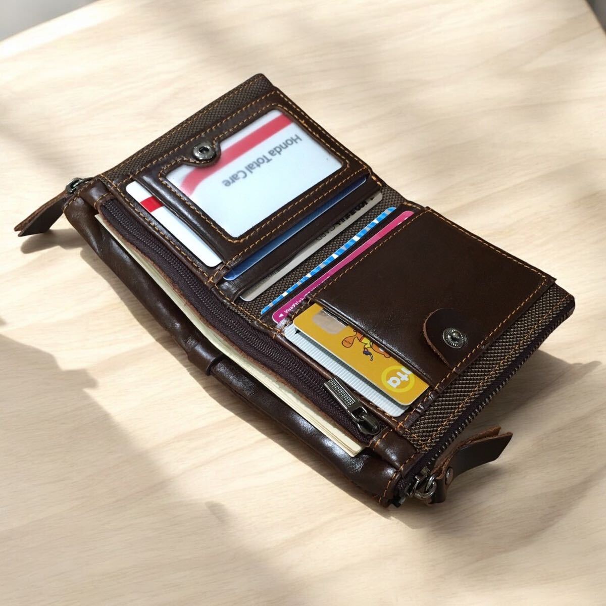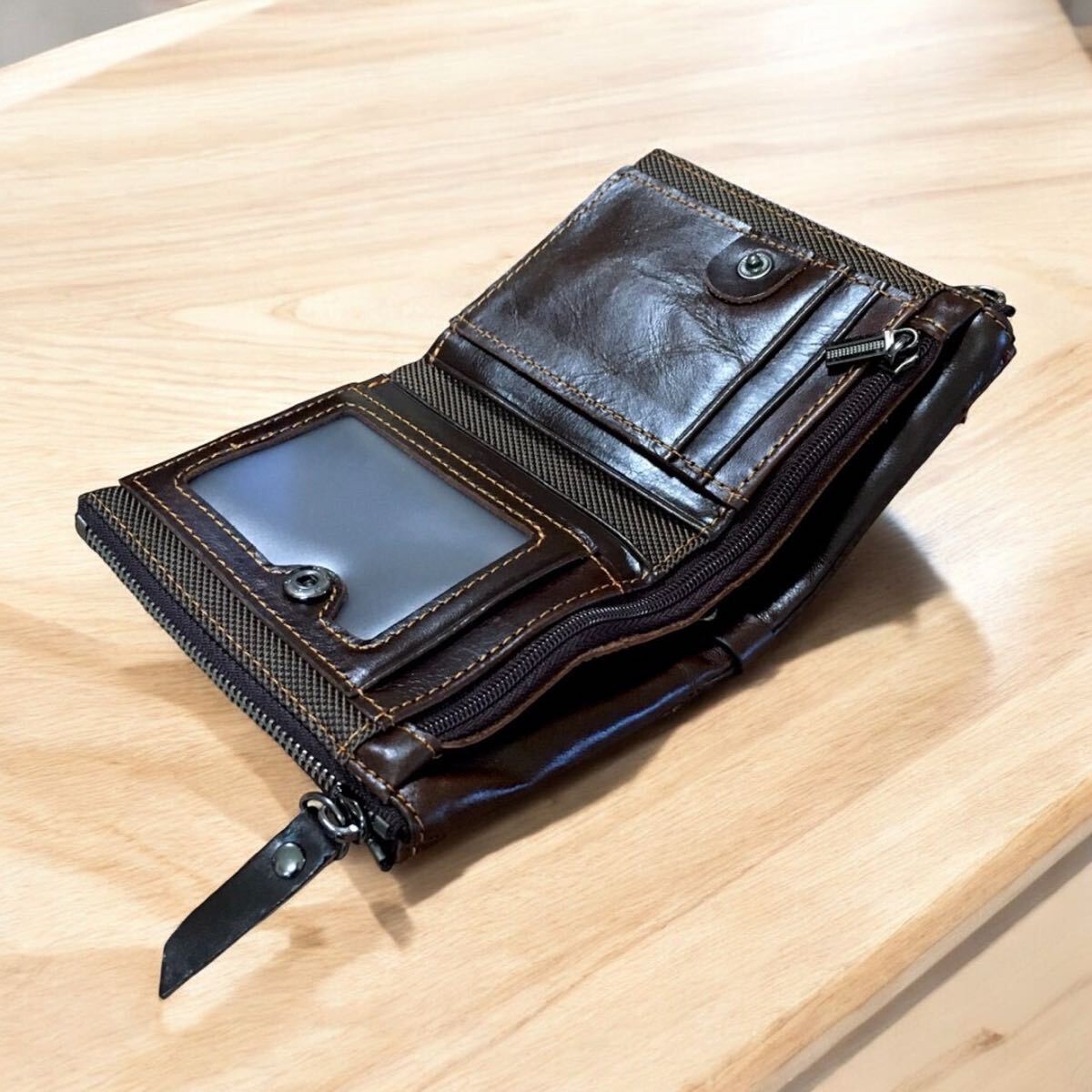 ダブルポケット、手のひらサイズのこげ茶色、牛革コンパクト財布