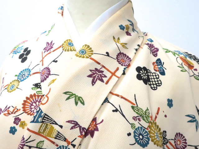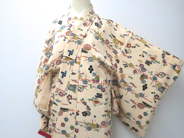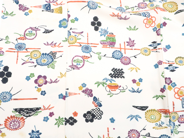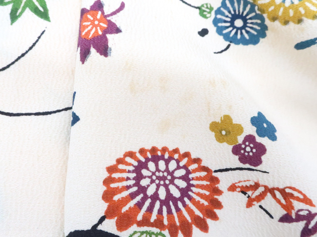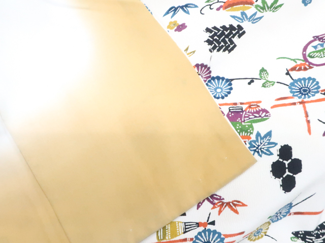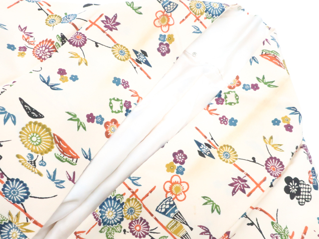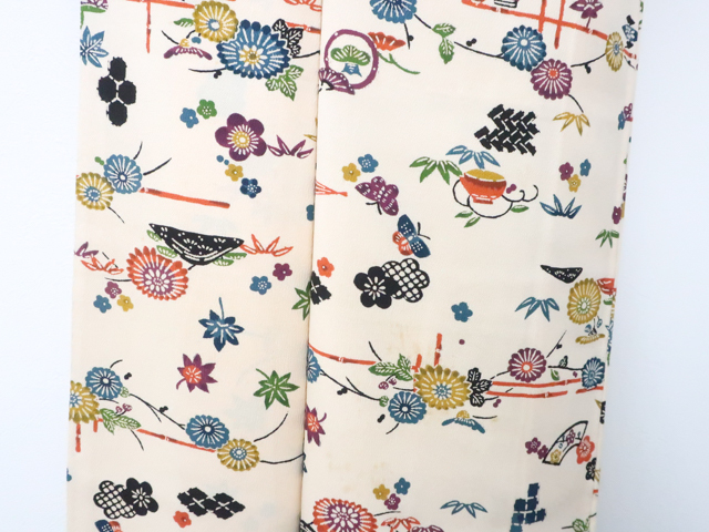 リサイクル商品のため、所々汚れがございますが着用可能なお品です。 地色はアイボリーです。 1枚目の画像が近いお色かと思われます。 素材は正絹です。 |