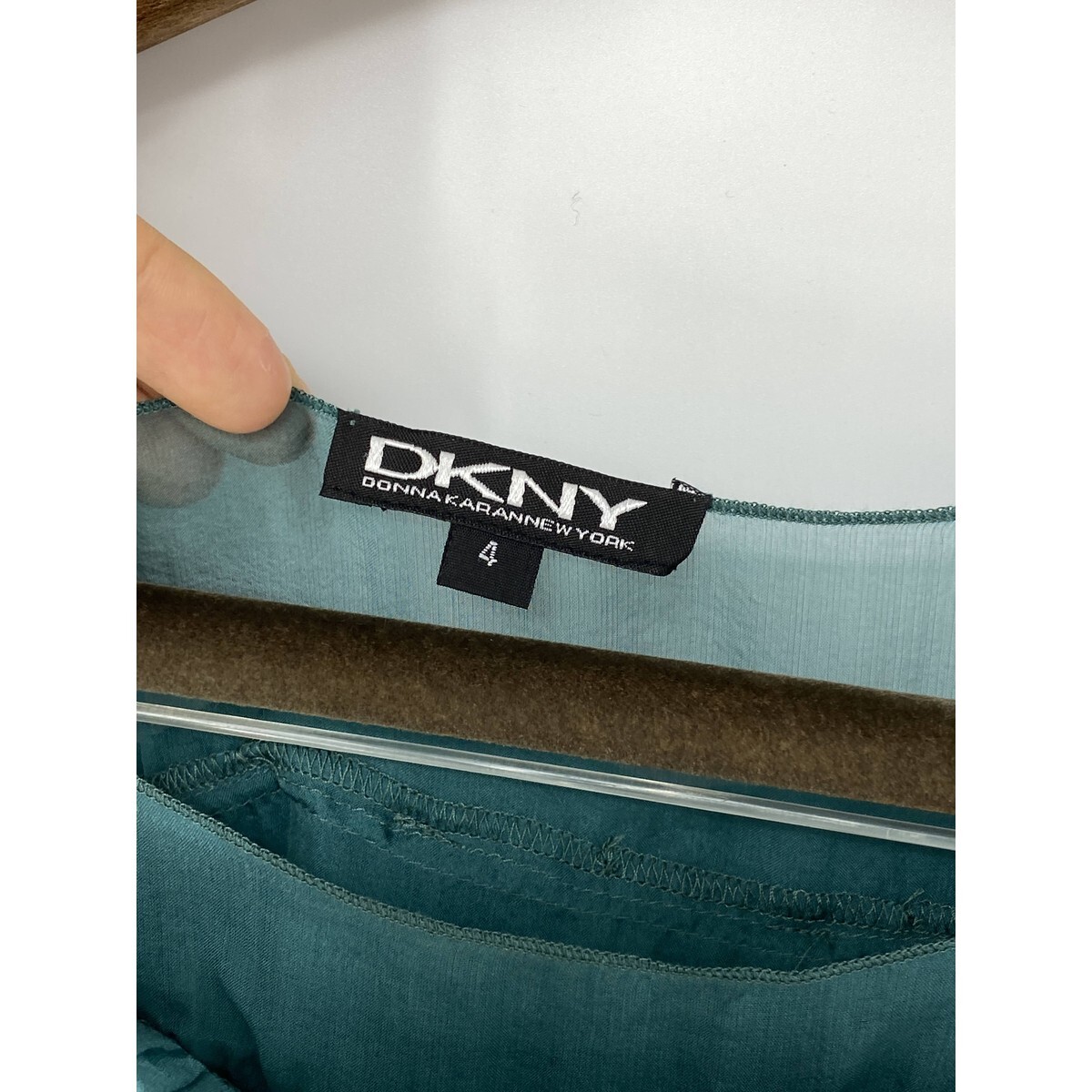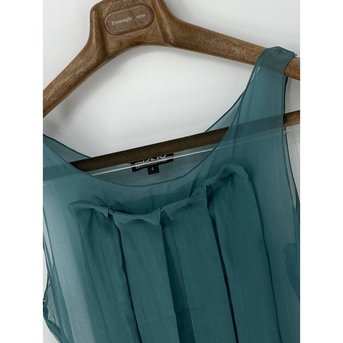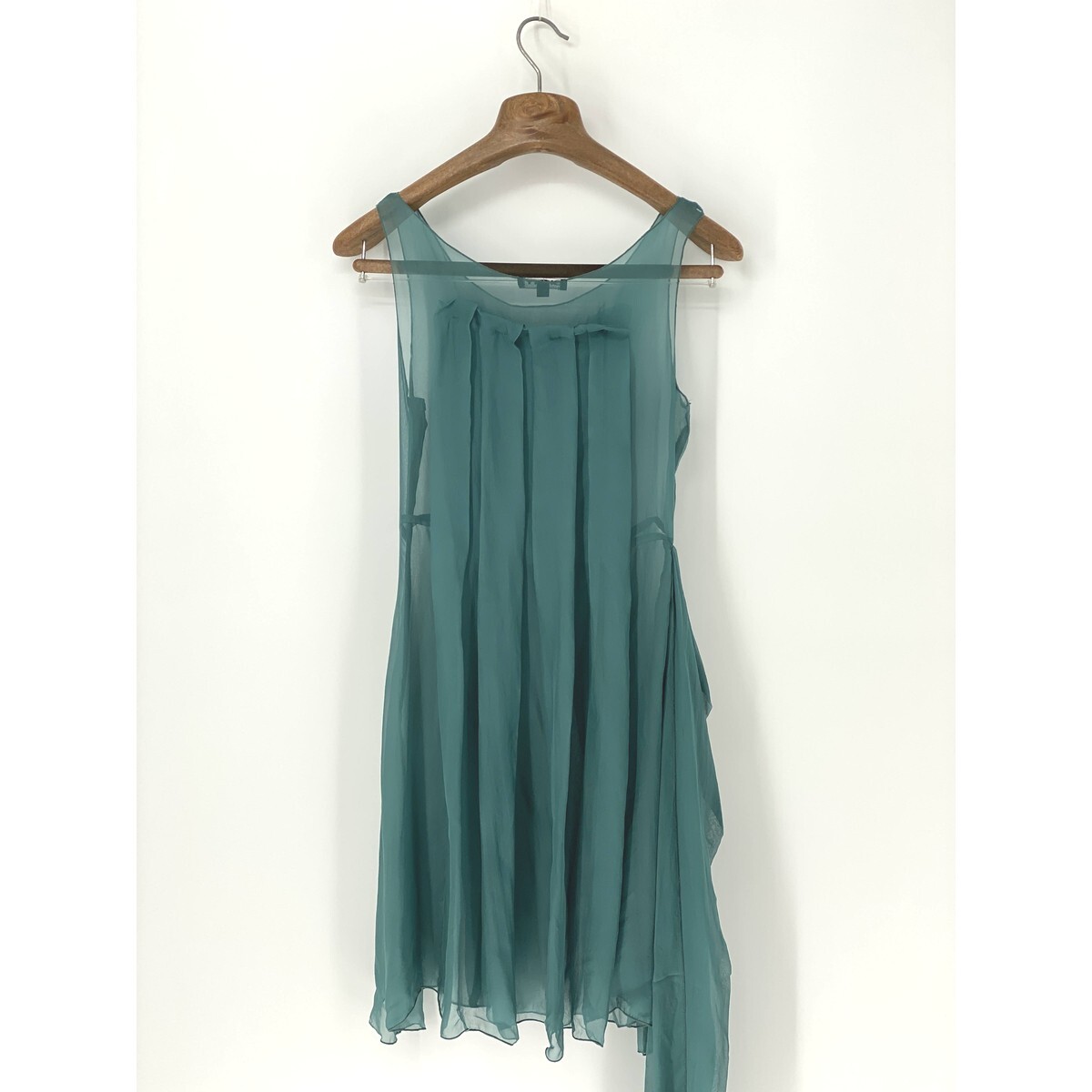 A8572/美品 春夏 DKNY DONNA KARAN ダナ・キャラン シルク ノースリーブ プリーツ ベルト レース 膝丈 ワンピース 4 M程 L程 緑 レディース