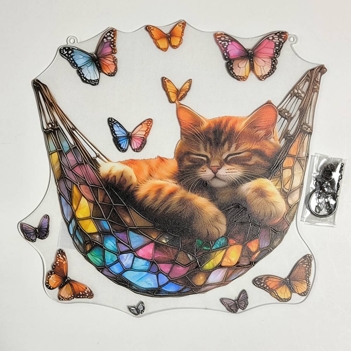 【ハンモックで寝る猫・色々な蝶々 カラフル】アクリルプレート 飾り サンキャッチャー チェーン付き オブジェ お洒落 壁や窓辺の飾りに◎◎