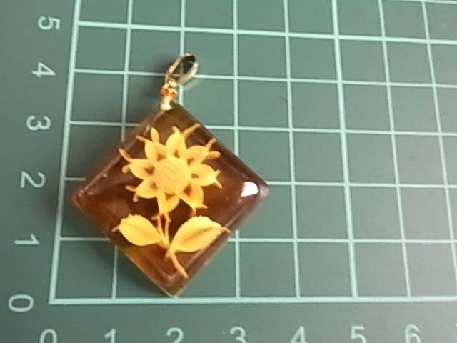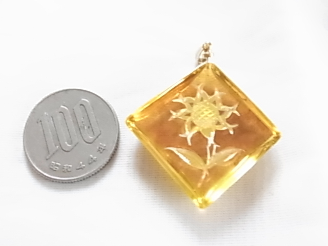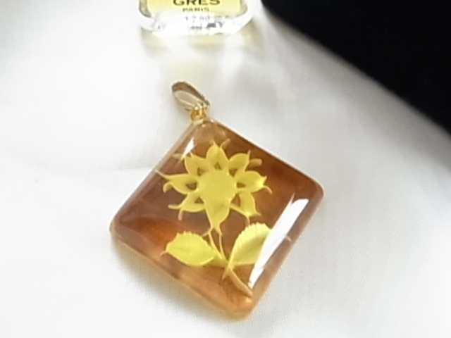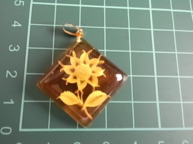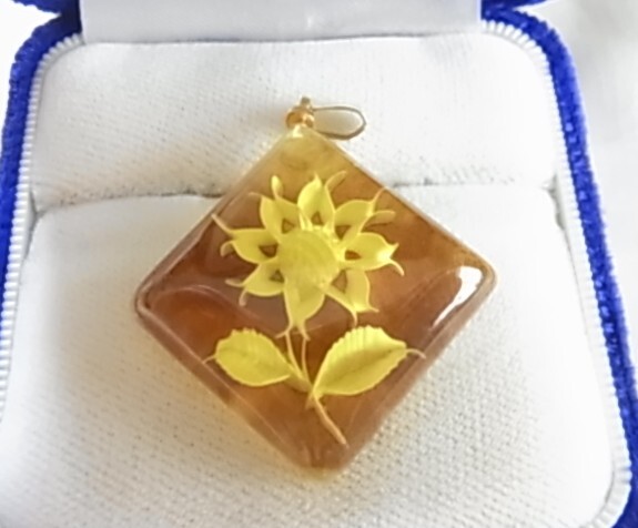 ビンテージ/ヴィンテージ アンバー?琥珀?の中に向日葵モチーフのお花が水中花の様なデザイン フラワー ペンダントトップ♪♪