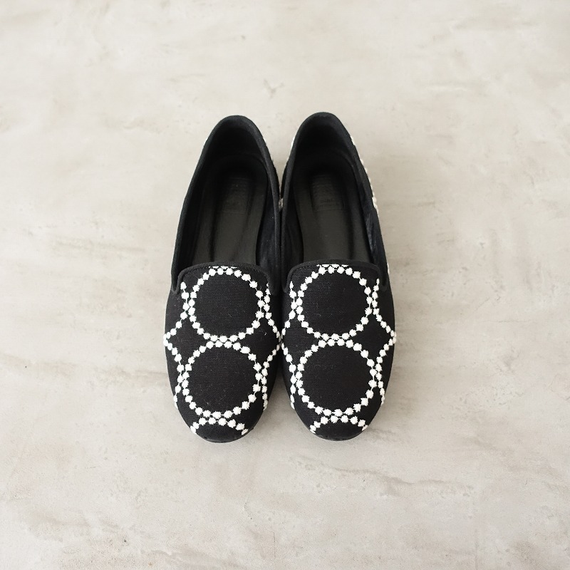 mina perhonenのtambourine スリッポンシューズです。カラーは黒ベースにオフホワイトでtambourineのテキスタイル刺しゅうが施されたデザインで、履き口に人工皮革のパイピングが施されています。定価(メーカー希望小売価格)18,700円の商品です。 |
