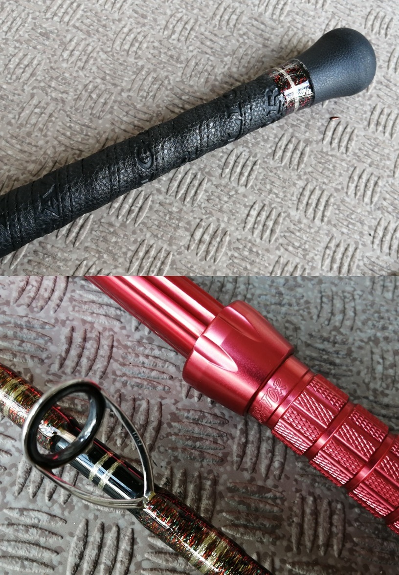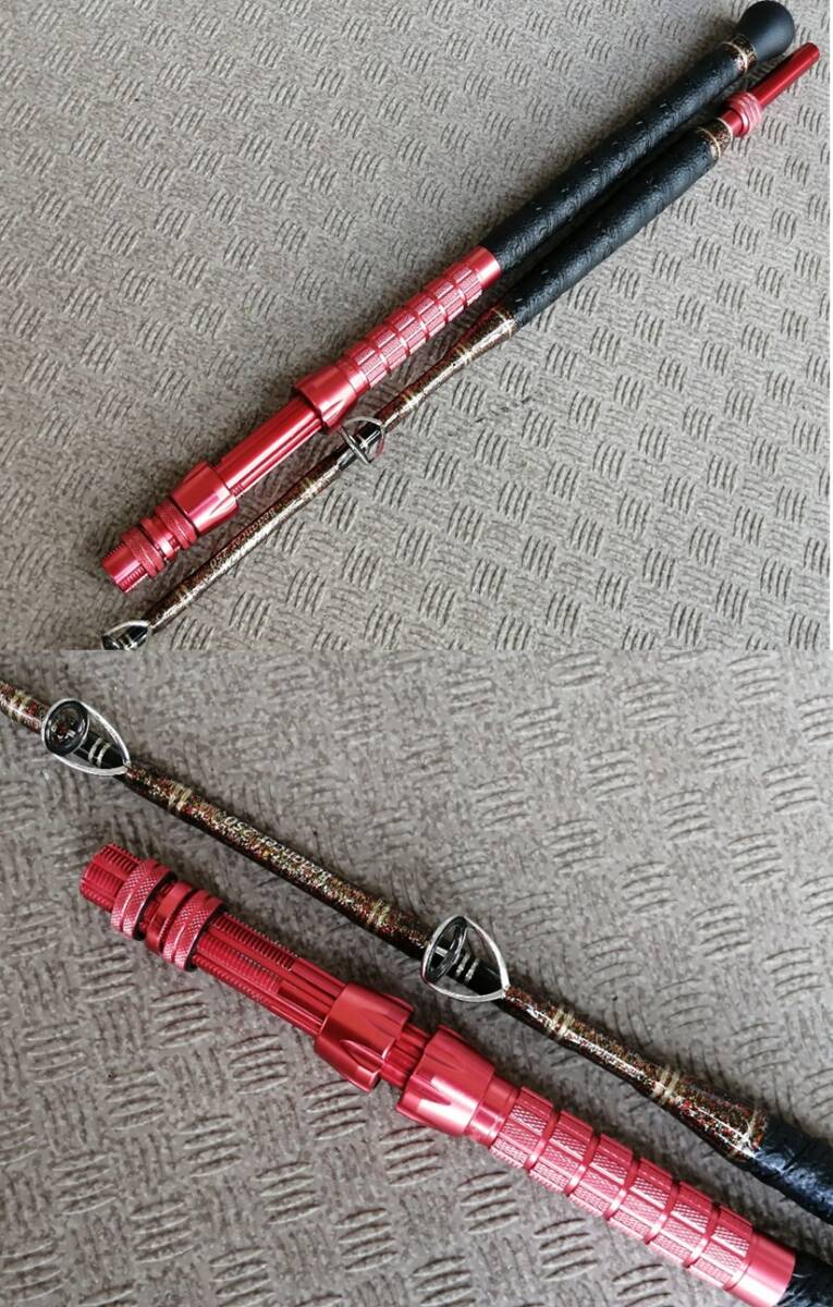 バットを取り付けた状態で、全長の実測値が約256cm(竿尻に装着されたゴムの先端までの長さ)となりますので、最初のオーナー様がロングバット仕様で制作されたものかと思われます。オプションでバットが脱着できる仕様となっており、巻物ツーピースバット(恐らくロングバット仕様)仕様となっております。バットを外した状態の仕舞い寸法は約216cmとなります。