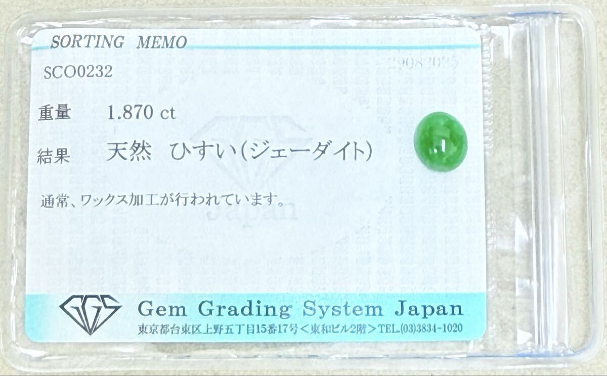白い内包物が少し見られますが、天然のひすいの証拠です。