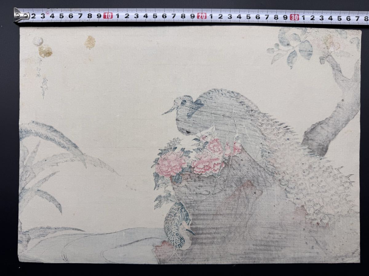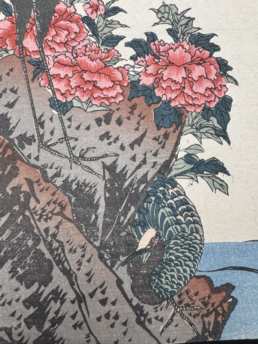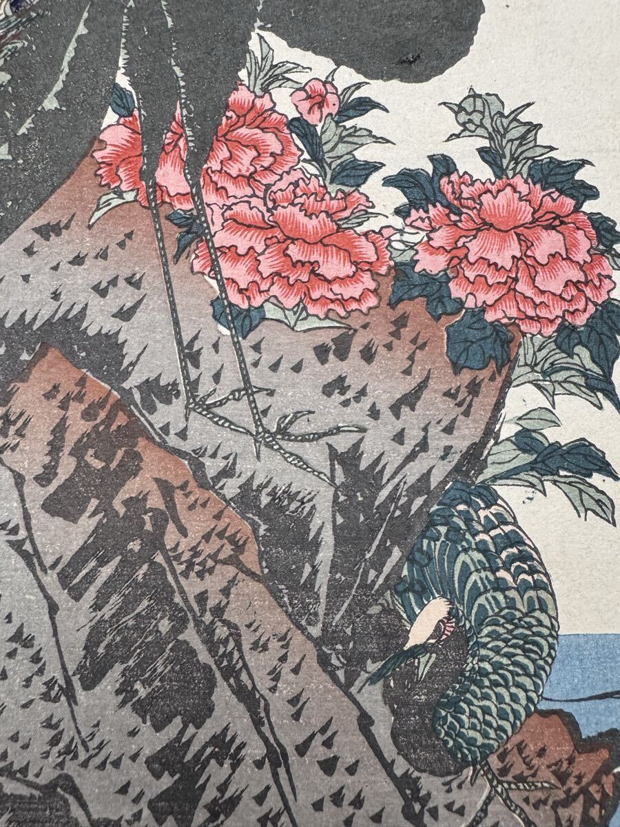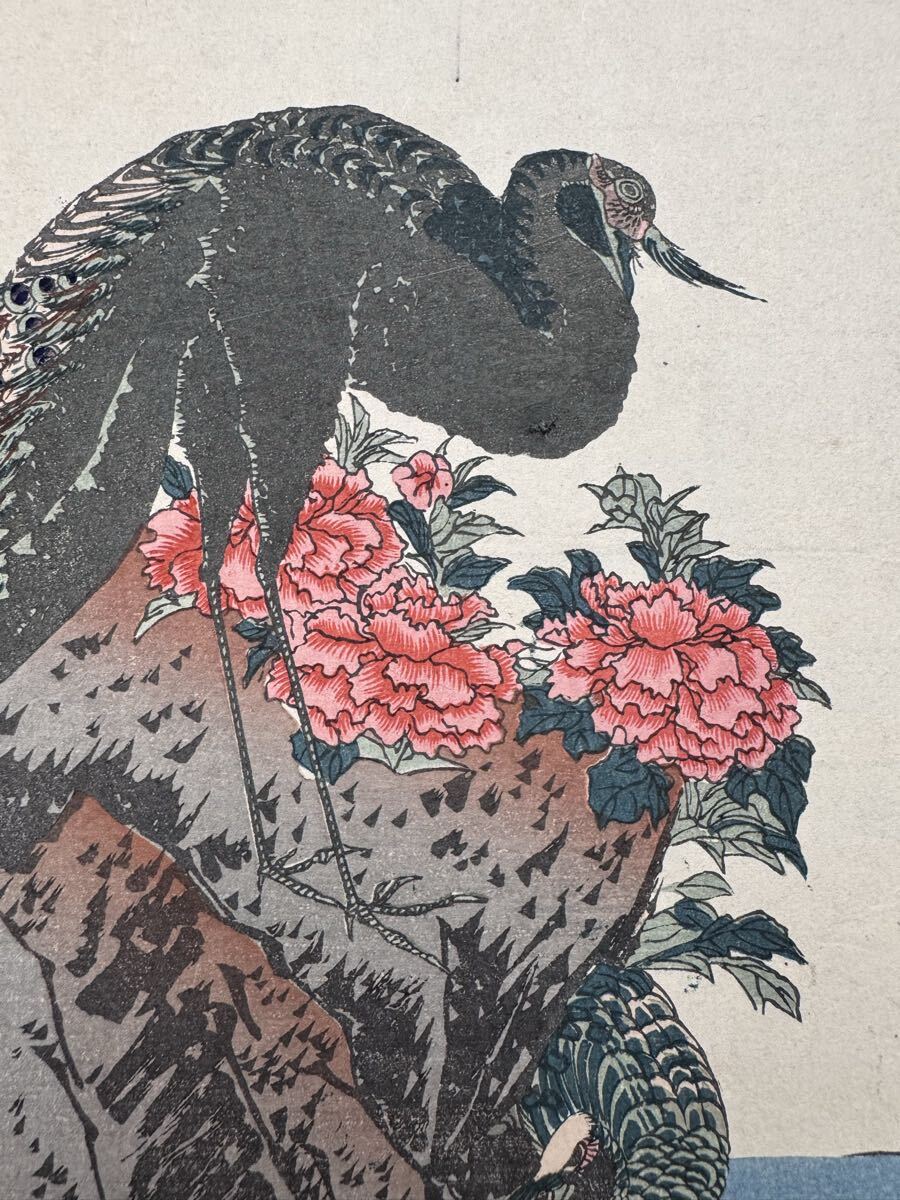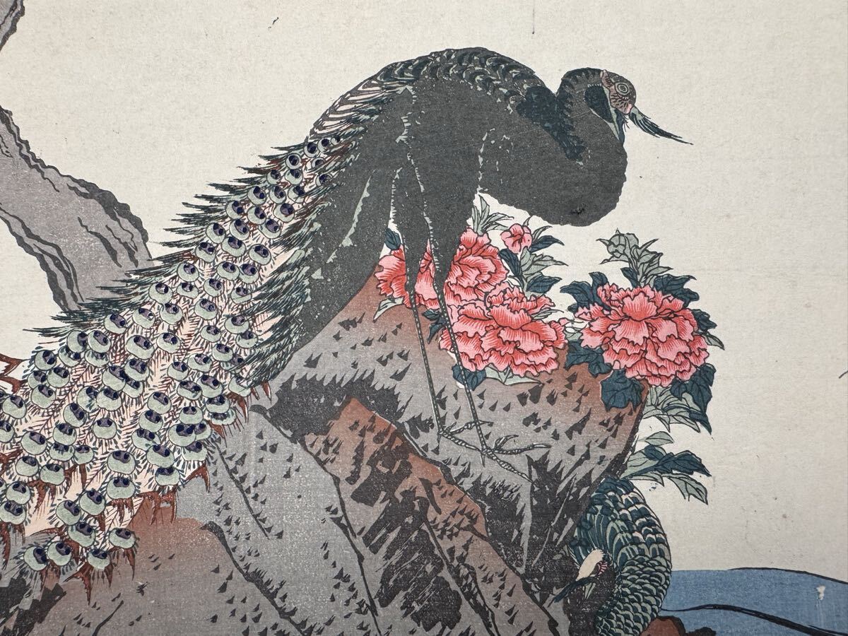 【真作】江戸期 本物浮世絵木版画 葛飾北斎「二孔雀と牡丹」花鳥図 大判 錦絵 保存良い