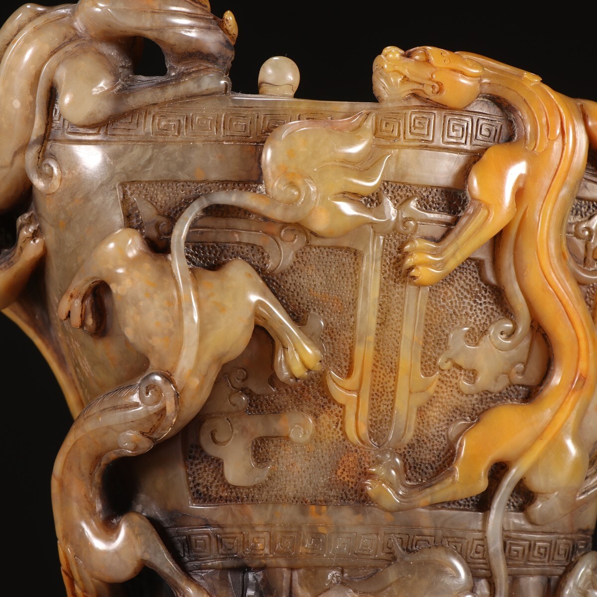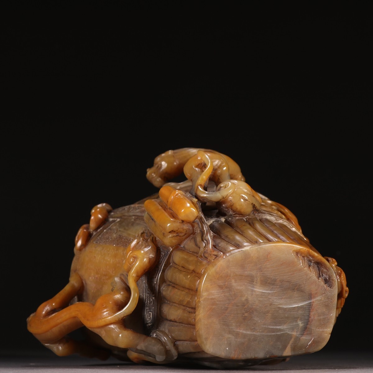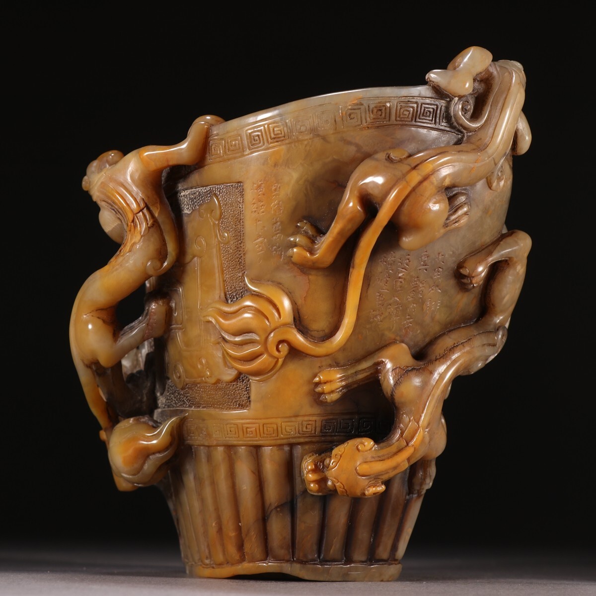 「清時代 老寿山石 田黄石彫り 魑龍紋 杯」極細工 擺件 古賞物 中国古美術 旧蔵出