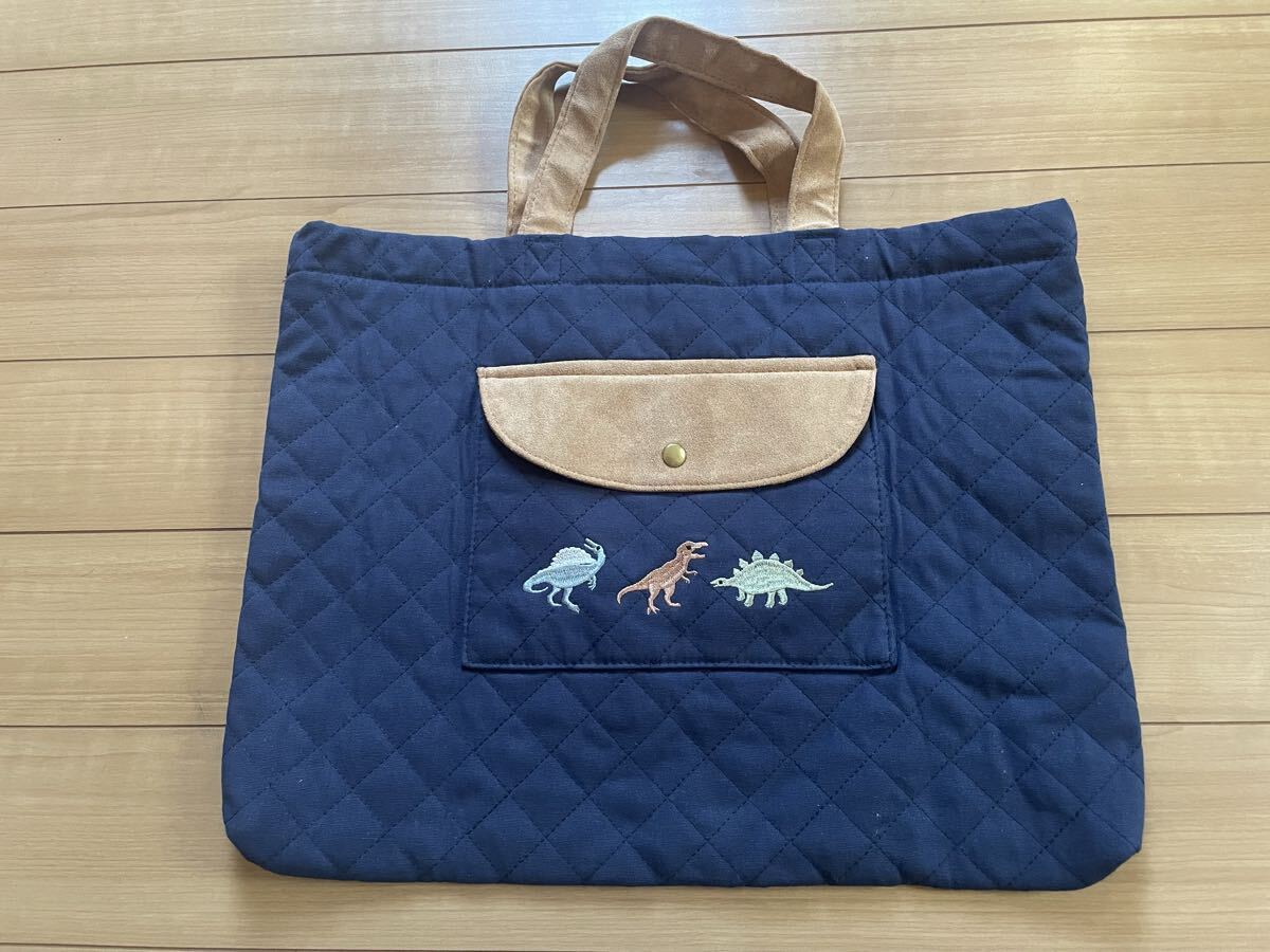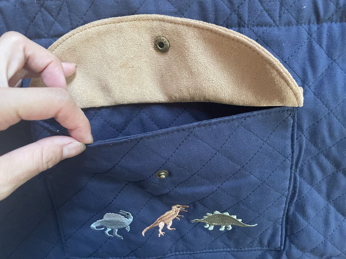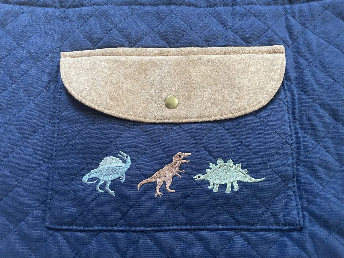 しっかりしたつくりで、キルティング素材に恐竜の刺繍がおしゃれですよ★