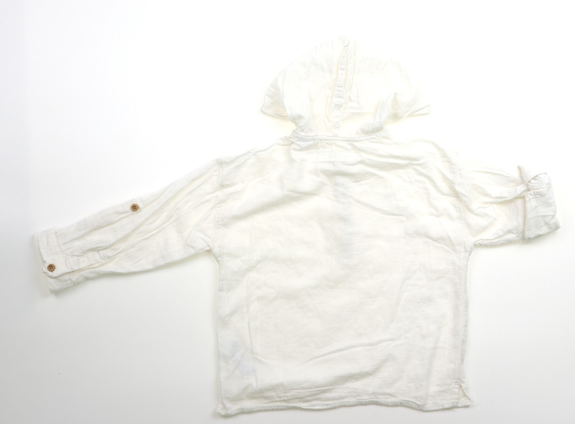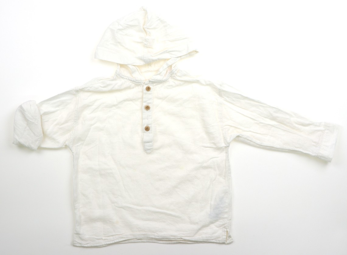 実際のサイズ表記は98cm。コットン、リネン生地。袖をロールアップできます。袖と前身ごろに茶色いシミあり。洗いざらし感がありますが、まだまだ普段着として活躍してくれそうです。